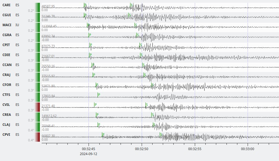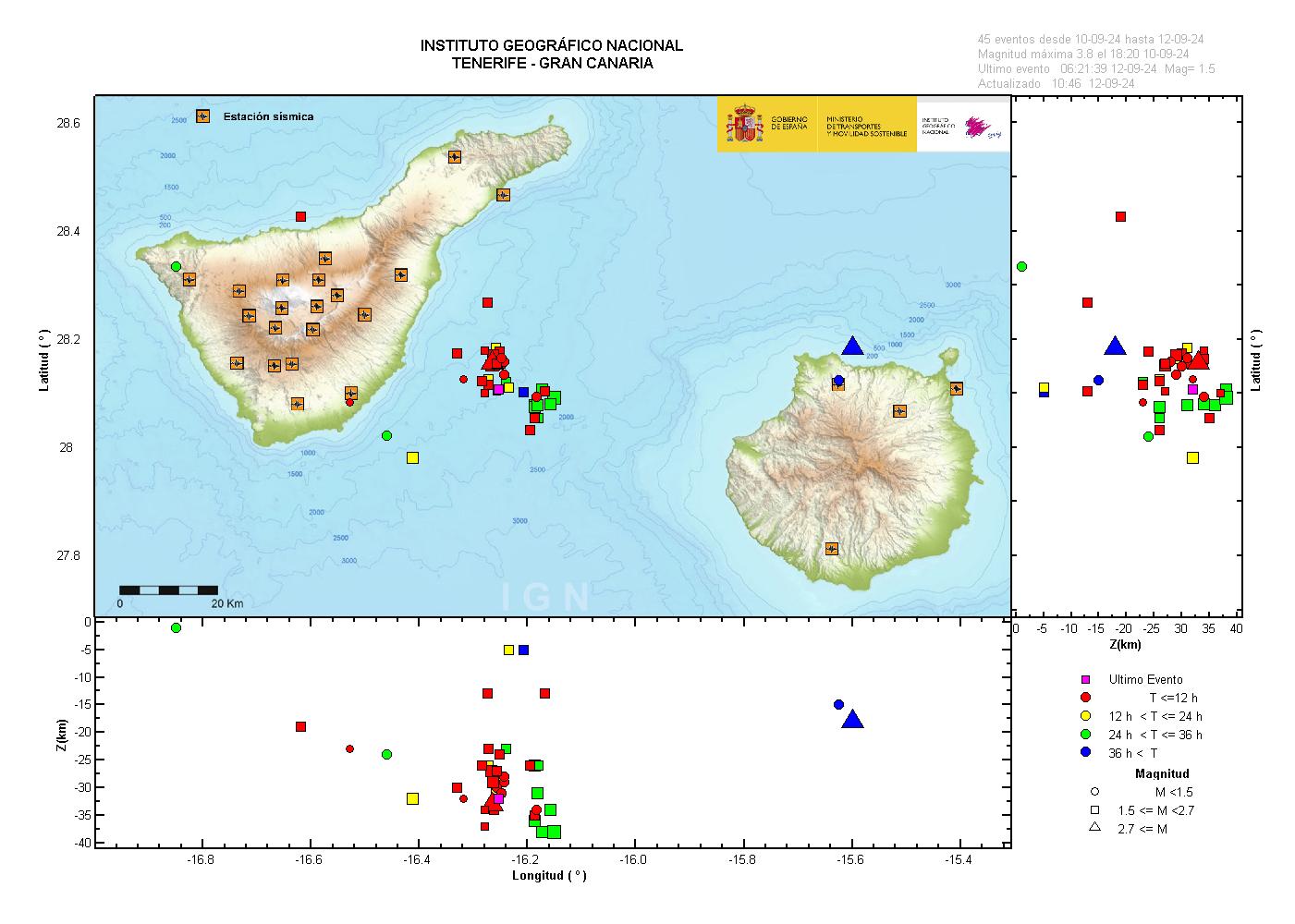 Durante la tarde y noche del día de ayer y la madrugada del día de hoy (12 de septiembre de 2024) ha continuado la actividad sísmica entre las islas de Gran Canaria y Tenerife. Hasta este momento se han podido localizar 35 terremotos desde el comienzo de la serie, el mayor de los cuales ha ocurrido a las 00:32h (UTC) y ha alcanzado una magnitud de 3.6 (mbLg). Las profundidades de los sismos continúan mayoritariamente superiores a 25 km; sin embargo, los terremotos de mayor magnitud durante la madrugada del día de hoy están situados unos 8km al NW de los del comienzo de la serie.