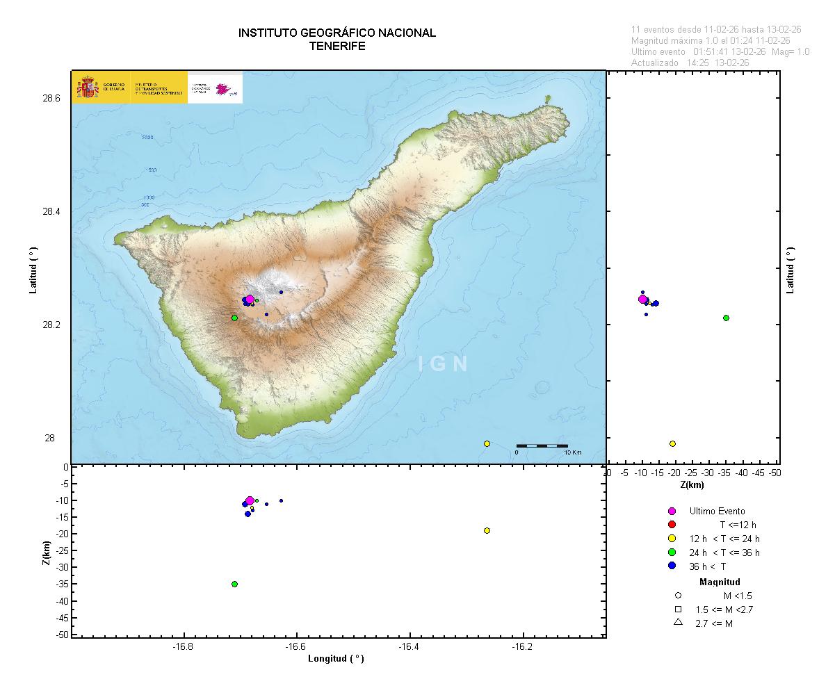Desde la tarde del 12 de febrero, la Red Sísmica Nacional del IGN ha detectado un nuevo enjambre sísmico en la isla de Tenerife. Se han identificado 876 eventos sísmicos de muy baja magnitud, siendo la máxima de 0,7 mbLg, lo que hace que sea un enjambre de muy baja energía. Debido a su baja magnitud, no es posible localizar todos los eventos sísmicos de forma individual. No obstante, el análisis conjunto de la serie indica que se ha producido en la zona oeste de Las Cañadas del Teide, un área donde ya se han registrado enjambres sísmicos de características similares en octubre de 2016, junio de 2019, junio y julio de 2022, noviembre de 2024 y agosto de 2025. La profundidad estimada de esta serie es de unos 8 km por debajo del nivel del mar, coherente también con la de episodios anteriores.