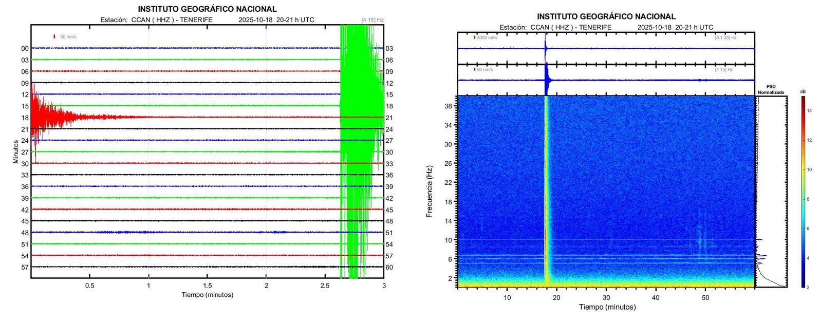 Continúa la actividad sísmica en la costa de Fasnia/Arico. Desde el 16 de octubre a las 22:26 UTC hasta ahora se detecta actividad sísmica cerca de la costa de Fasnia y Arico a una profundidad media de 25 km. Se han detectado unos 55 terremotos de los que se han podido localizar 30. Estos terremotos presentan una magnitud de entre 0.8 y 2.6 mbLg. Desde el IGN se está haciendo seguimiento de la evolución de esta actividad. Además, el sábado 18 de octubre se produjo un terremoto de magnitud 3.4 más alejado de la costa y a una profundidad de 29 km que fue sentido levemente por la población.