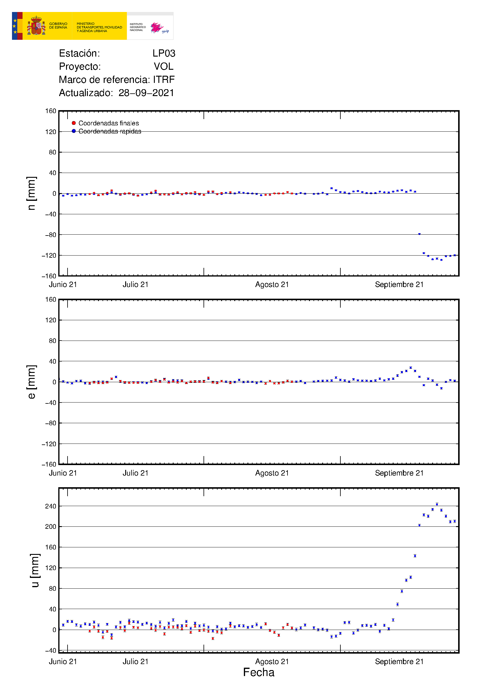 La red de estaciones permanentes GNSS de la isla muestra una leve deflación en la vertical de LP03 y en menor medida en la de LP04. Estos resultados son compatibles con los obtenidos mediante InSAR en los que no se aprecia una variación significativa entre las imágenes Sentinel1 de los días 20 y 26 de septiembre.