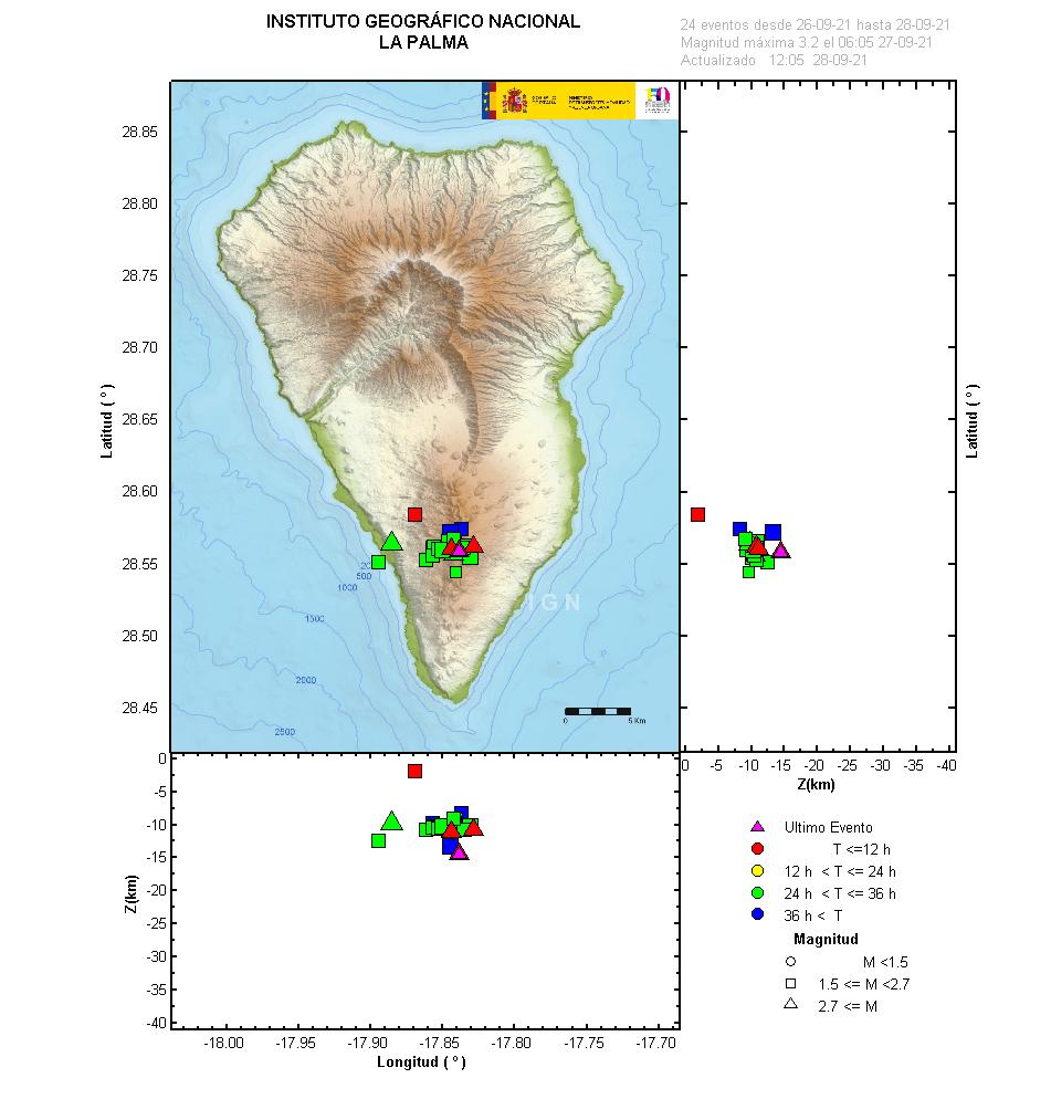 13-09-2021 08:00 UTC.Continua la actividad serie sísmica localizada en el sur de la isla de La PalmaDesde el inicio de la serie sísmica a las 3:18 (UTC) del día 11, hasta las 8:00 (UTC) del día de hoy, se han detectado 1570 terremotos en la zona sur de la isla de La Palma, de los cuales se han localizado un total de 354. La magnitud de los terremotos ha ido incrementándose en las últimas horas con un terremoto máximo de magnitud 3,4 mbLg que ha sido sentido por la población. La profundidad de los terremotos se mantiene entre 8 y 13 km. El IGN ha intensificado el seguimiento continuo de la actividad.