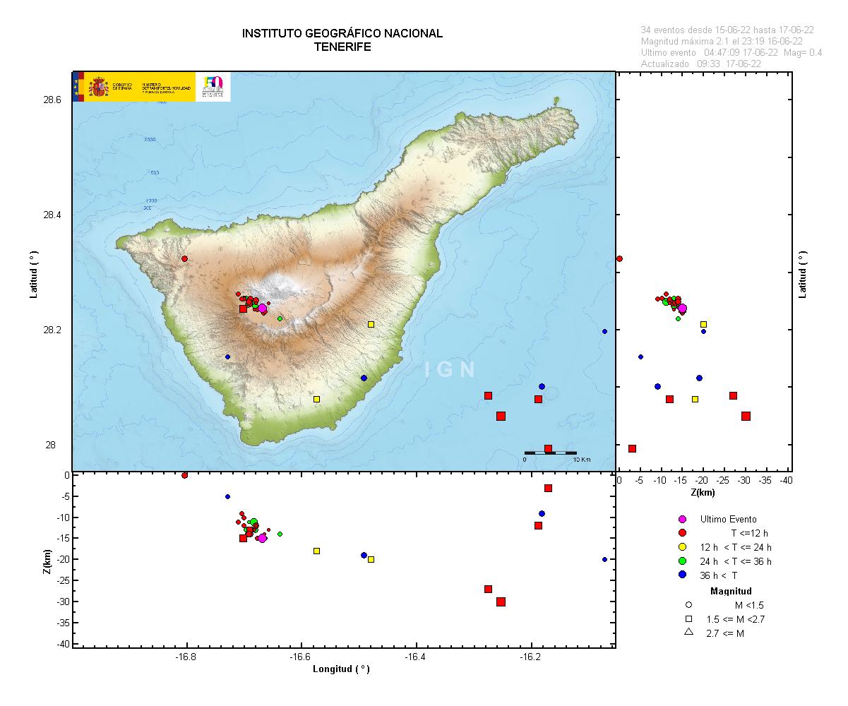 17-06-2022 10:00 UTCActividad microsísmica en Las Cañadas del Teide - TenerifeEn la madrugada del día de hoy 17 de junio, se ha producido una serie sísmica con epicentros localizados en las Cañadas del Teide, al suroeste de Pico Viejo, con un total de 458 terremotos detectados hasta este momento, de los cuales se han podido localizar los 13 eventos de mayor magnitud. También en el día de ayer se produjo sismicidad en la misma zona, con otros 5 terremotos localizados. La magnitud máxima es de 1,6 (mbLg) y la profundidad alrededor de los 13 km.