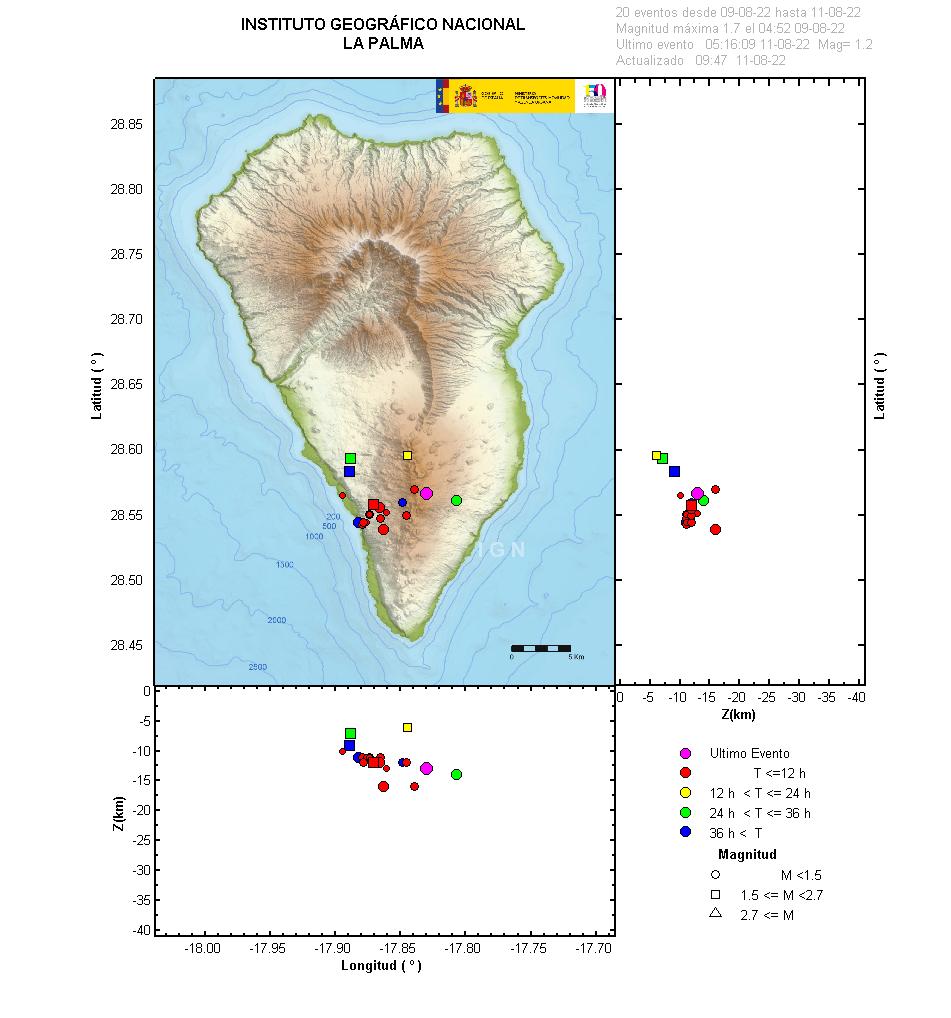11-08-2022 10:00 UTCEnjambre sísmico en la isla de La PalmaDesde las 23:00 (UTC) del día de ayer 10 de agosto, se ha detectado un pequeño enjambre sísmico de baja magnitud en la zona de la erupción del volcán Tajogaite, en la isla de La Palma. Se han localizado hasta este momento un total de 15 terremotos, siendo el de mayor magnitud el localizado a las 02:48 (UTC) con una magnitud de 1,7 mbLg y a 12 km de profundidad. Hasta las 4:00 (UTC) se han detectado 63 terremotos.