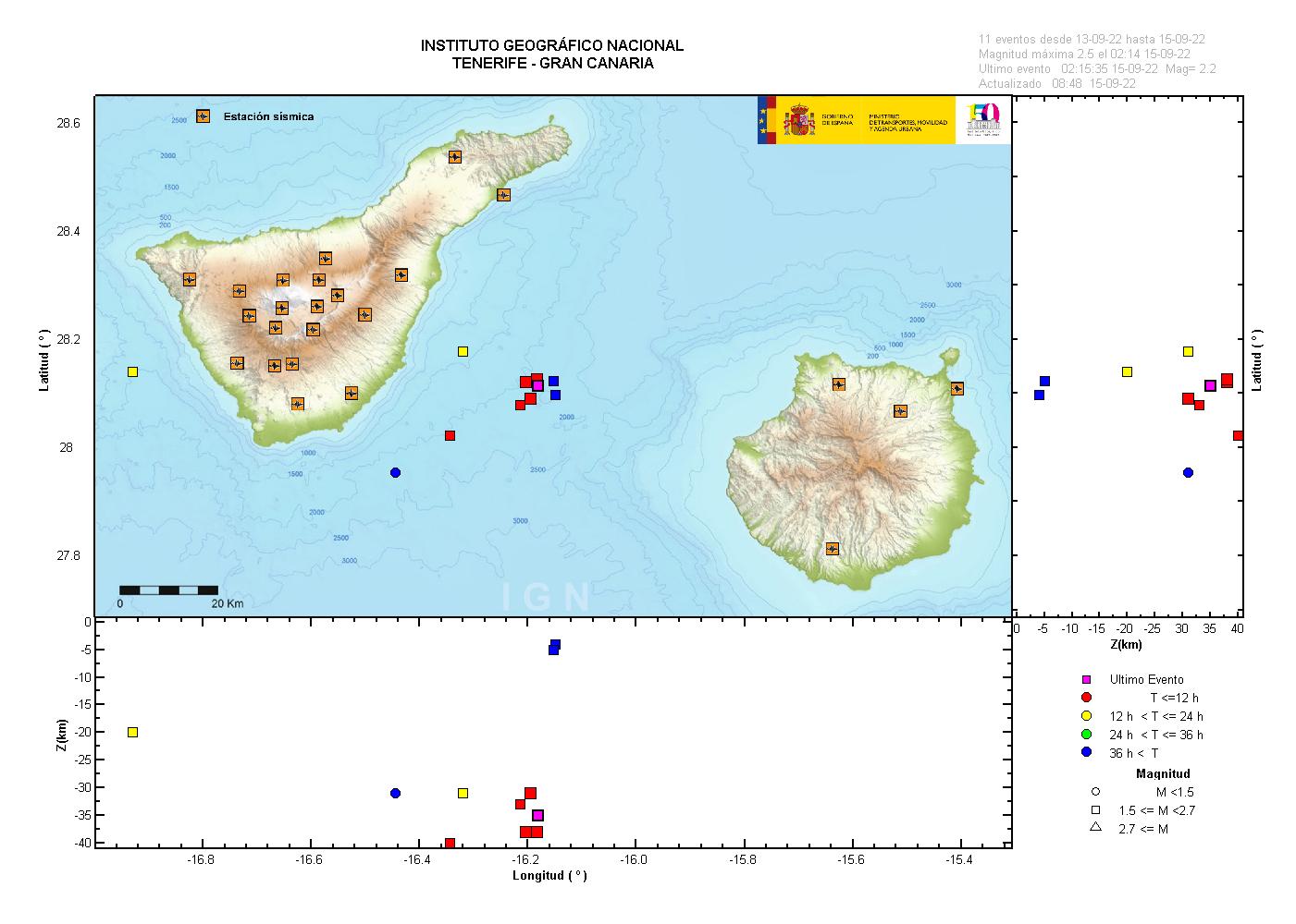 15-09-2022 11:00 UTCEnjambre sísmico entre Gran Canaria y TenerifeEn la madrugada del día de hoy, 15 de Septiembre de 2022, se ha producido una pequeña serie sísmica entre las islas de Gran Canaria y Tenerife entre las 02:08 y las 02:16 (UTC). Se han podido localizar un total de 8 terremotos de baja magnitud, todos ellos con profundidades superiores a 20km. La magnitud máxima de la serie es 2.6 (mbLg) y corresponde a un terremoto a 32km de profundidad.