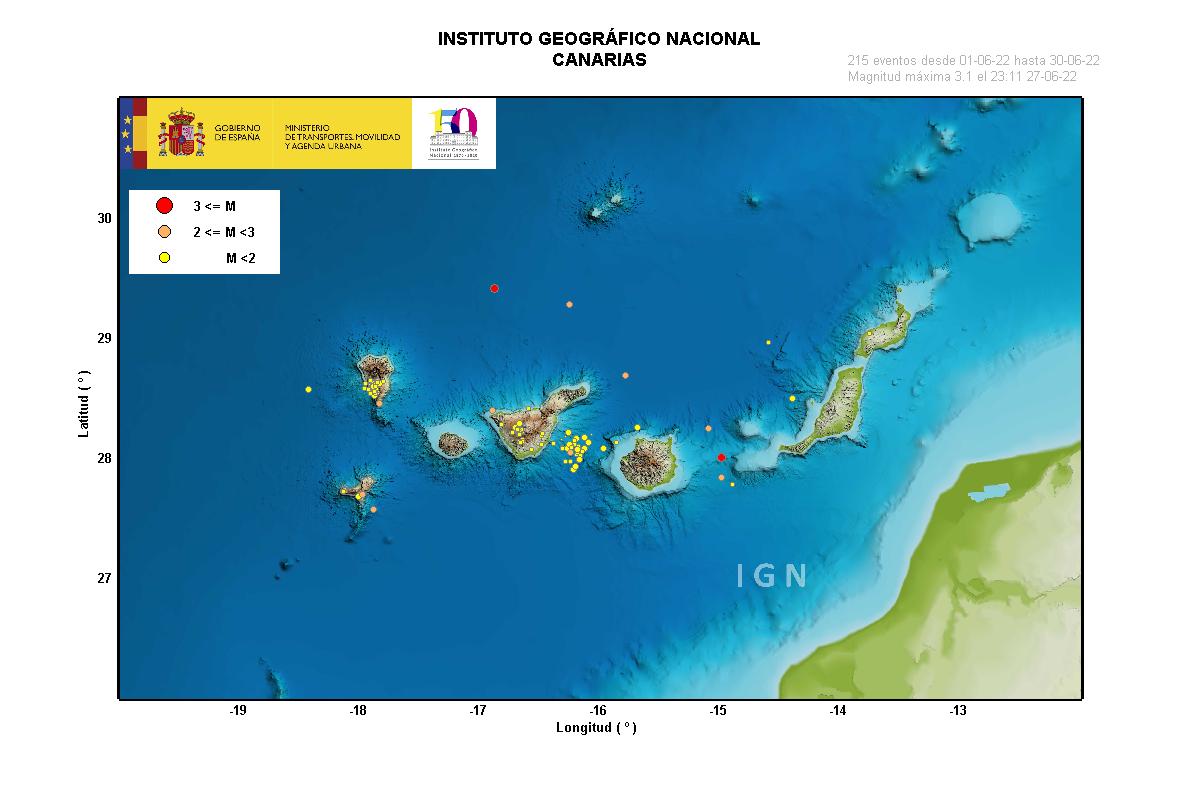 A lo largo del mes de junio se ha localizado un total de 217 terremotos en el área de las Islas Canarias, con una magnitud máxima de 3,6 (mb) en el terremoto del día 5 a las 03:47 (UTC), con epicentro a unos 200 km al norte de la isla de La Graciosa.
