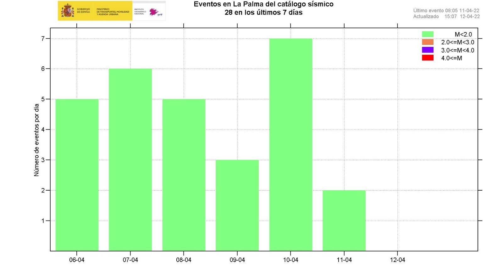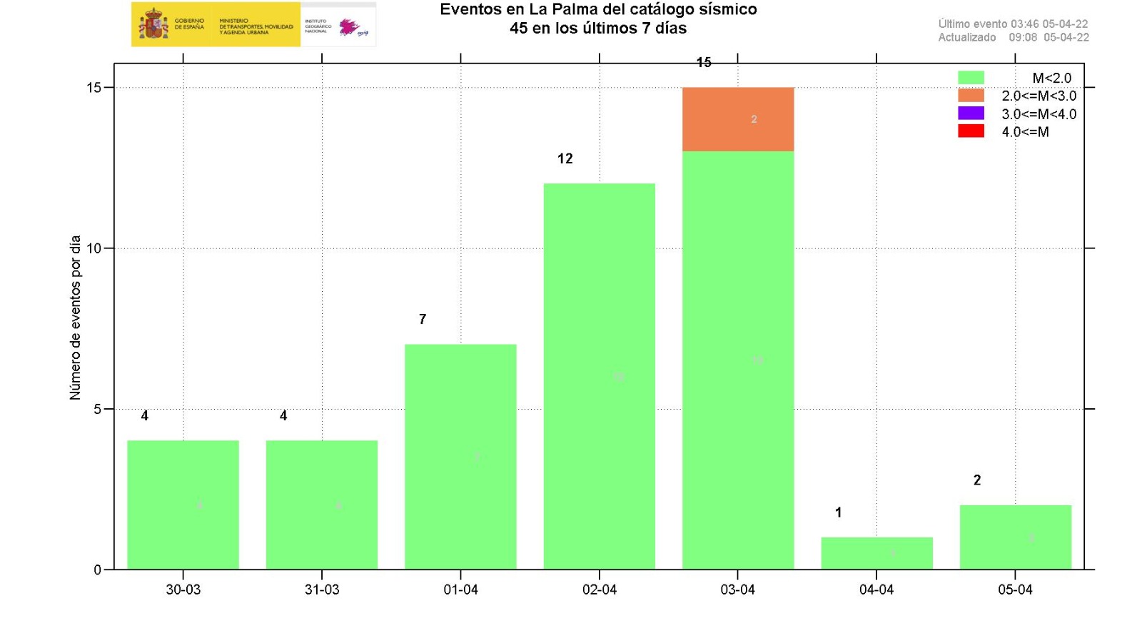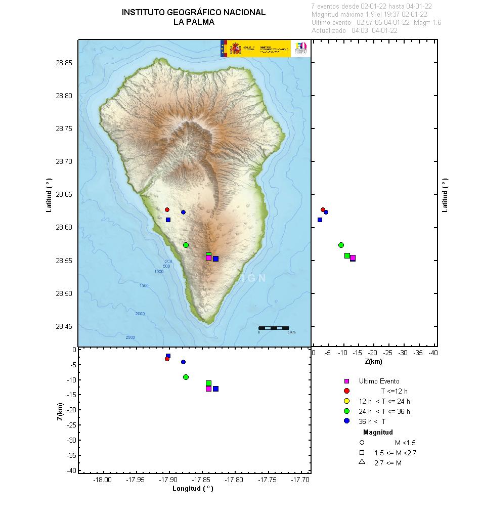 05-04-2022 09:00 UTCActividad post-eruptiva Cumbre Vieja, La PalmaDurante los últimos 7 días, desde el último comunicado (día 29 de marzo a las 9:00 UTC), se han localizado 49 terremotos en la isla de La Palma. Las magnitudes se encuentran entre 0,6 y 2,5 (mbLg). Dos de estos terremotos han sido débilmente sentidos por la población, con intensidad máxima de II (EMS98). La localización de los hipocentros continúa bajo la zona central de Cumbre Vieja, en las mismas zonas que en semanas anteriores, a profundidades entre 0 y 17 km. Tres terremotos se han localizado en este periodo a profundidad mayor de 20 km.
