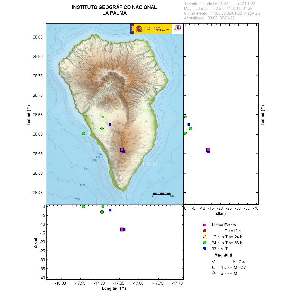 Desde el último comunicado (día 4 a las 9:00 UTC), se han localizado 9 terremotos en la isla de La Palma, ninguno de ellos ha sido sentido por la población. Las magnitudes se encuentran entre 0,8 y 2,2 (mbLg). La localización de los hipocentros continúa bajo la zona central de Cumbre Vieja en las mismas zonas que en días anteriores. Se han localizado 3 terremotos a profundidades entre 10 y 13 km y 6 a profundidad menor de 5 km. No se han localizado terremotos a profundidad mayor de 13 km.