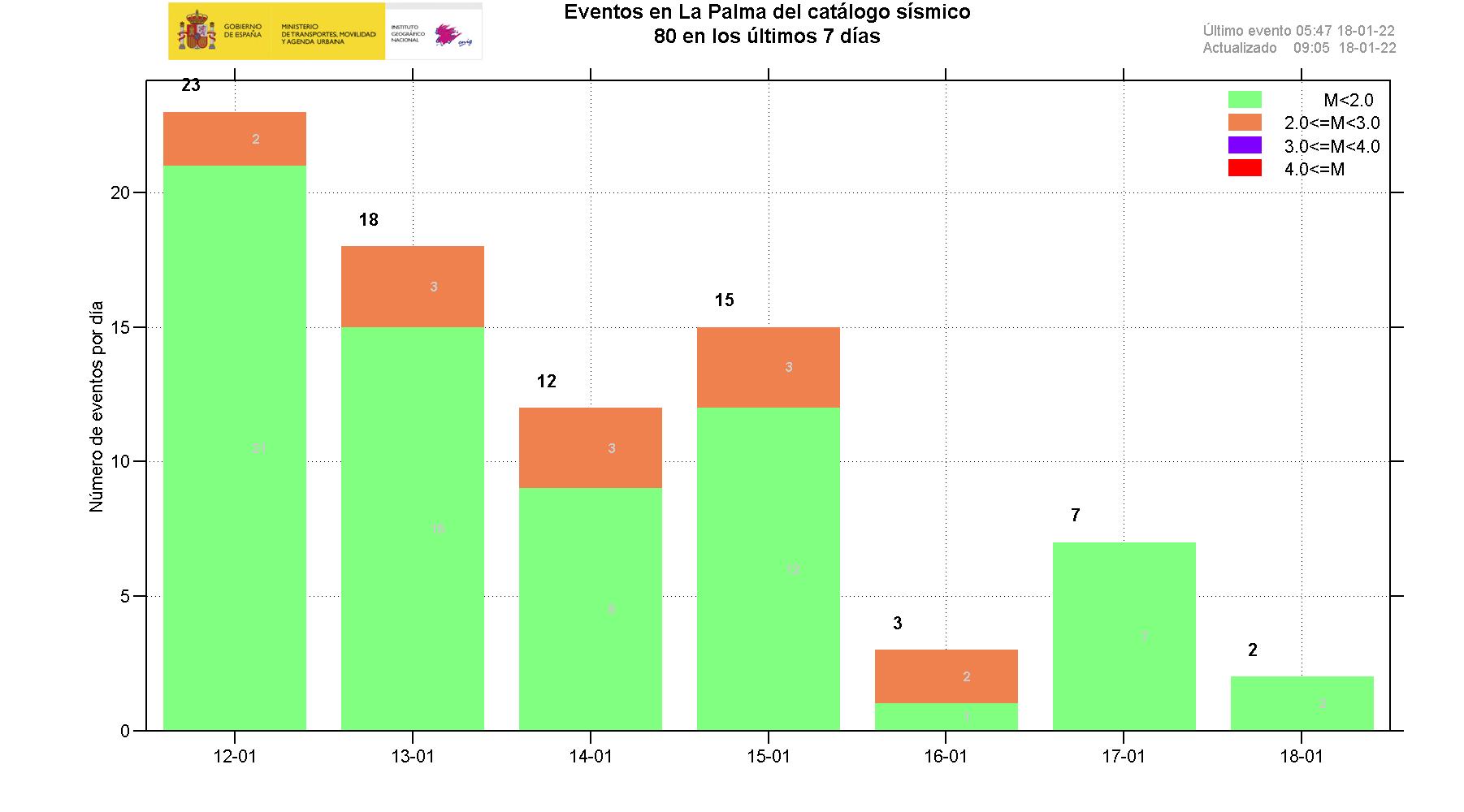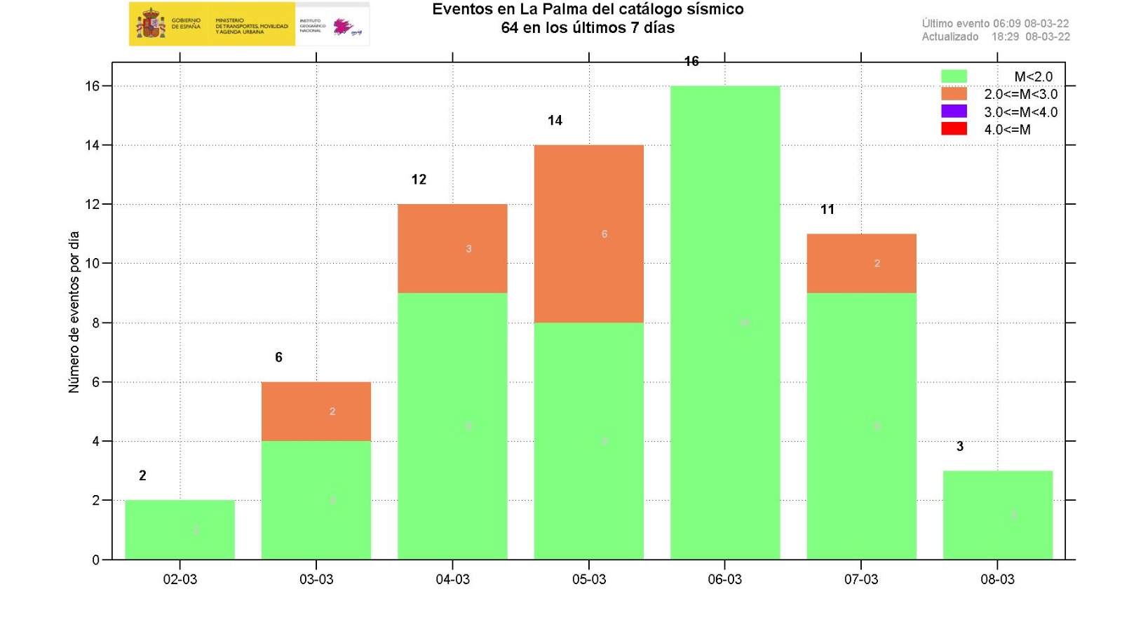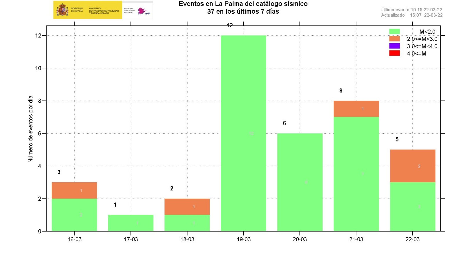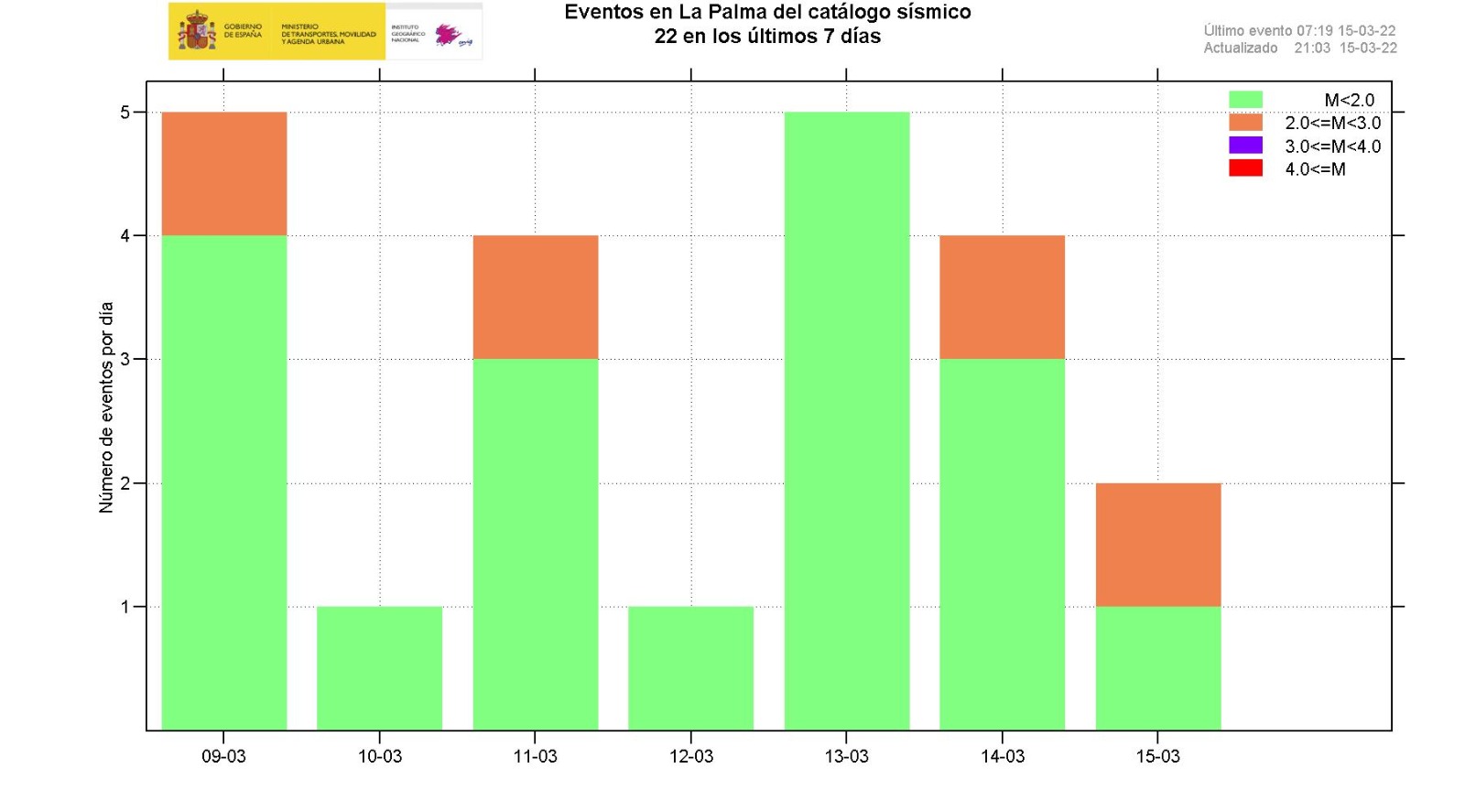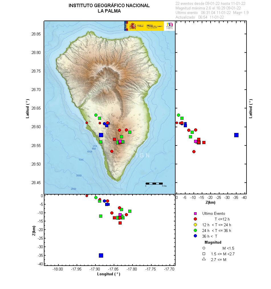 22-03-2022 09:00 UTCActividad post-eruptiva Cumbre Vieja, La PalmaDurante los últimos 7 días, desde el último comunicado (día 15 de marzo a las 9:00 UTC), se han localizado 40 terremotos en la isla de La Palma. Las magnitudes se encuentran entre 0,4 y 2,3 (mbLg). Uno de estos terremotos ha sido débilmente sentido por la población, con intensidad máxima de II (EMS98). La localización de los hipocentros continúa bajo la zona central de Cumbre Vieja, en las mismas zonas que en semanas anteriores, a profundidades entre 0 y 16 km. Solamente dos terremotos se han localizado en este periodo a profundidad mayor de 20 km.