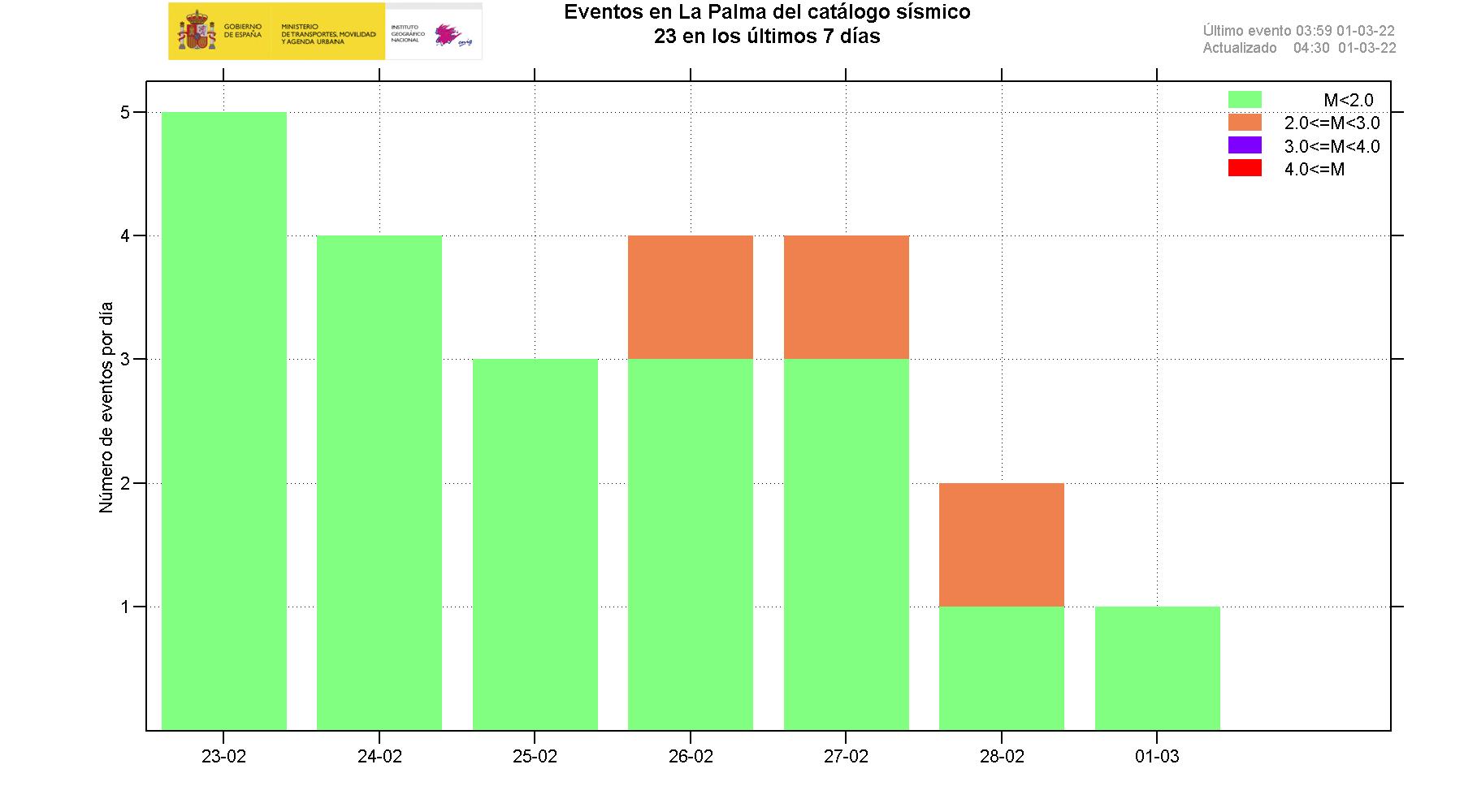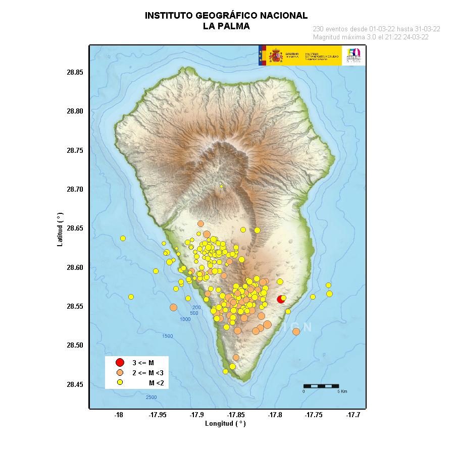 01-03-2022 09:00 UTCActividad post-eruptiva Cumbre Vieja, La PalmaDurante los últimos 7 días, desde el último comunicado (día 22 de febrero a las 9:00 UTC), se han localizado 24 terremotos en la isla de La Palma. Las magnitudes se encuentran entre 0,7 y 2,5 (mbLg). Dos de estos terremotos han sido ligeramente sentidos por la población, con intensidad máxima de II-III (EMS98). La localización de los hipocentros continúa bajo la zona central de Cumbre Vieja, en las mismas zonas que en días anteriores, a profundidades entre 0 y 17 km. Solamente un terremoto en este periodo, de magnitud 2,5 (mbLg), se ha localizado a mayor profundidad (34 km).