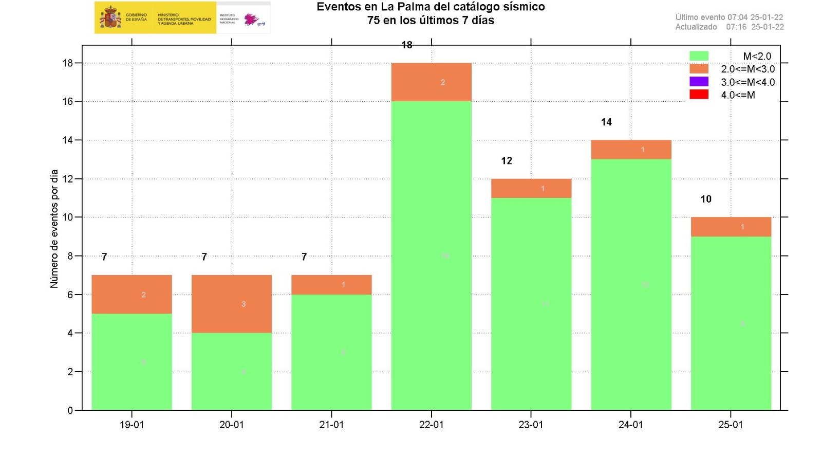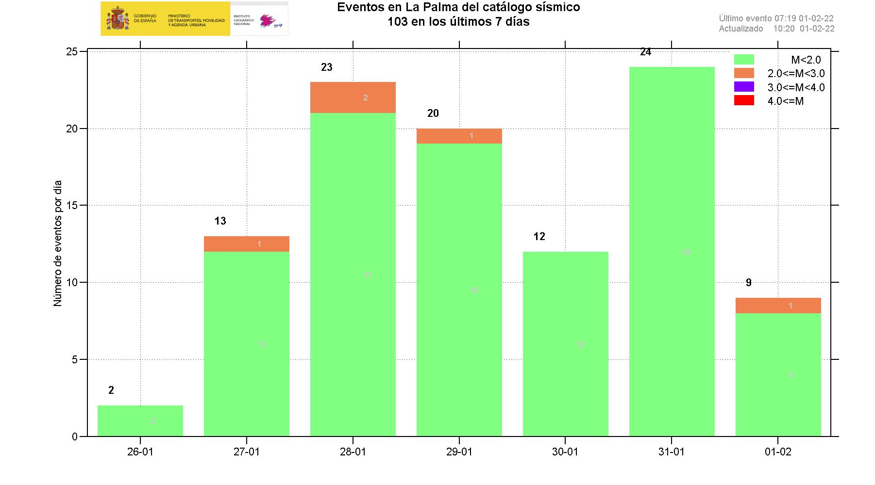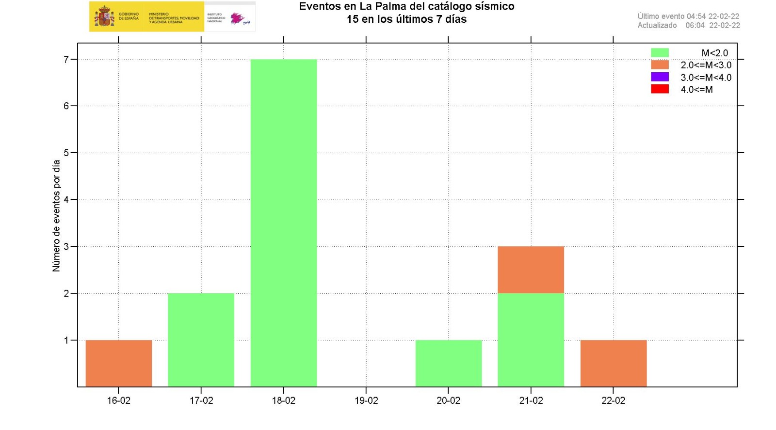 22-02-2022 09:00 UTCActividad post-eruptiva Cumbre Vieja, La PalmaDurante los últimos 7 días, desde el último comunicado (día 15 a las 9:00 UTC), se han localizado 17 terremotos en la isla de La Palma. Las magnitudes se encuentran entre 0,8 y 2,4 (mbLg). Ninguno de los terremotos localizados en este periodo ha sido sentido por la población.