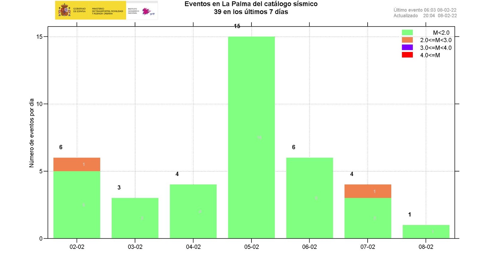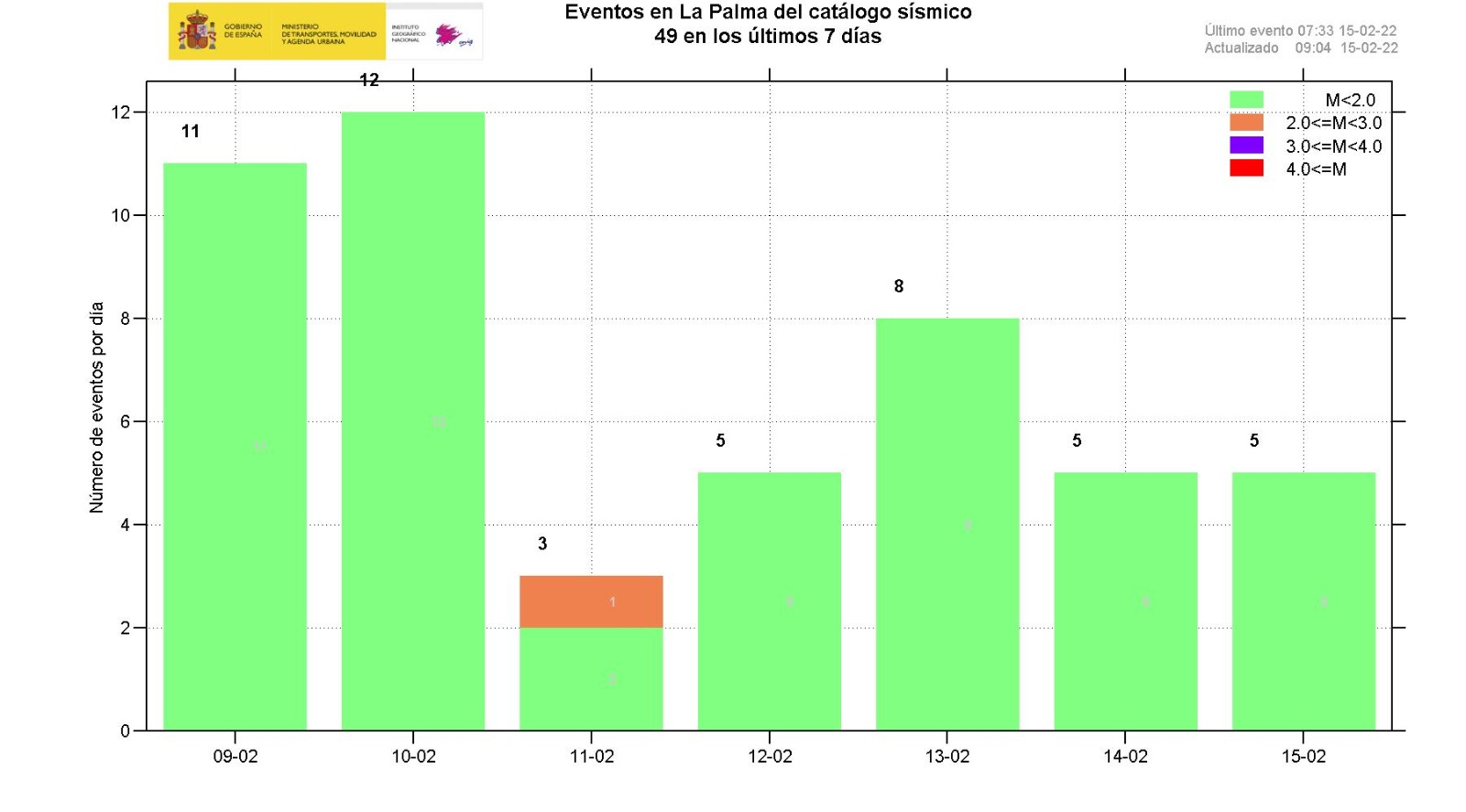 15-02-2022 09:00 UTCActividad post-eruptiva Cumbre Vieja, La PalmaDurante los últimos 7 días, desde el último comunicado (día 8 a las 9:00 UTC), se han localizado 59 terremotos en la isla de La Palma. Las magnitudes se encuentran entre 0,2 y 2,0 (mbLg). Ninguno de los terremotos localizados en este periodo ha sido sentido por la población. La localización de los hipocentros continúa bajo la zona central de Cumbre Vieja, en las mismas zonas que en días anteriores, a profundidades entre 0 y 16 km. No se han localizado en este periodo terremotos a mayor profundidad.