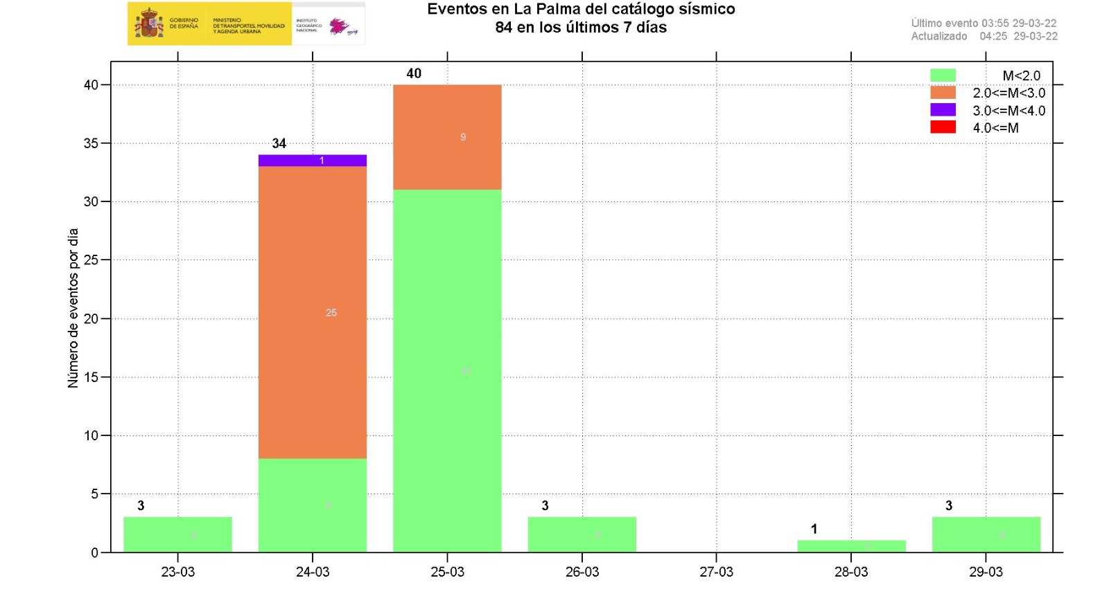 29-03-2022 09:00 UTCActividad post-eruptiva Cumbre Vieja, La PalmaDurante los últimos 7 días, desde el último comunicado (día 22 de marzo a las 9:00 UTC), se han localizado 87 terremotos en la isla de La Palma. Las magnitudes se encuentran entre 0,6 y 3,0 (mbLg). Siete de estos terremotos han sido débilmente sentidos por la población, con intensidad máxima de II (EMS98). Durante los días 24 y 25 se han detectado unos 500 eventos de naturaleza sismo-volcánica en la zona, de los cuales 73 han sido localizados a profundidades entorno a los 10 km, La localización de los hipocentros continúa bajo la zona central de Cumbre Vieja, en las mismas zonas que en semanas anteriores, a profundidades entre 0 y 16 km. Se ha localizado cuatro terremotos a mayor profundidad, en el entorno de 30 km.