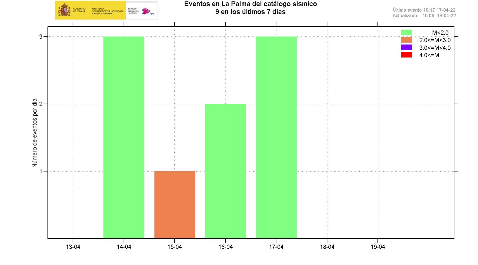 19-04-2022 09:00 UTCActividad post-eruptiva Cumbre Vieja, La PalmaDurante los últimos 7 días, desde el último comunicado (día 12 de abril a las 9:00 UTC), se han localizado 11 terremotos en la isla de La Palma. Las magnitudes se encuentran entre 0,5 y 2,0 (mbLg). Ninguno de los terremotos de este periodo ha sido sentido por la población. La localización de los hipocentros continúa bajo la zona central de Cumbre Vieja, en las mismas zonas que en semanas anteriores, a profundidades entre 0 y 20 km. No se ha localizado ningún terremoto a mayor profundidad.