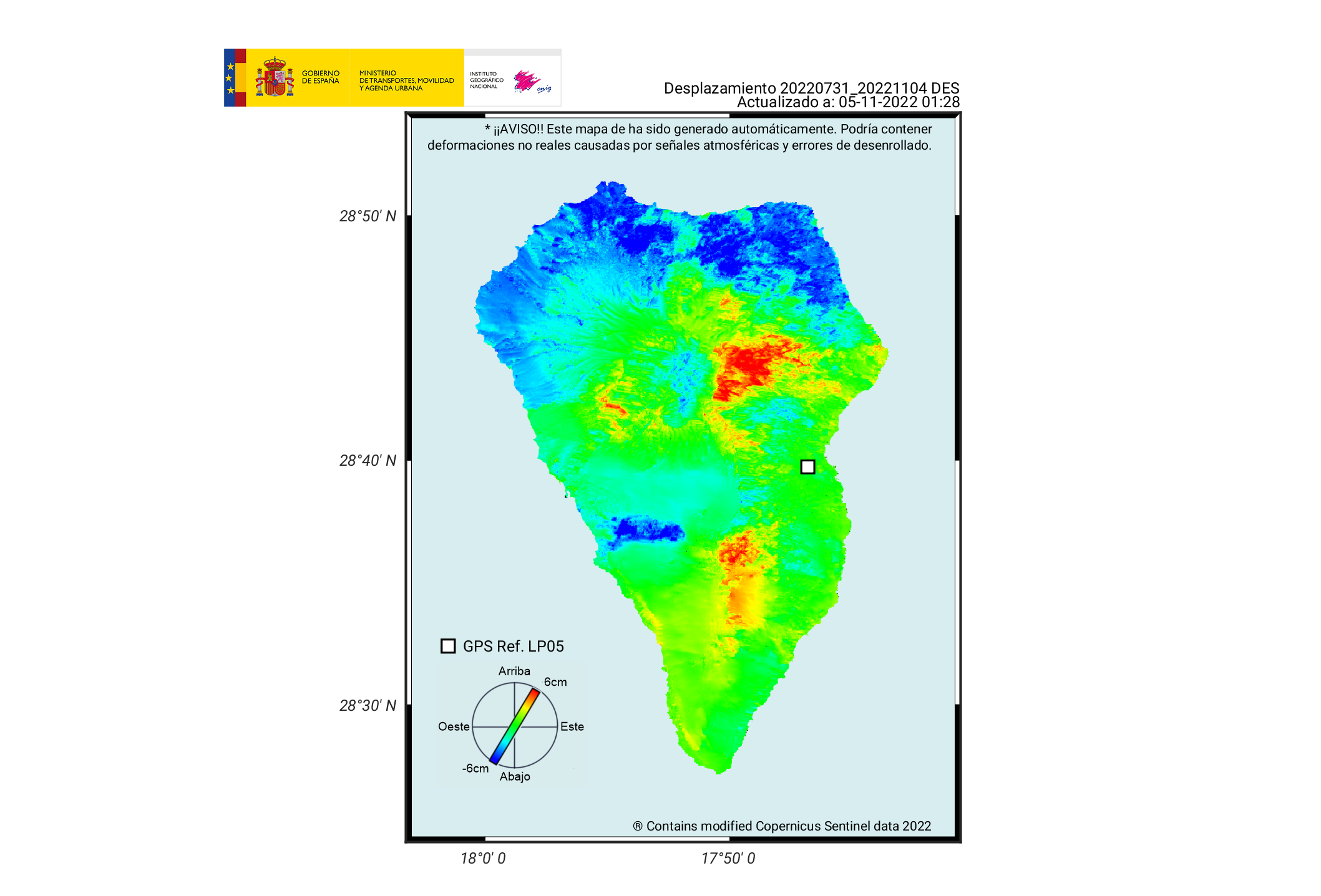 La figura que acompaña a este resumen muestra el desplazamiento acumulado entre el 31 de julio y el 4 de noviembre en la isla de La Palma obtenido con procesado InSAR. Aunque hay señales asociadas a efectos atmosféricos sobre algunas zonas, como el norte de la isla o en la dorsal de Cumbre Vieja, sobre la zona cubierta por las lavas de la erupción de 2021, la señal que se observa corresponde en su mayoría al efecto del compactación y enfriamiento de los materiales magmáticos en superficie, que produce un desplazamiento vertical hacia abajo de la zona.