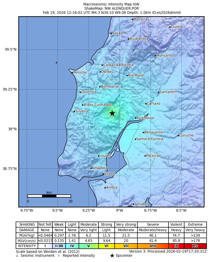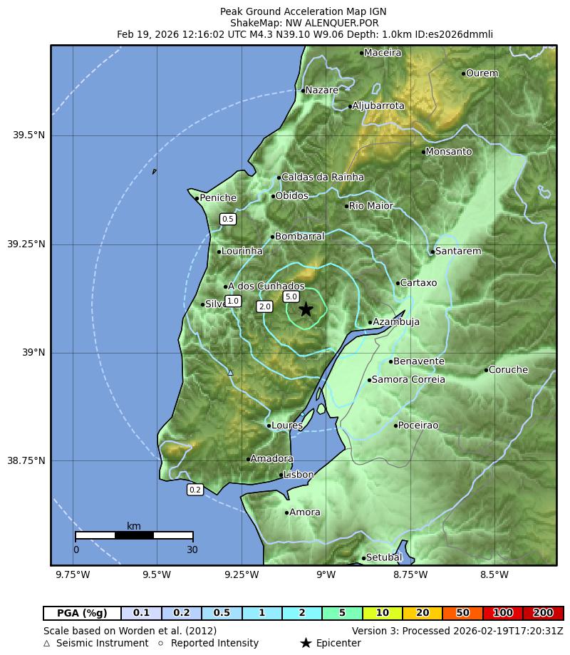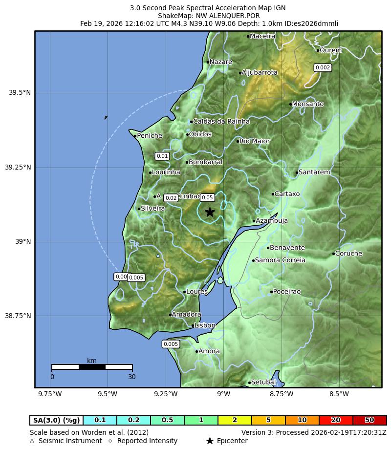 | es2026dmmli | 19/02/2026 | 12:16:02 | 13:16:02 | 39.1001 | -9.0596 | 1.0 | 4.3 | mbLg | NW ALENQUER.POR |