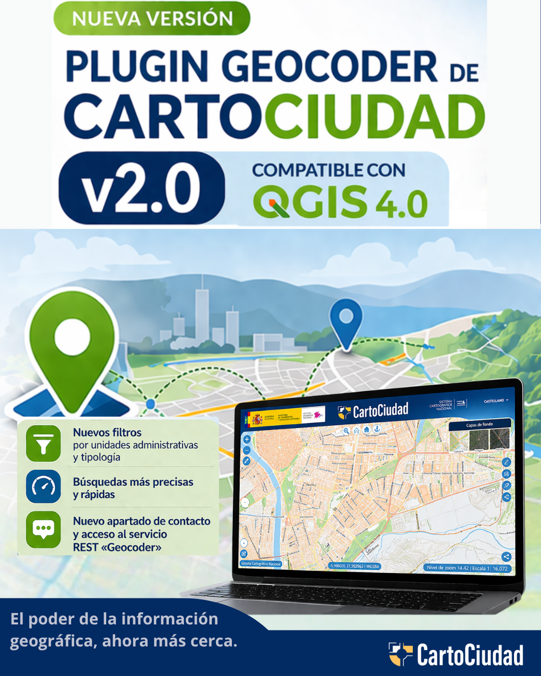 08/04/2026Nueva versión del plugin Geocoder de CartoCiudad (v2.0): compatible con QGIS 4.0 y nuevas funcionalidadesSe ha actualizado en CartoCiudad el plugin Geocoder de CartoCiudad, garantizando su compatibilidad con QGIS 4.0. Además, se han incorporado nuevas funcionalidades y mejoras de rendimiento y usabilidad. |