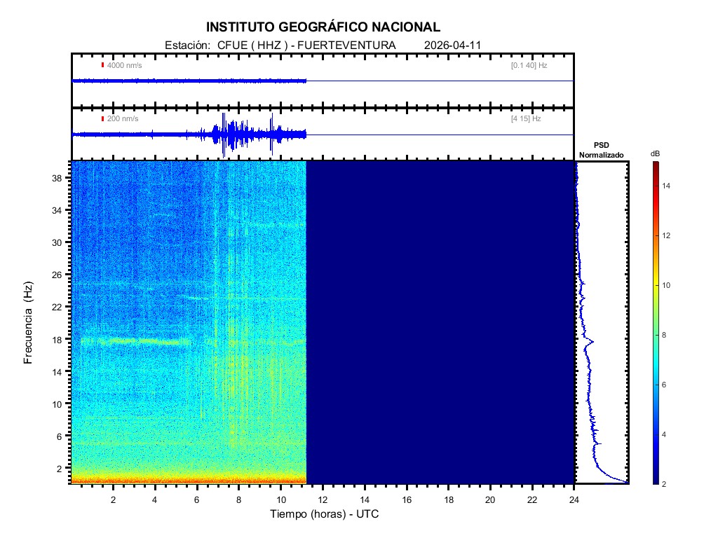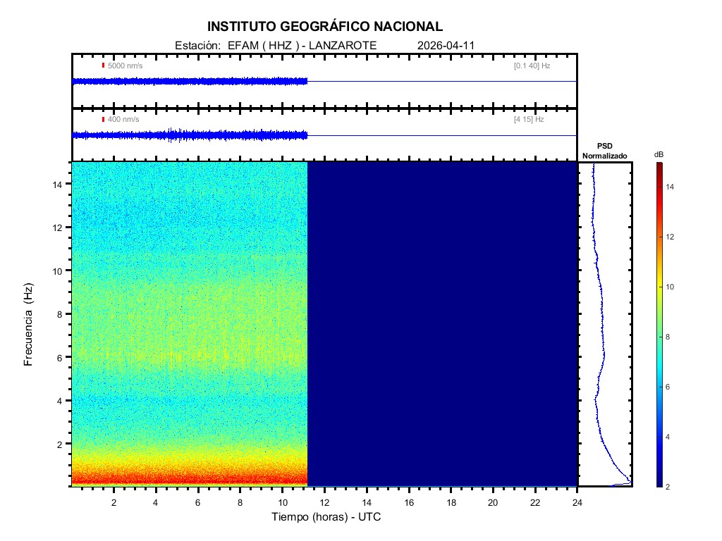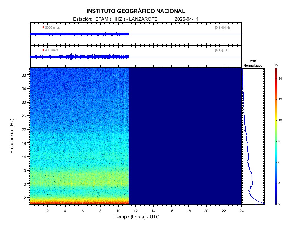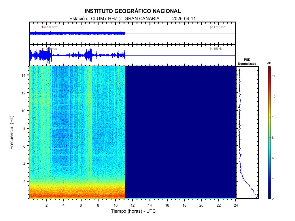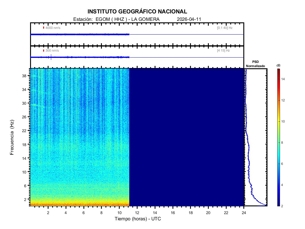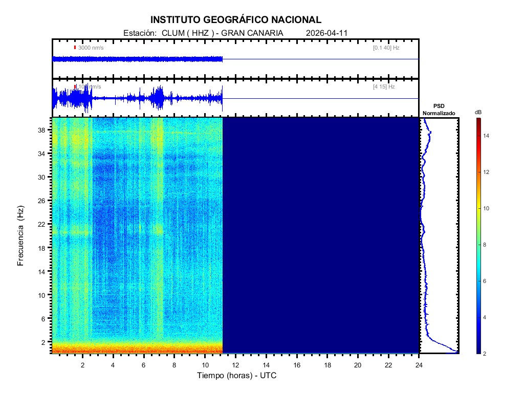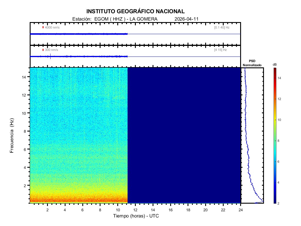 | 2026-04-11 | Forma de Onda (Filtro banda ancha) | Forma de Onda (Filtro corto periodo) | Espectrograma ([0 40] Hz) | Espectrograma ([0 15] Hz) | ||