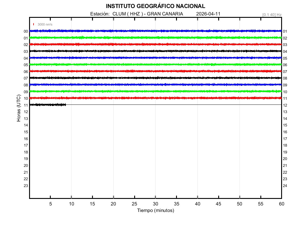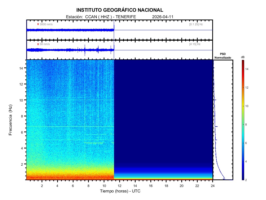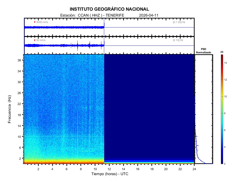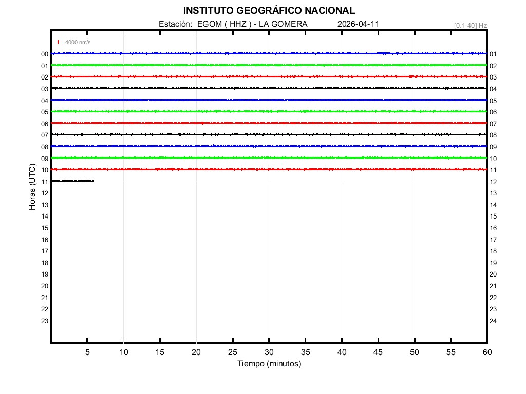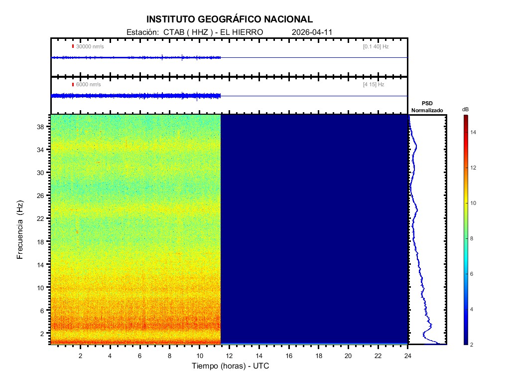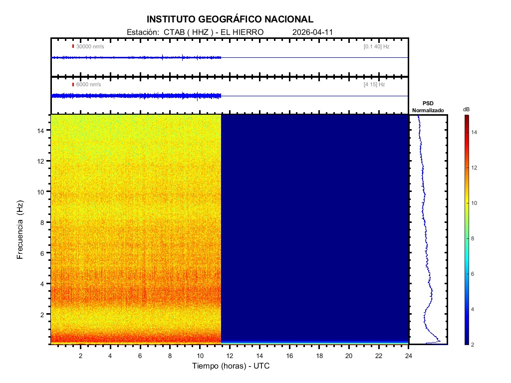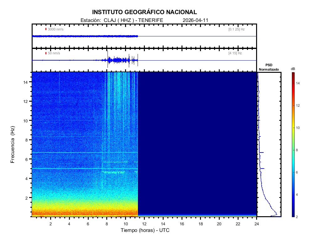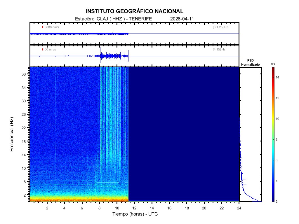 | 2026-04-11 | Forma de Onda (Filtro banda ancha) | Forma de Onda (Filtro corto periodo) | Espectrograma ([0 40] Hz) | Espectrograma ([0 15] Hz) | ||