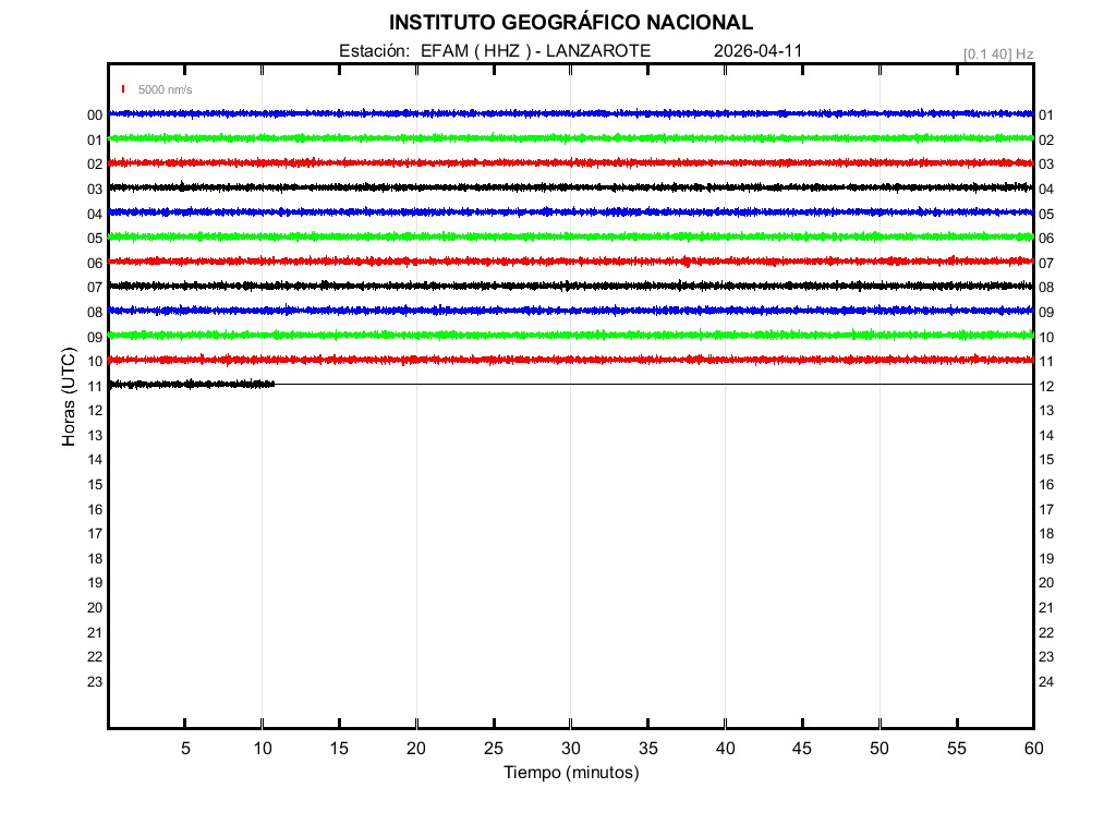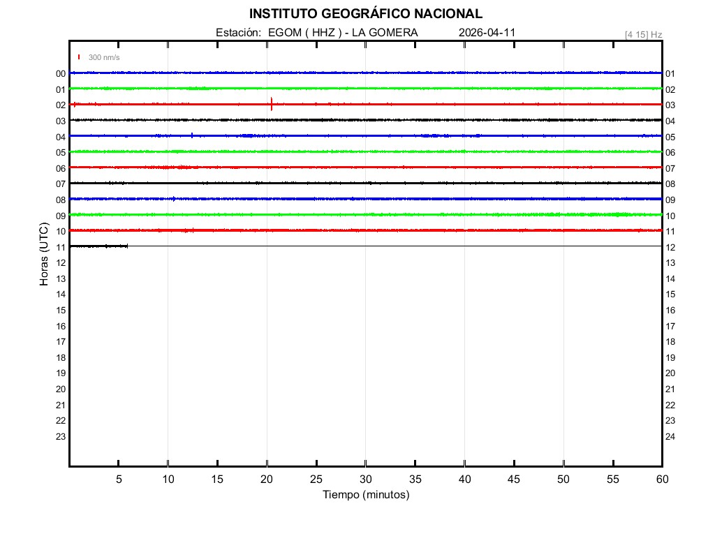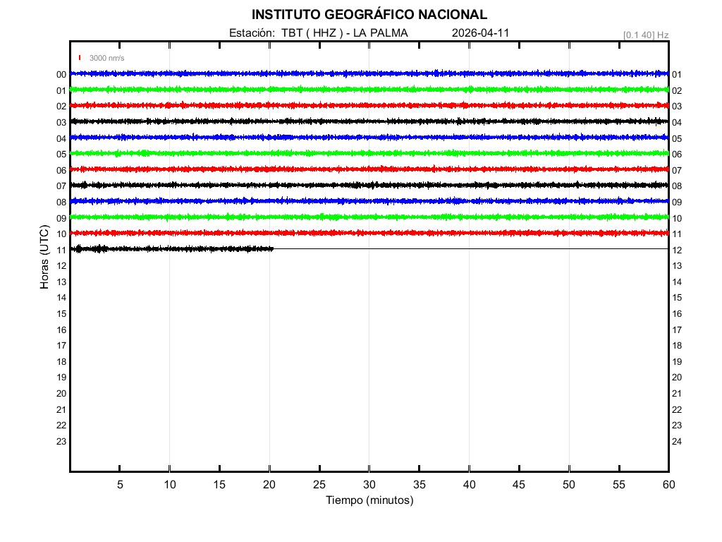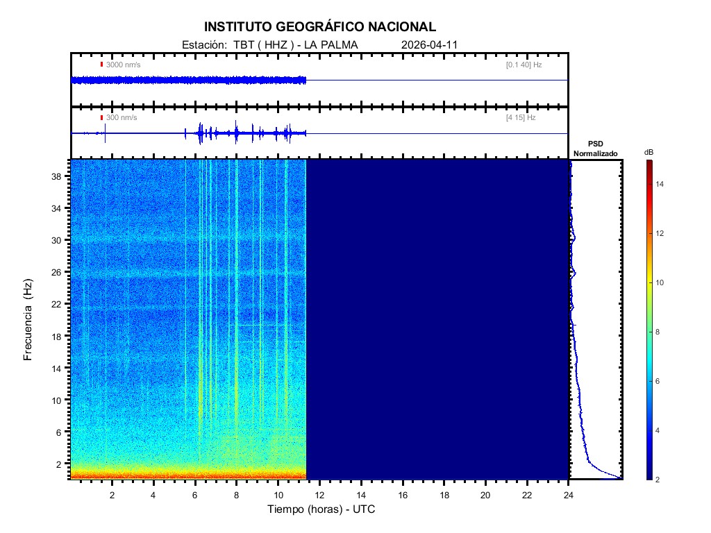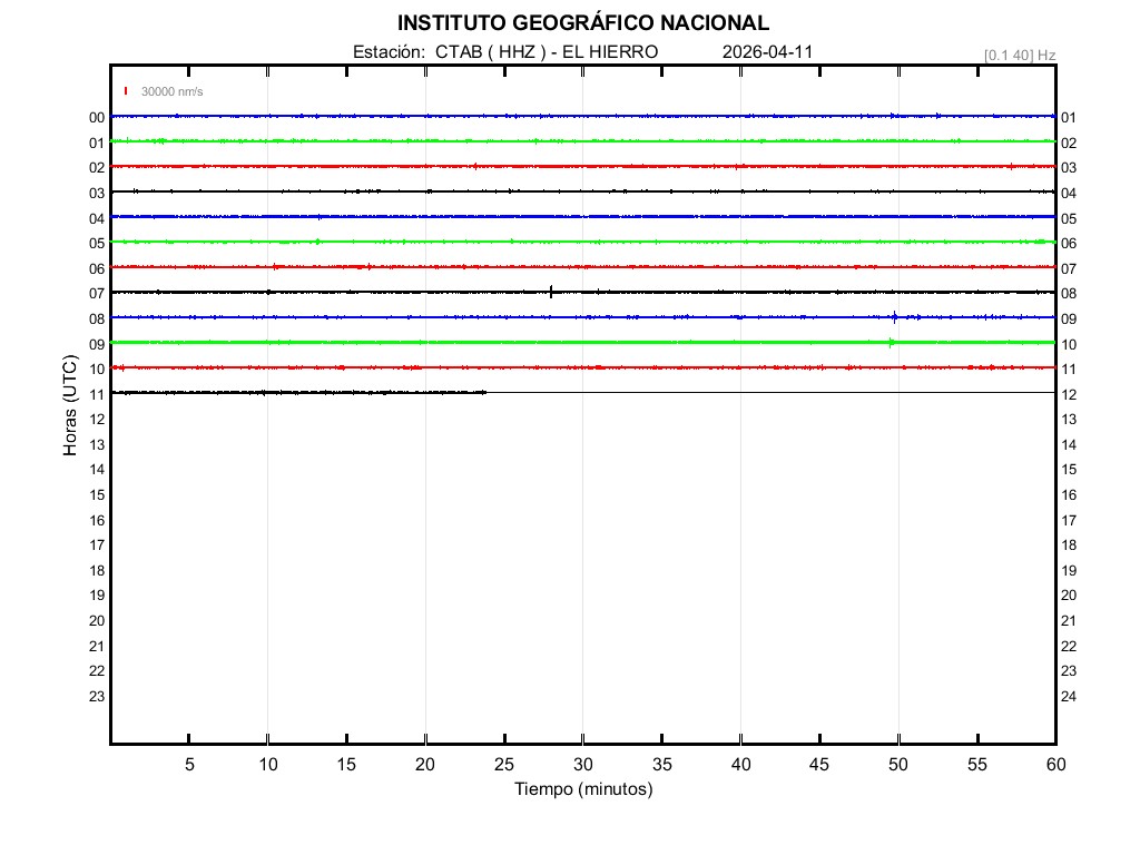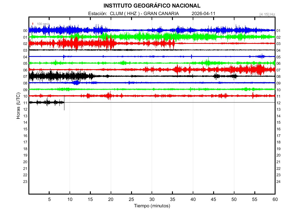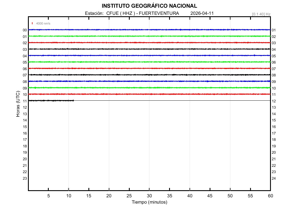 | 2026-04-11 | Forma de Onda (Filtro banda ancha) | Forma de Onda (Filtro corto periodo) | Espectrograma ([0 40] Hz) | Espectrograma ([0 15] Hz) | ||