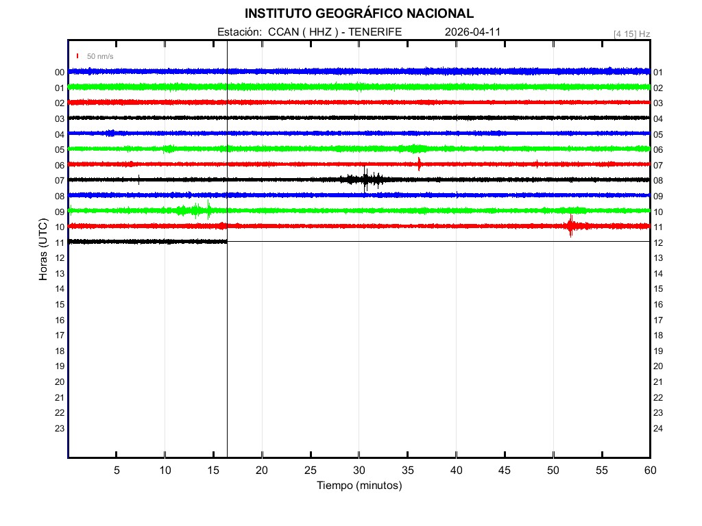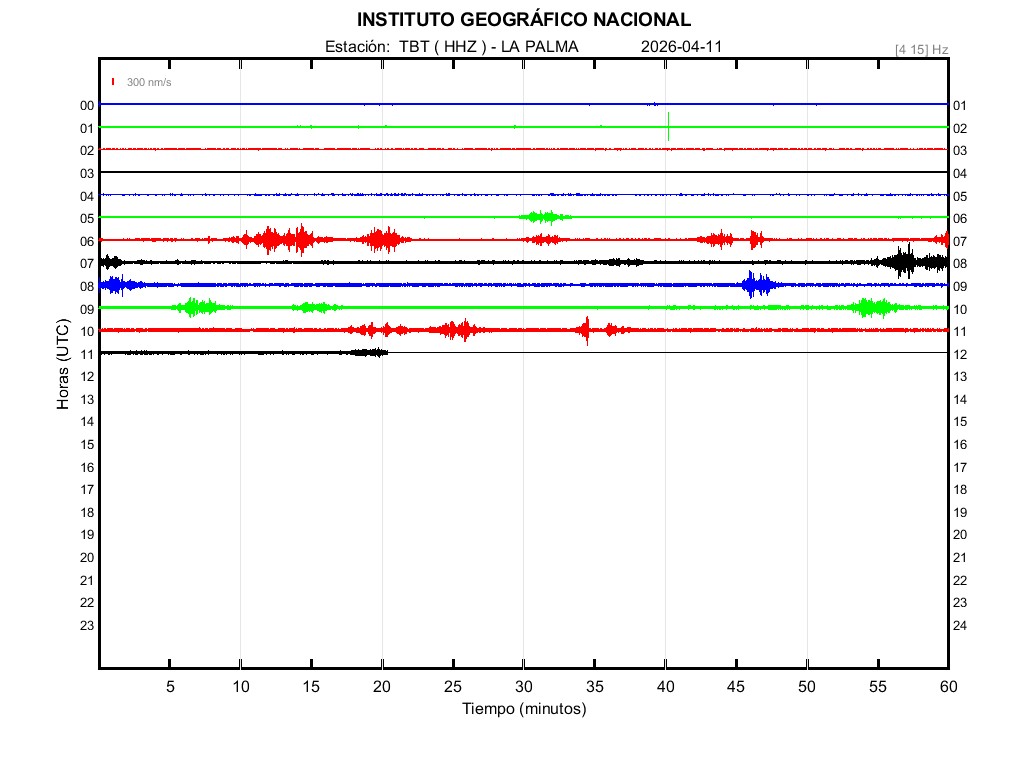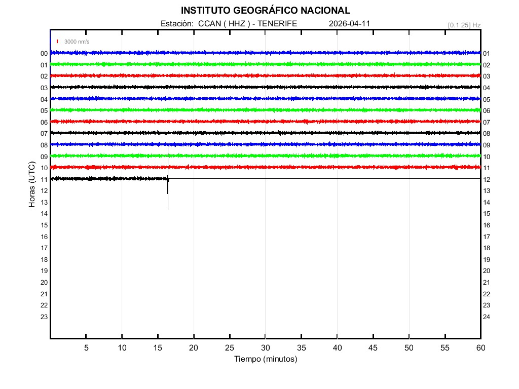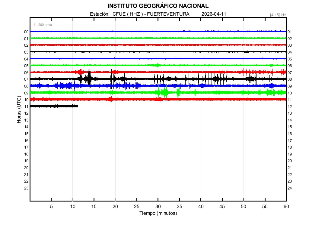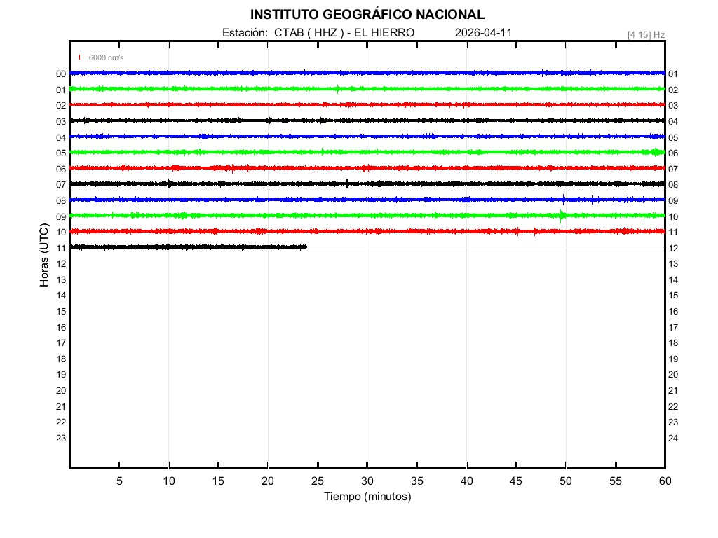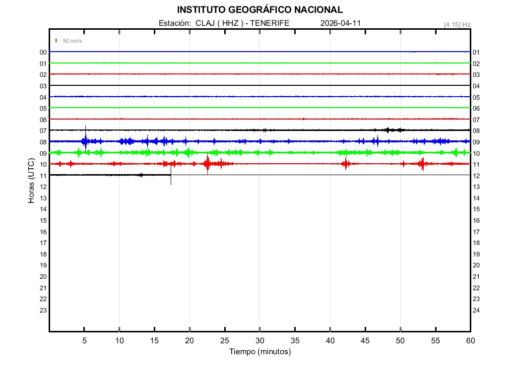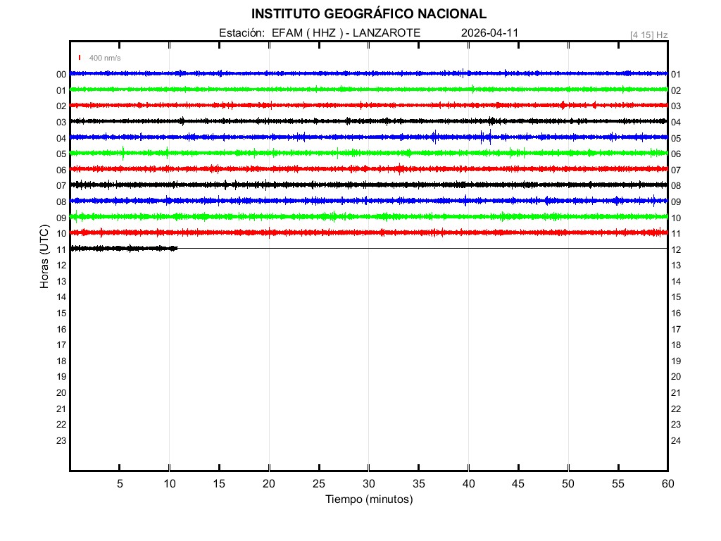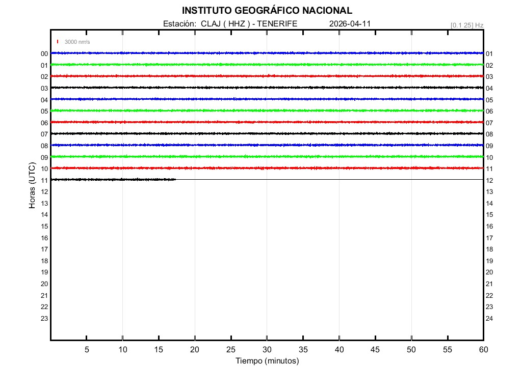 | 2026-04-11 | Forma de Onda (Filtro banda ancha) | Forma de Onda (Filtro corto periodo) | Espectrograma ([0 40] Hz) | Espectrograma ([0 15] Hz) | ||