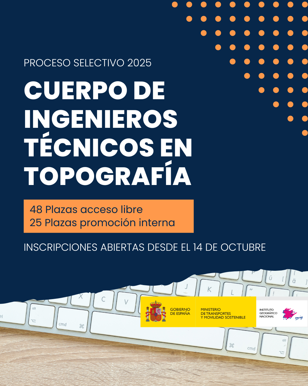 13/10/2025Proceso selectivo para ingreso en el Cuerpo de Ingenieros Técnicos en Topografía![]() Se ha convocado proceso selectivo para el ingreso, por el sistema general de acceso libre y promoción interna, en el Cuerpo de Ingenieros Técnicos en Topografía. El proceso selectivo se realizará mediante el sistema de oposición para las personas aspirantes que se presenten por el turno de acceso libre y mediante el sistema de concurso–oposición para aquellas que lo hagan por el turno de acceso por promoción interna. Por acceso libre cubre 48 plazas y por promoción interna cubre 25 plazas. El plazo de solicitud es de 20 días hábiles contados a partir del día siguiente al de la fecha de publicación de esta convocatoria en el «Boletín Oficial del Estado». Puedes consultar esta convocatoria en su publicación en el BOE. |