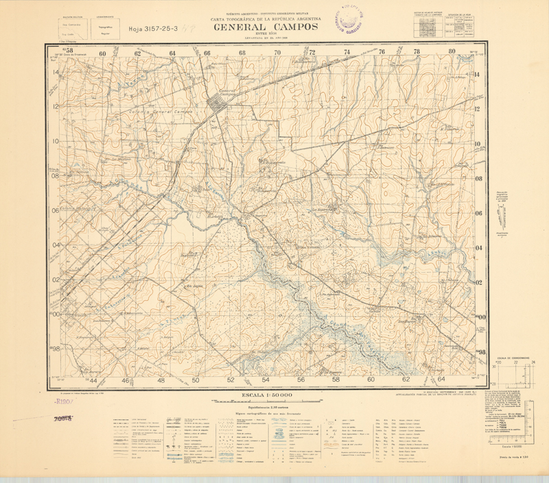 General Campos: Entre Ríos : levantado en el año 1928 [Material cartográfico] Ejército Argentino, Instituto Geográfico Militar. Escala 1:50.000 (O 58°30'-O 58°15'/S 31°30'-S 31°40') Instituto Geográfico Militar, [Buenos Aires], 1949