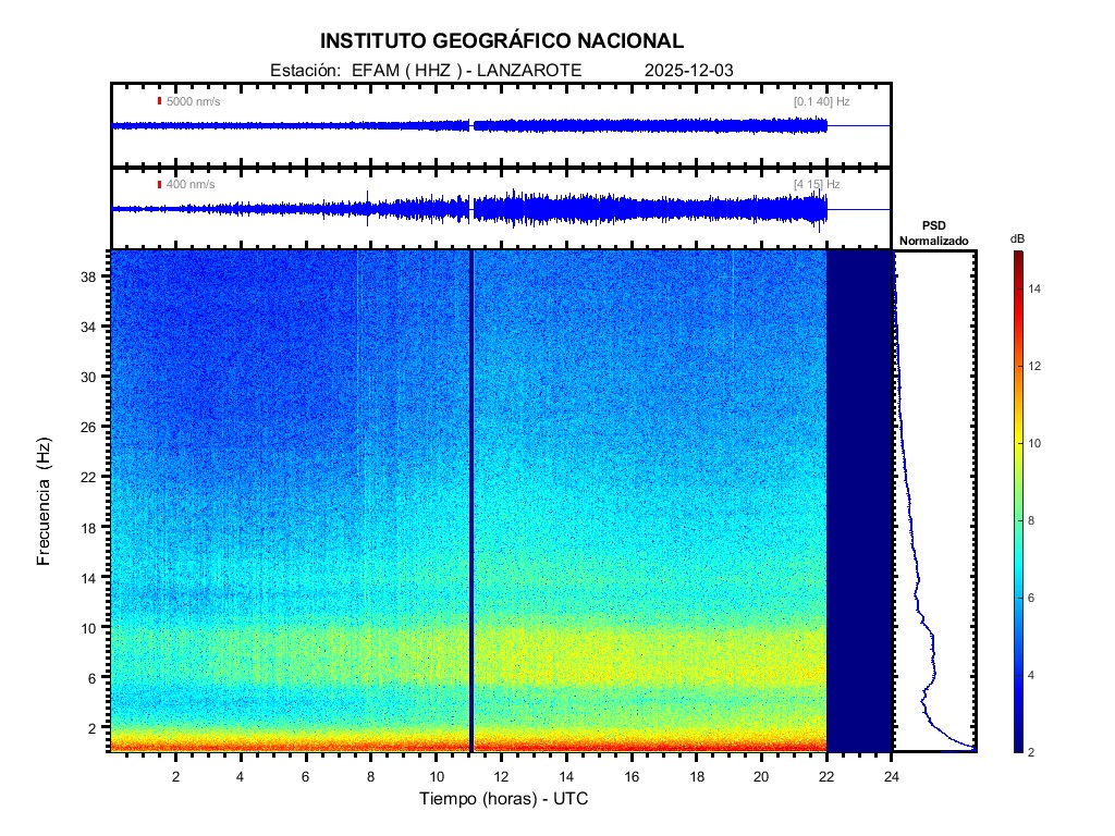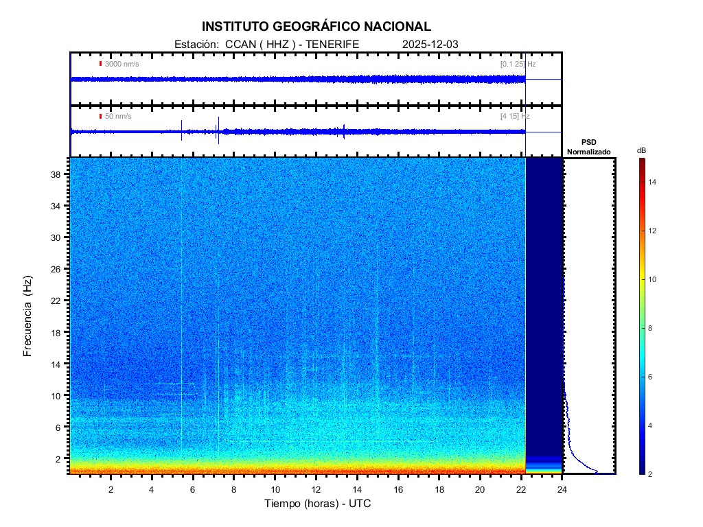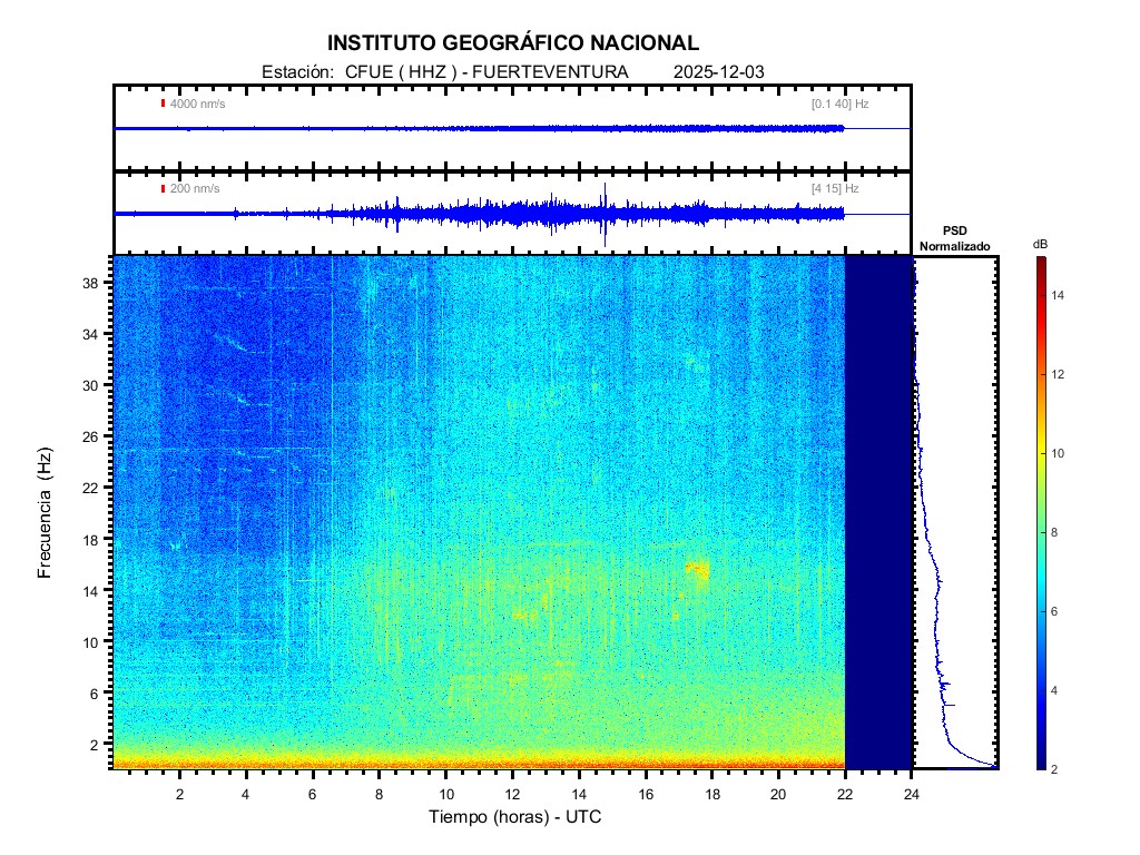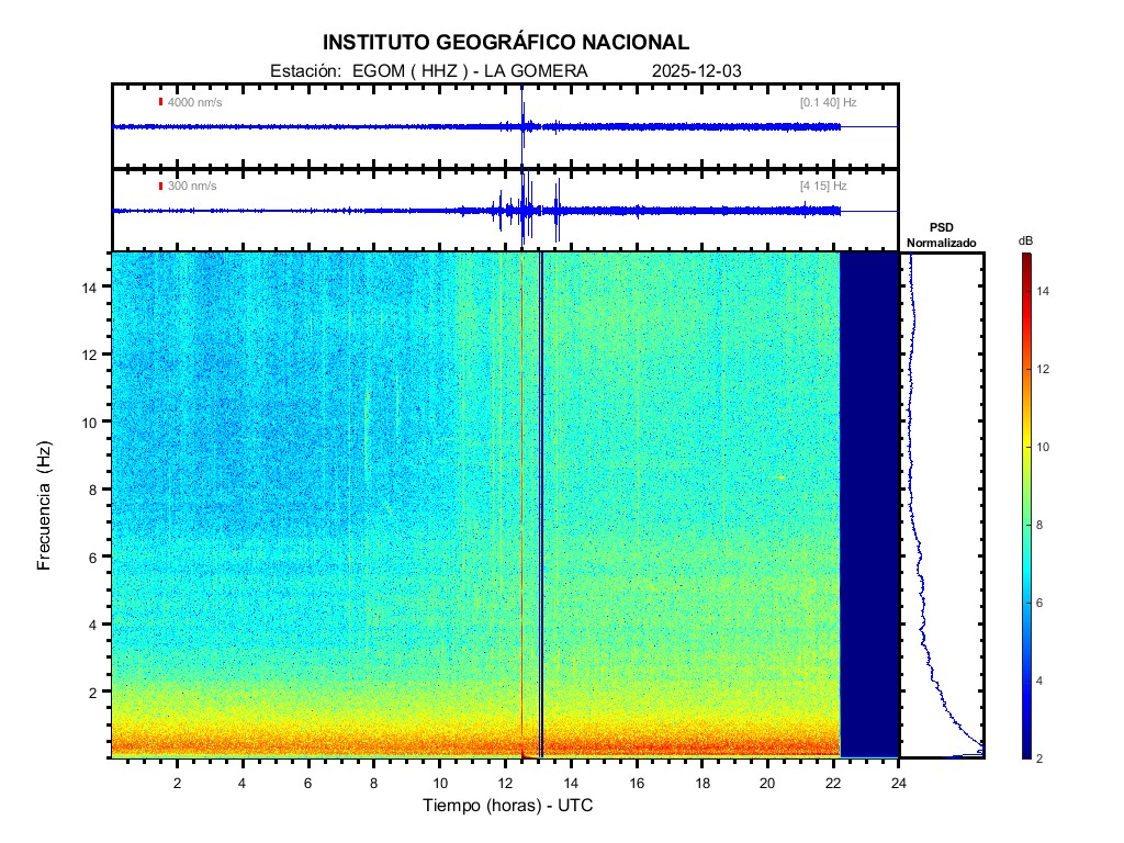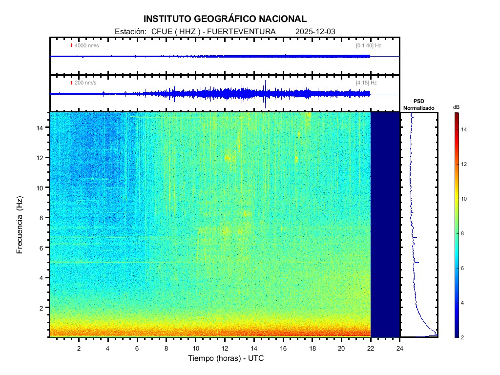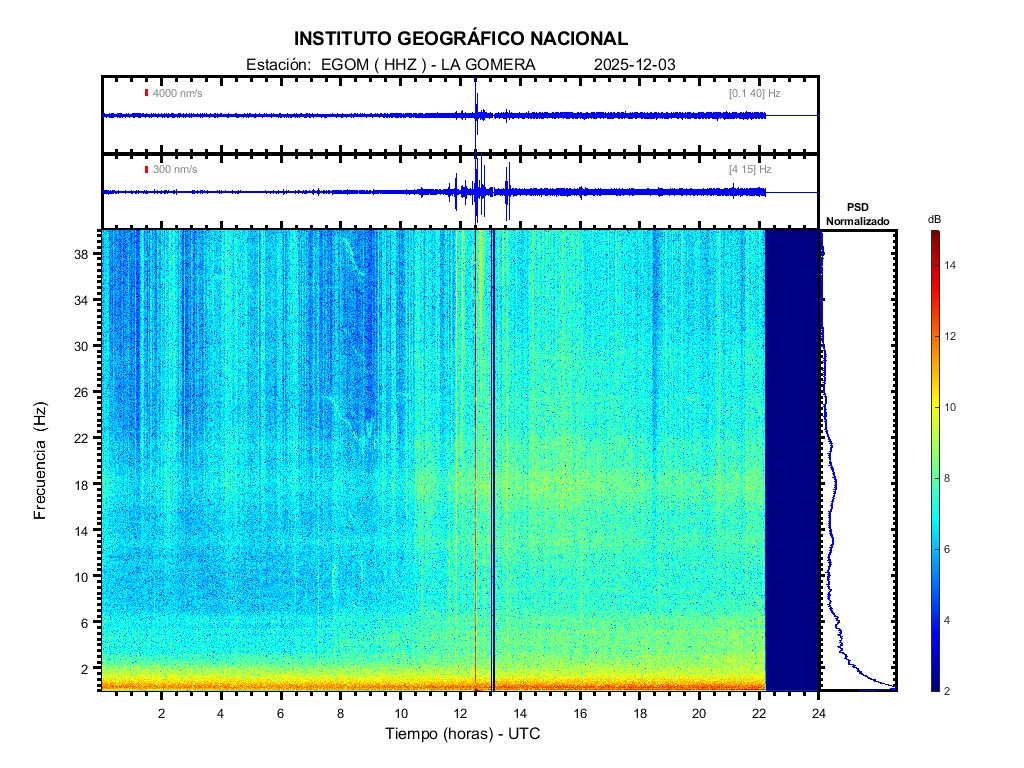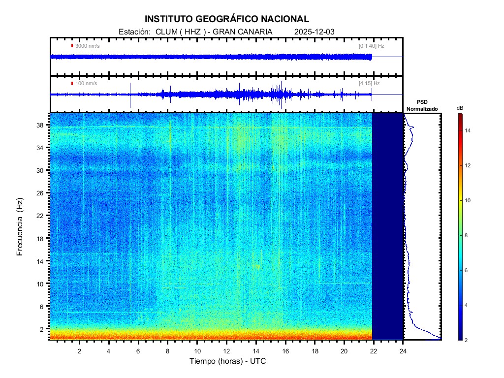 | 2025-12-03 | Forma de Onda (Filtro banda ancha) | Forma de Onda (Filtro corto periodo) | Espectrograma ([0 40] Hz) | Espectrograma ([0 15] Hz) | ||