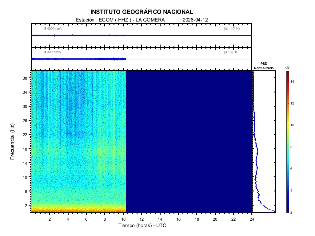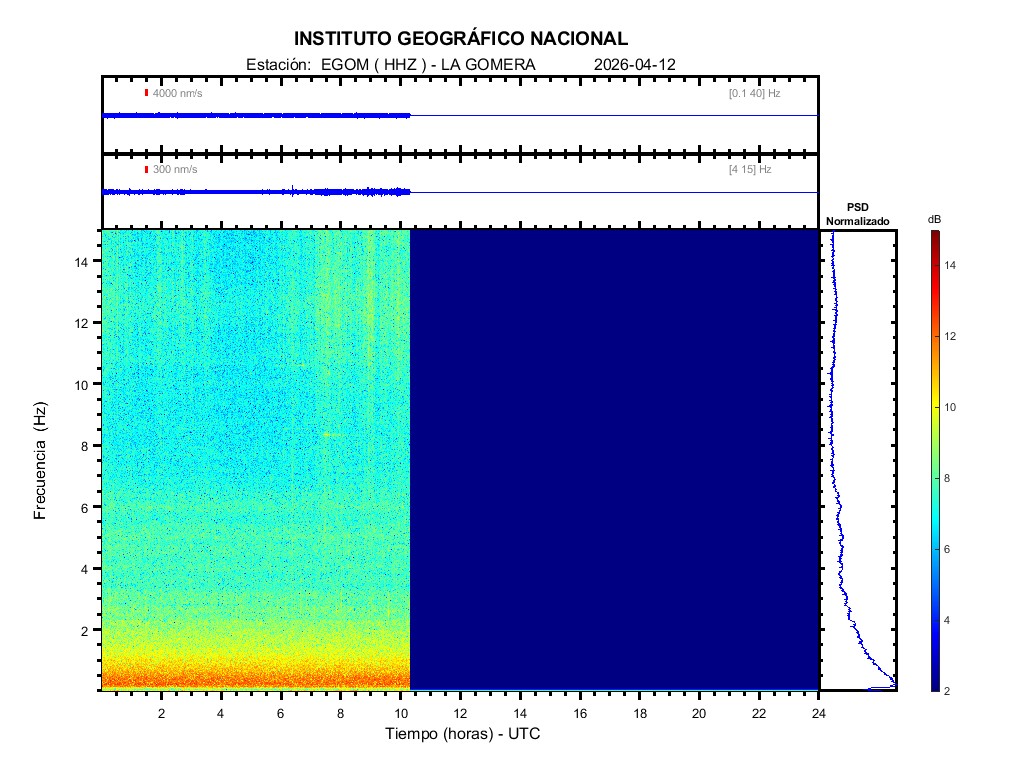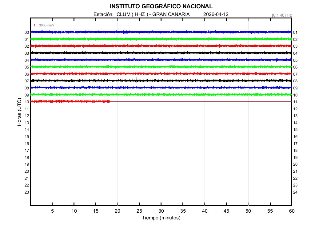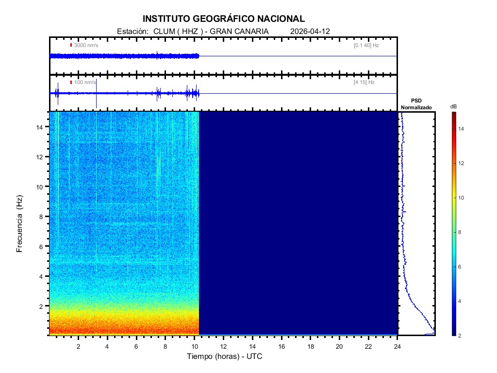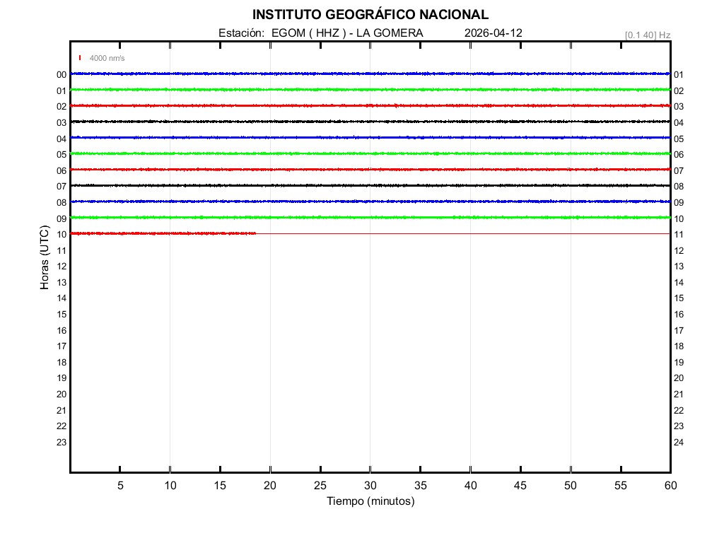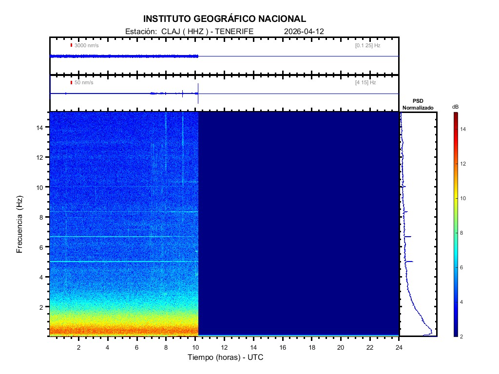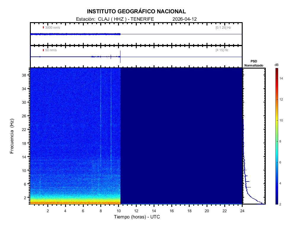 | 2026-04-12 | Forma de Onda (Filtro banda ancha) | Forma de Onda (Filtro corto periodo) | Espectrograma ([0 40] Hz) | Espectrograma ([0 15] Hz) | ||