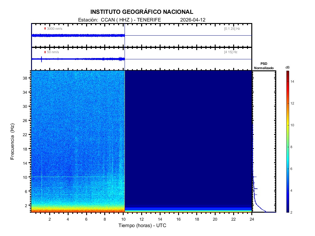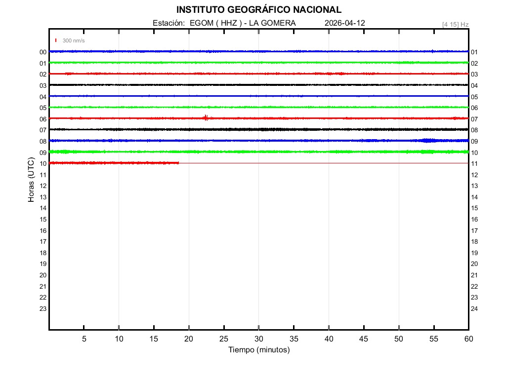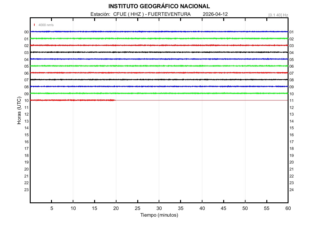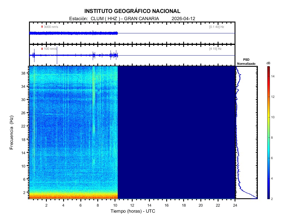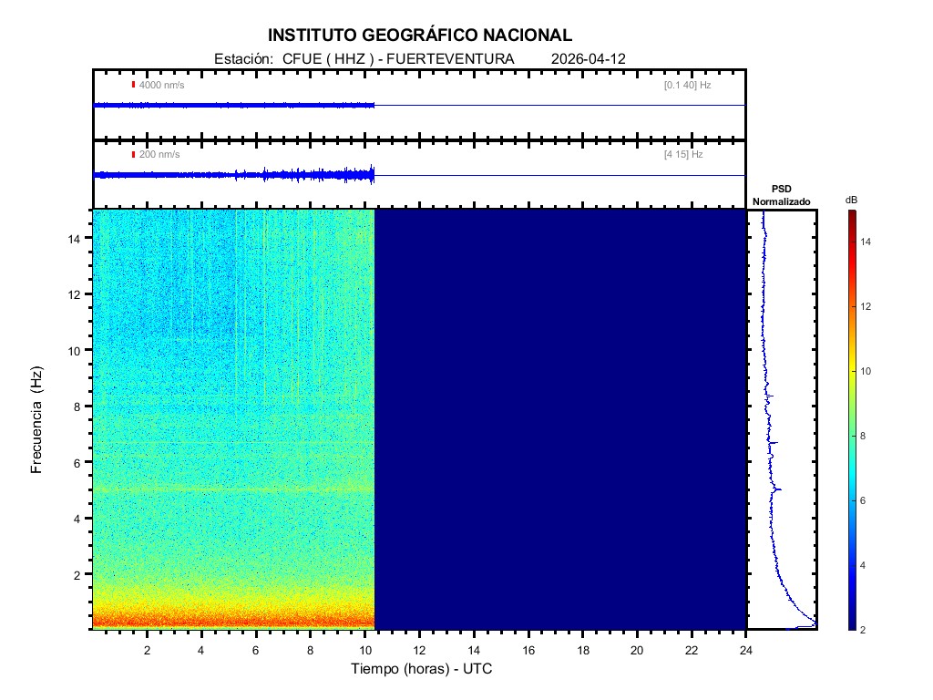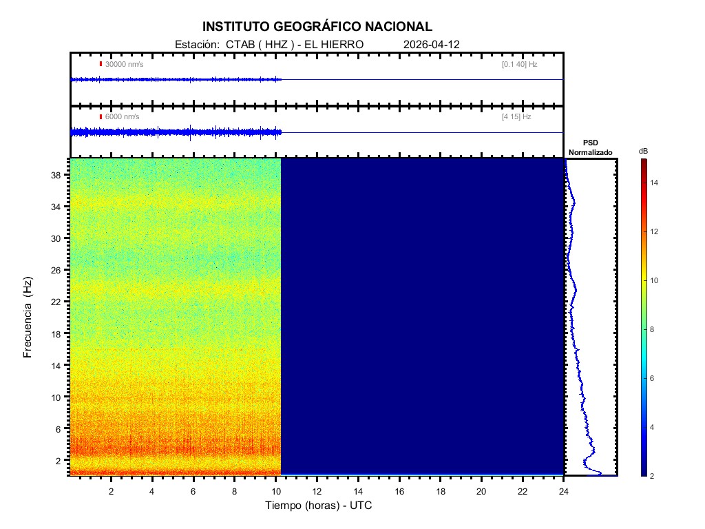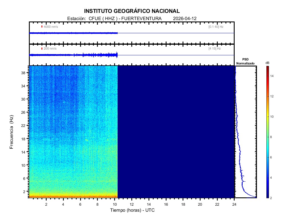 | 2026-04-12 | Forma de Onda (Filtro banda ancha) | Forma de Onda (Filtro corto periodo) | Espectrograma ([0 40] Hz) | Espectrograma ([0 15] Hz) | ||