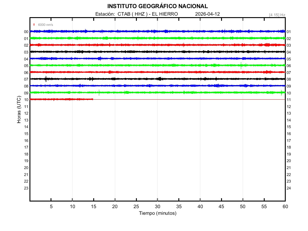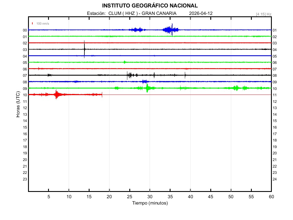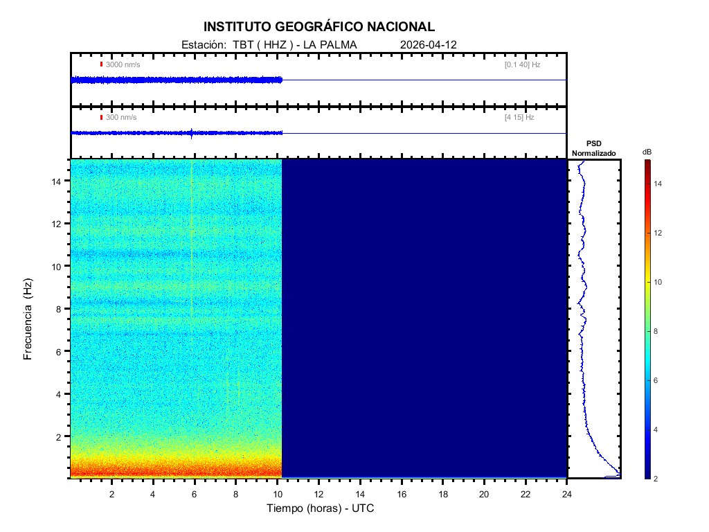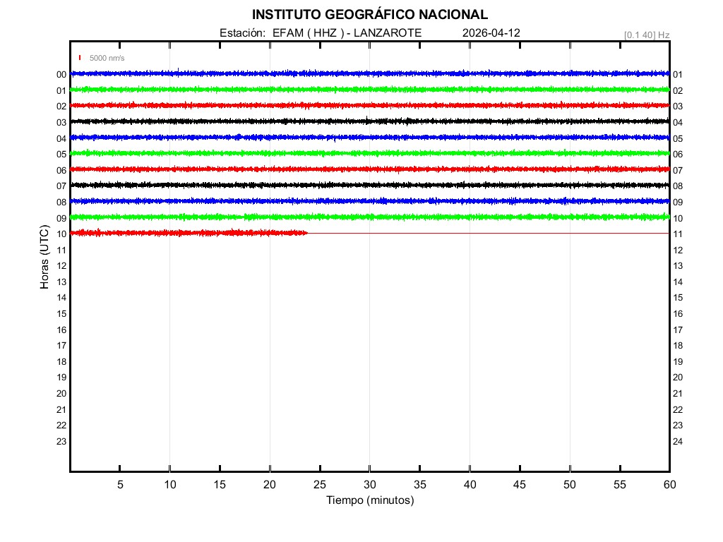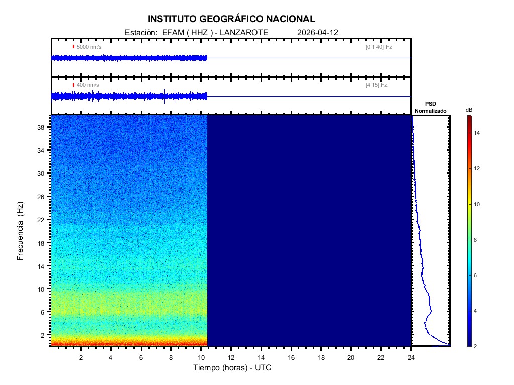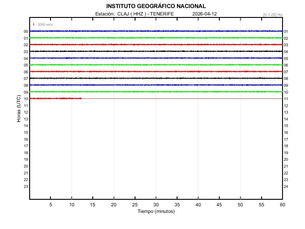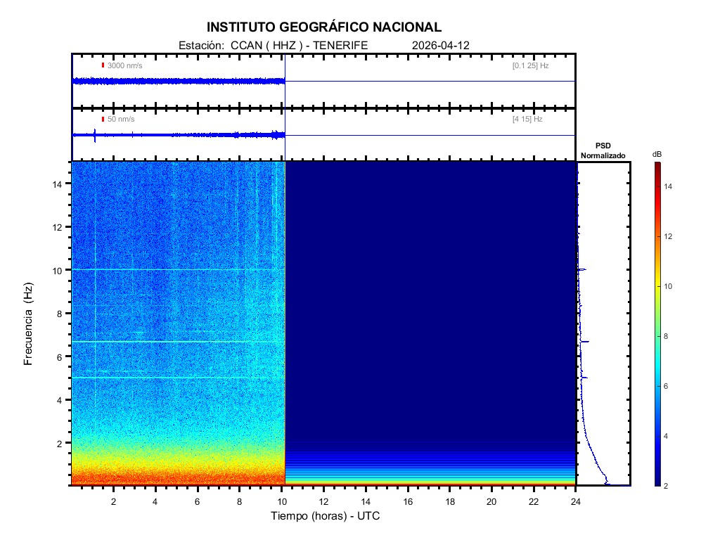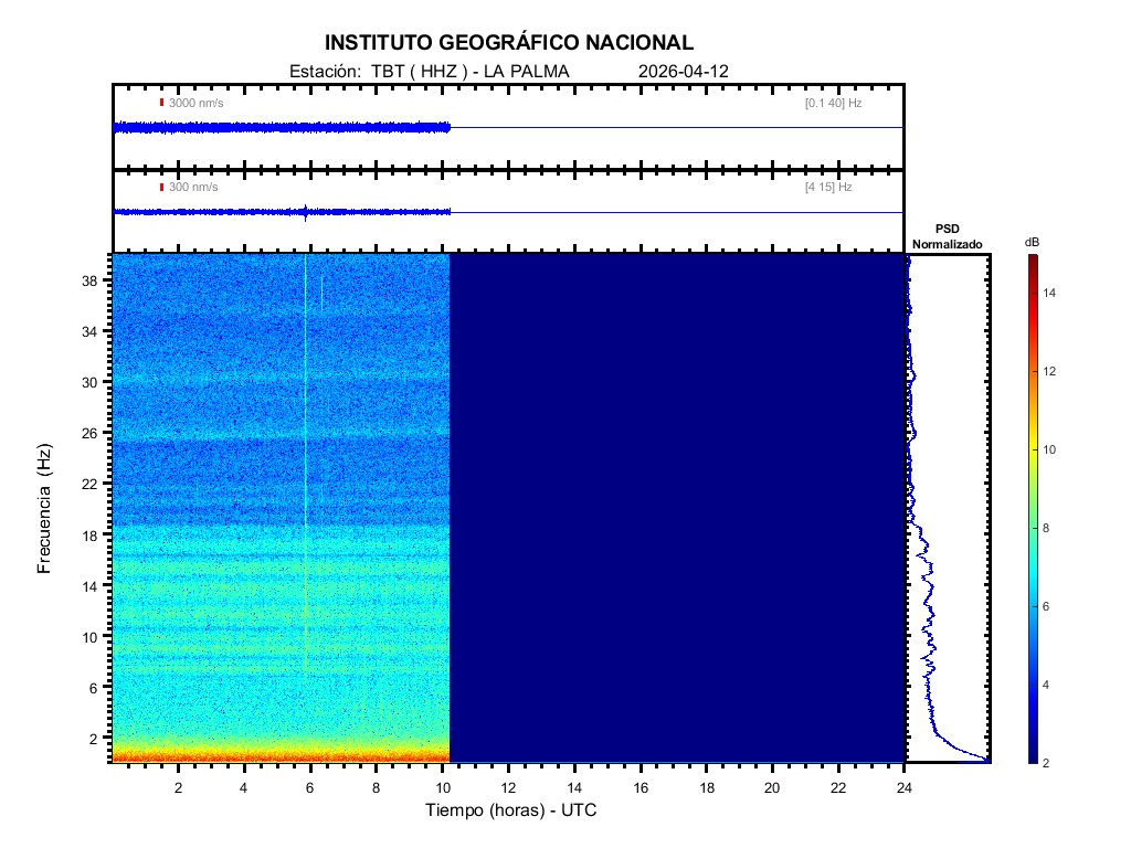 | 2026-04-12 | Forma de Onda (Filtro banda ancha) | Forma de Onda (Filtro corto periodo) | Espectrograma ([0 40] Hz) | Espectrograma ([0 15] Hz) | ||