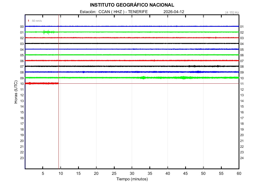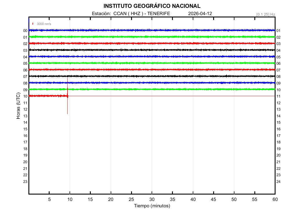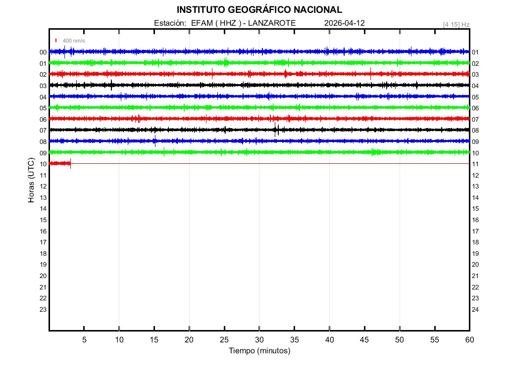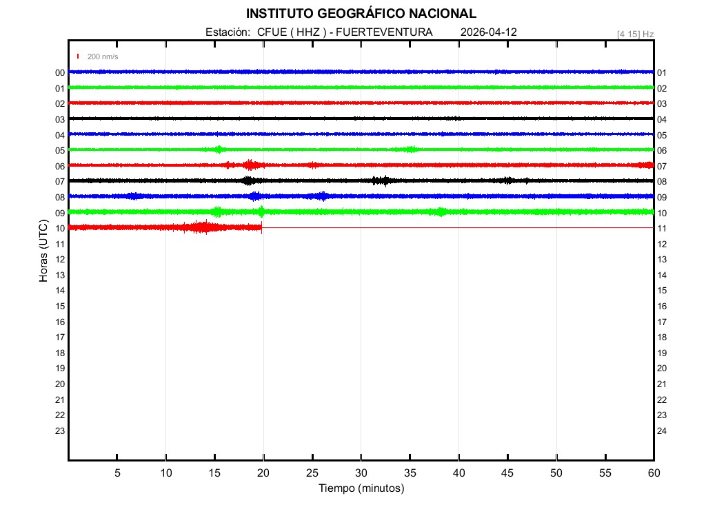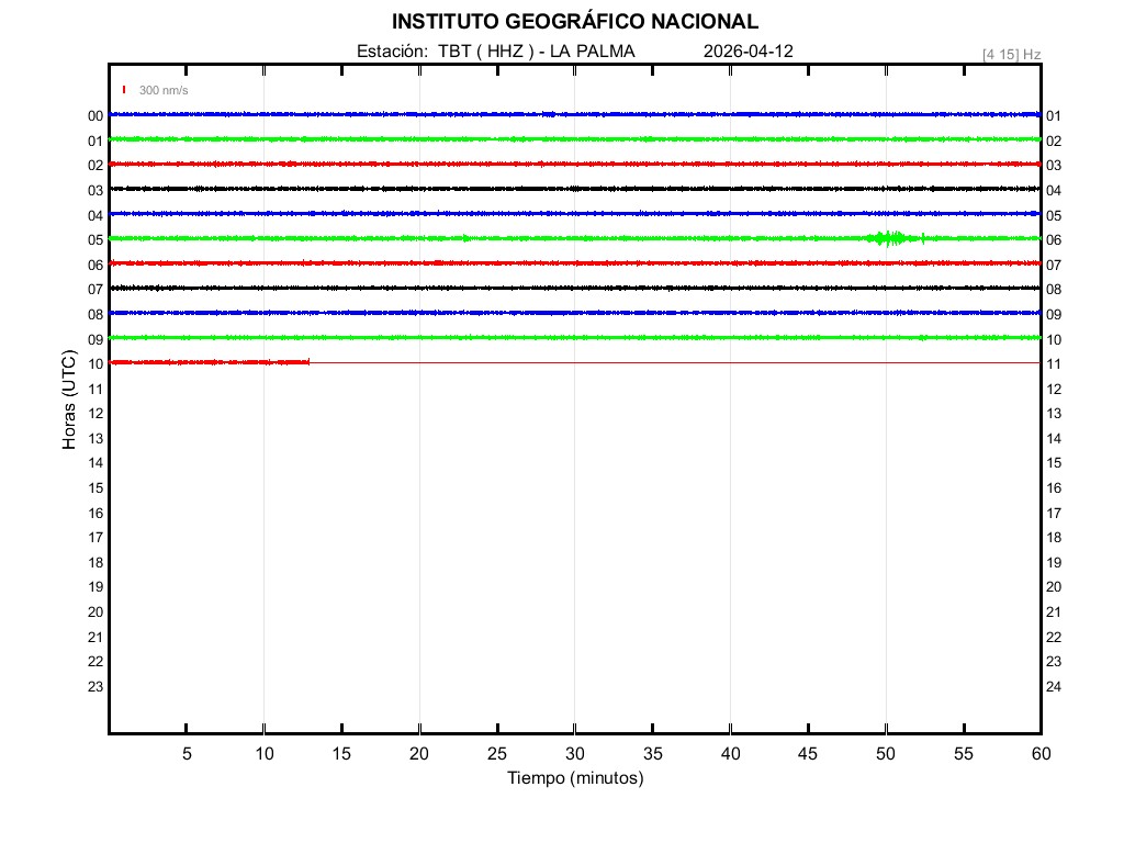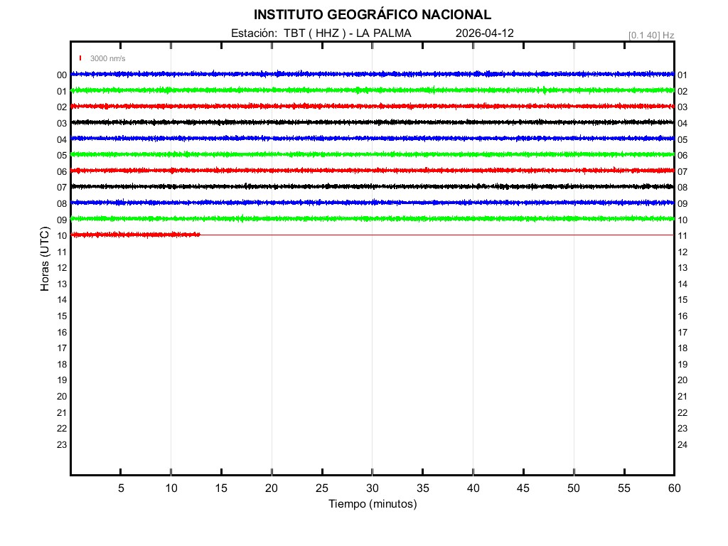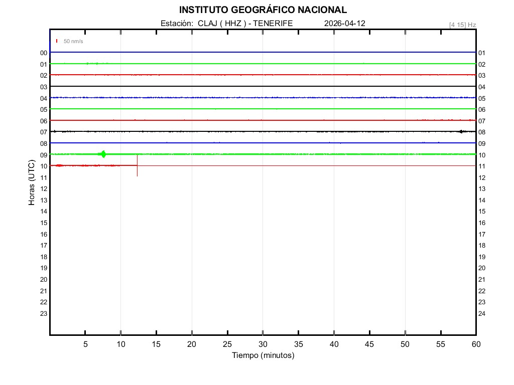 | 2026-04-12 | Forma de Onda (Filtro banda ancha) | Forma de Onda (Filtro corto periodo) | Espectrograma ([0 40] Hz) | Espectrograma ([0 15] Hz) | ||