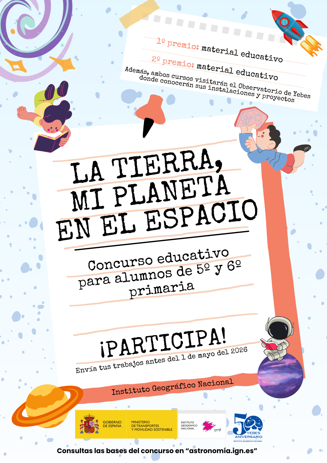 23/03/2026I Concurso «La Tierra, mi planeta en el espacio»El Instituto Geográfico Nacional convoca el I Concurso «La Tierra, mi planeta en el espacio» con el objetivo de dar a conocer entre los más jóvenes, las actividades científicas y técnicas que se realizan dentro del IGN, en concreto en el Observatorio de Yebes. El concurso tiene como fin ampliar las vocaciones científico-técnicas, así como favorecer y destacar a los jóvenes con talento, al profesorado y a sus centros educativos, fomentando las inquietudes científicas en los ámbitos Astronomía, Observación de la Tierra y Observación del Espacio. La participación está restringida a los cursos de 5º y 6º de educación primaria. Los formatos podrán ser: Dibujos, Pinturas, maquetas y vídeos. El plazo de recepción de los trabajos finalizará el día 1 de mayo de 2026 a las 23:59 horas de Madrid. |