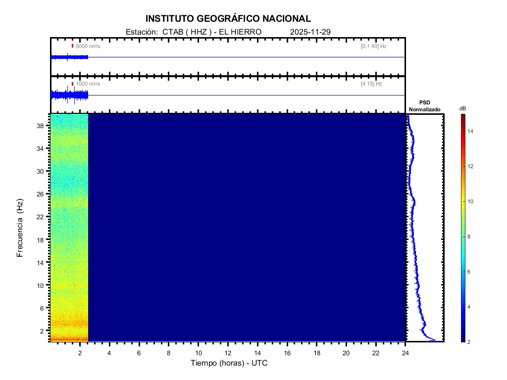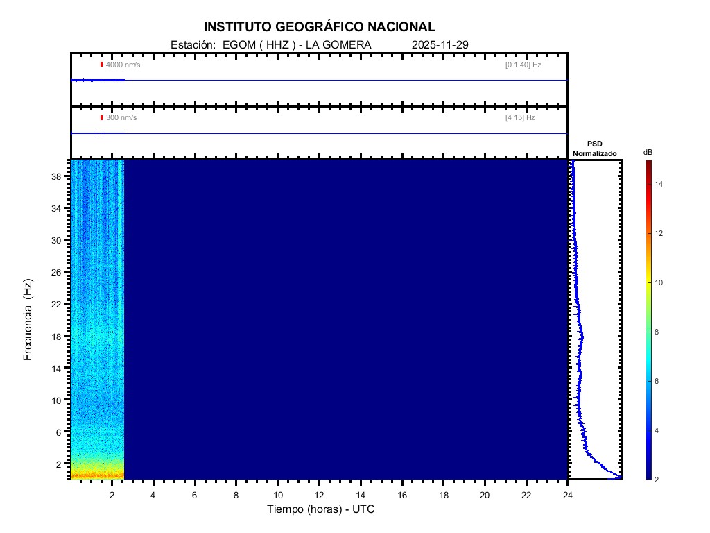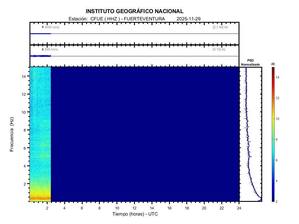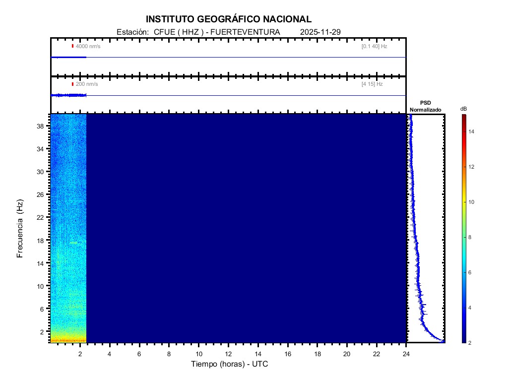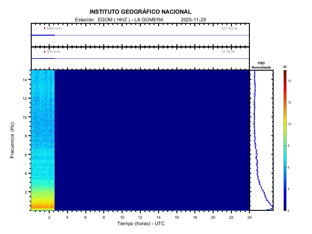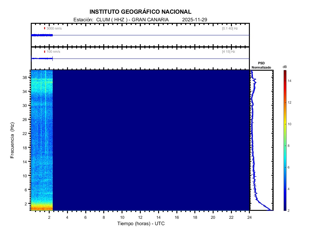 | 2025-11-29 | Forma de Onda (Filtro banda ancha) | Forma de Onda (Filtro corto periodo) | Espectrograma ([0 40] Hz) | Espectrograma ([0 15] Hz) | ||
