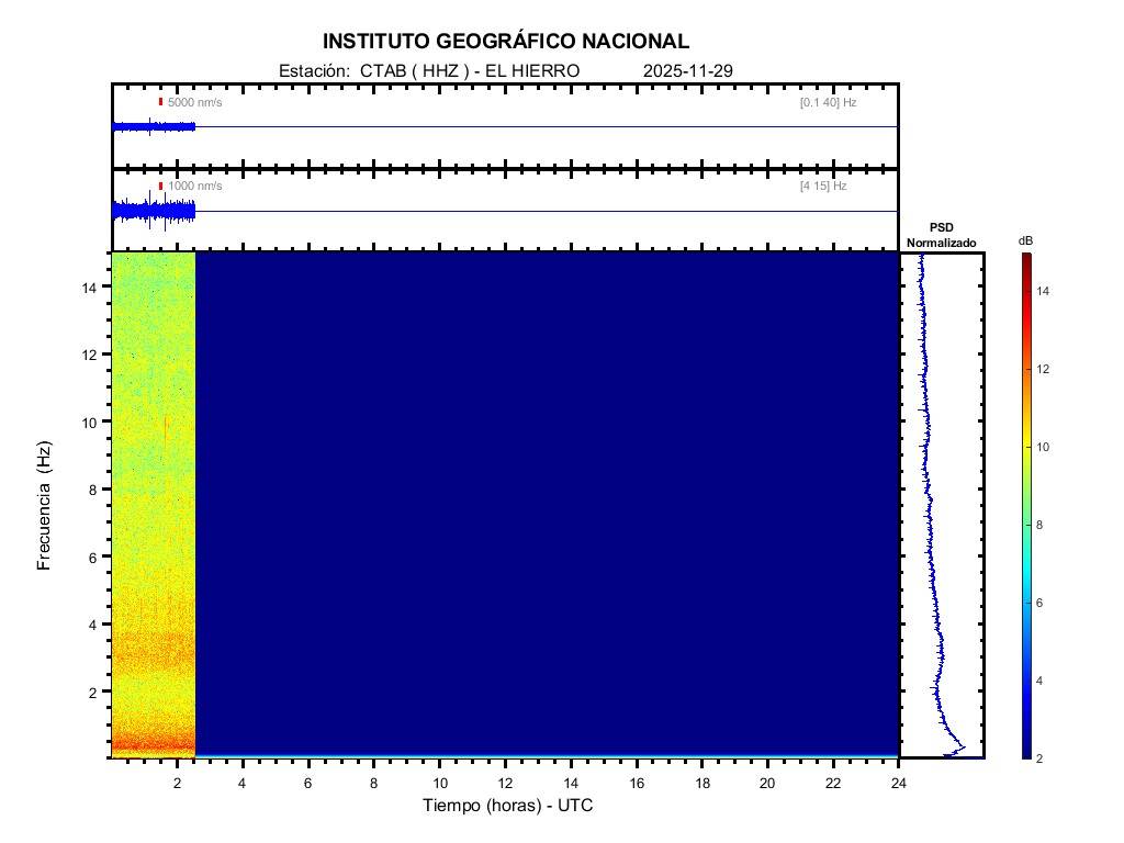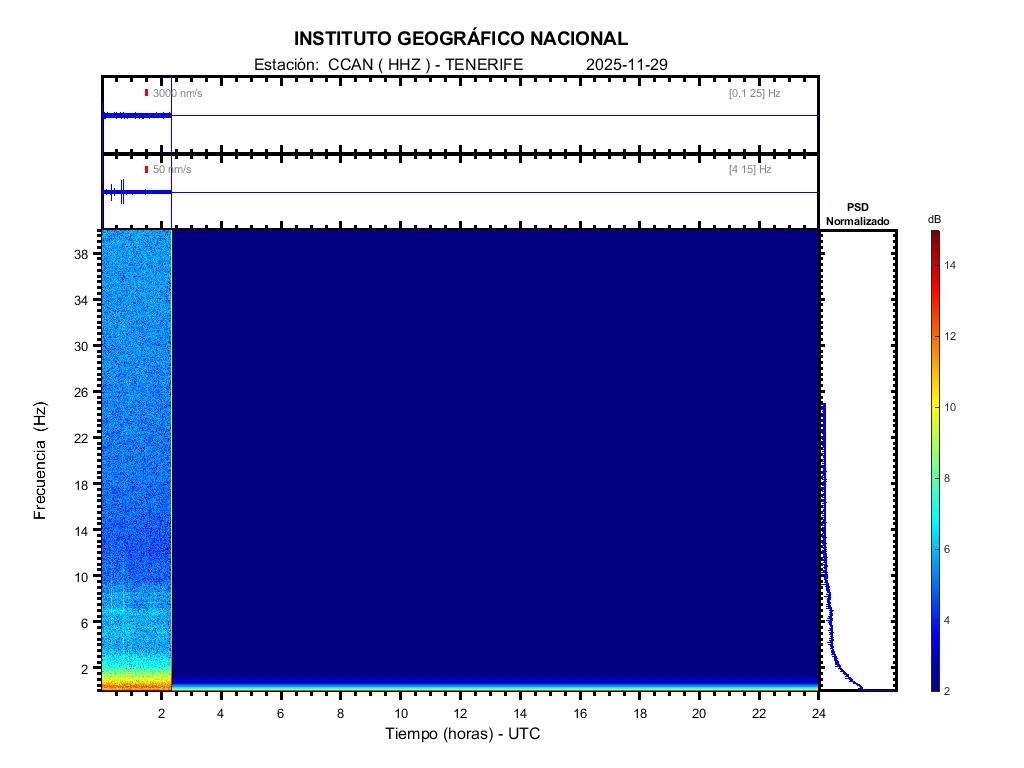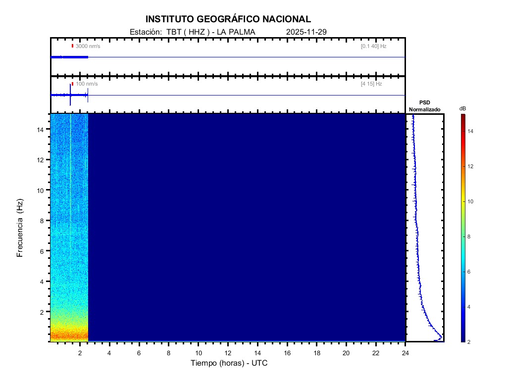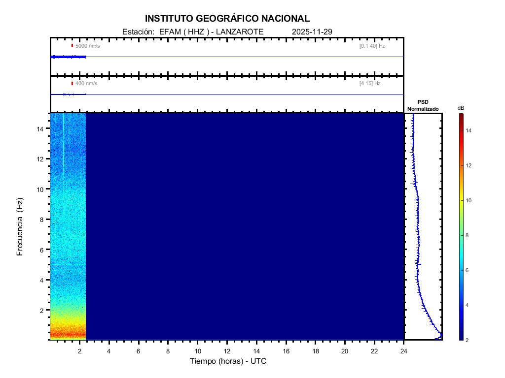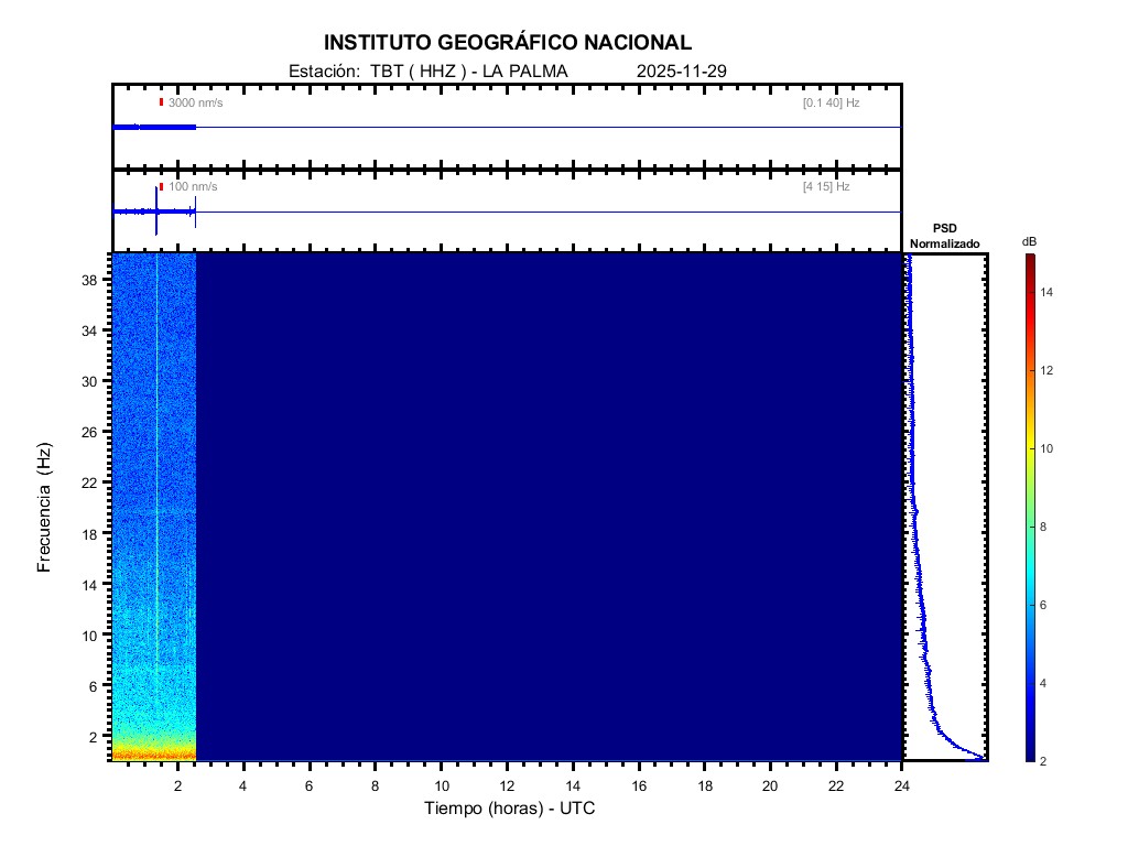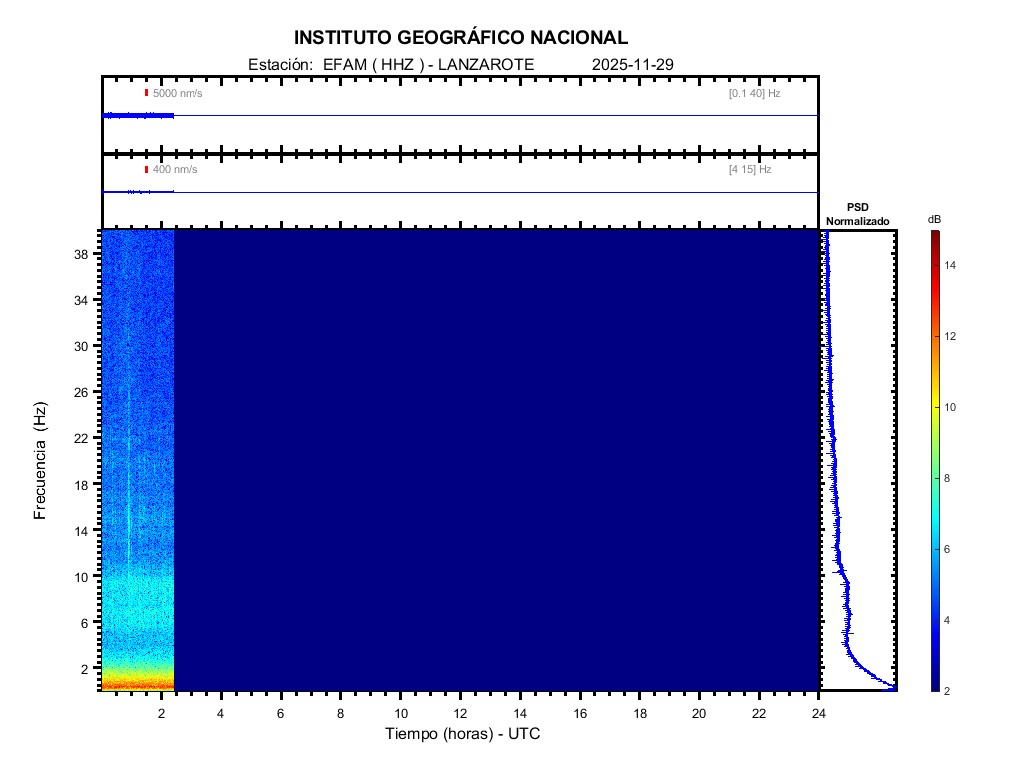 | 2025-11-29 | Forma de Onda (Filtro banda ancha) | Forma de Onda (Filtro corto periodo) | Espectrograma ([0 40] Hz) | Espectrograma ([0 15] Hz) | ||