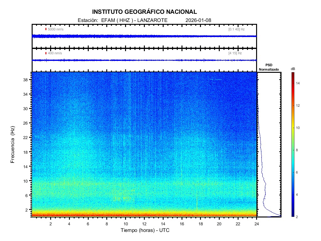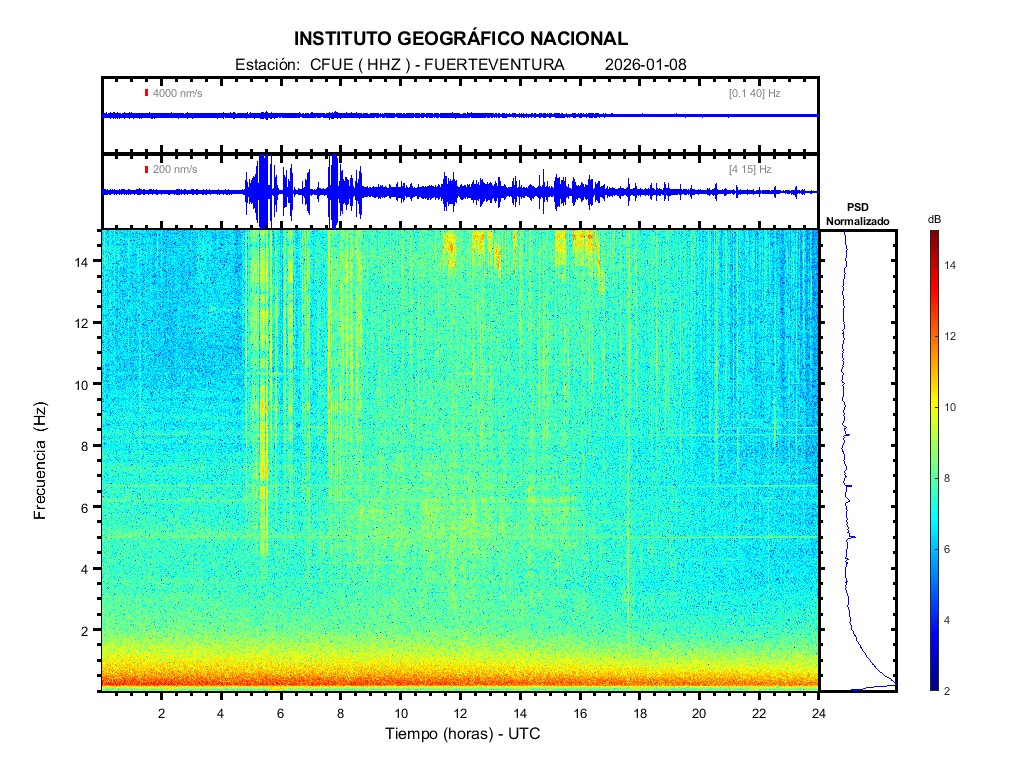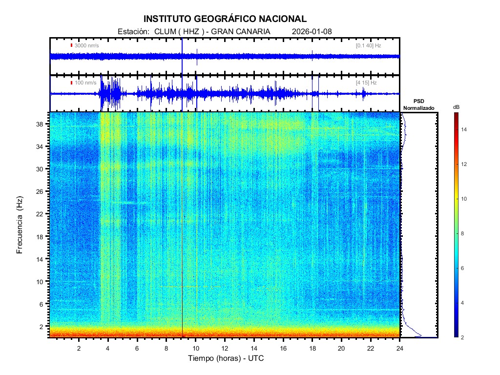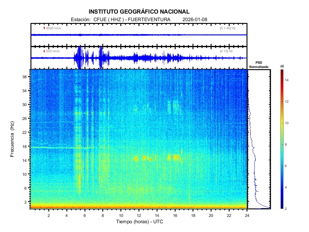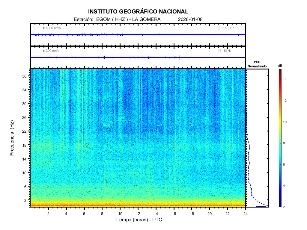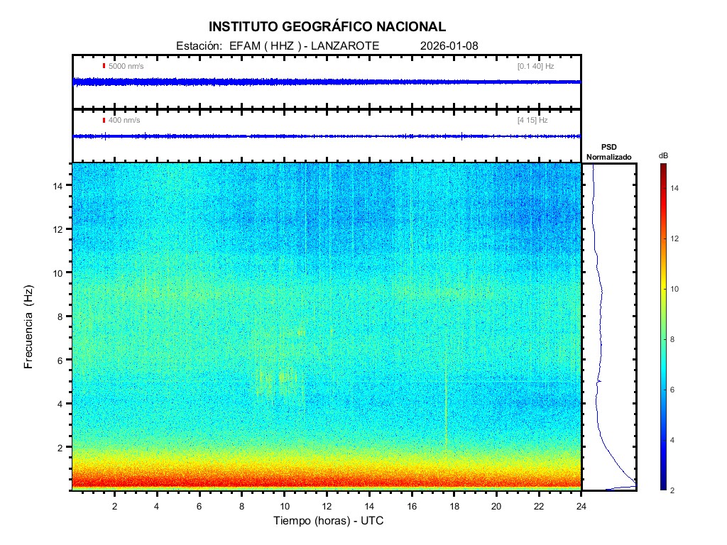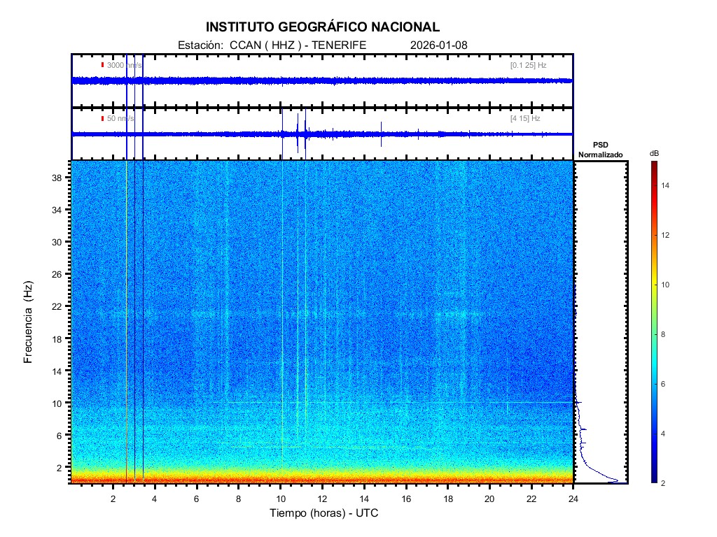 | 2026-01-08 | Forma de Onda (Filtro banda ancha) | Forma de Onda (Filtro corto periodo) | Espectrograma ([0 40] Hz) | Espectrograma ([0 15] Hz) | ||