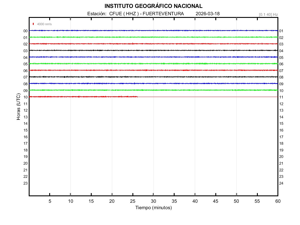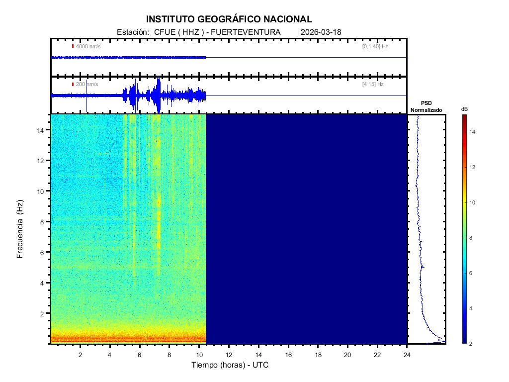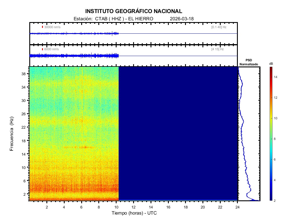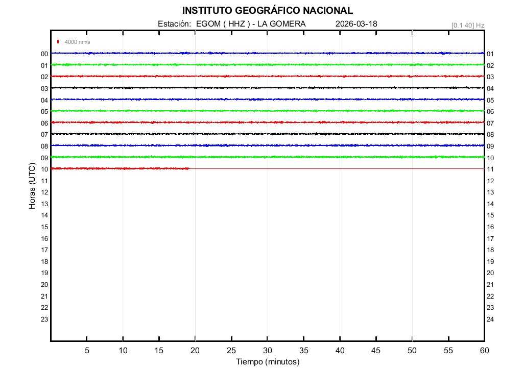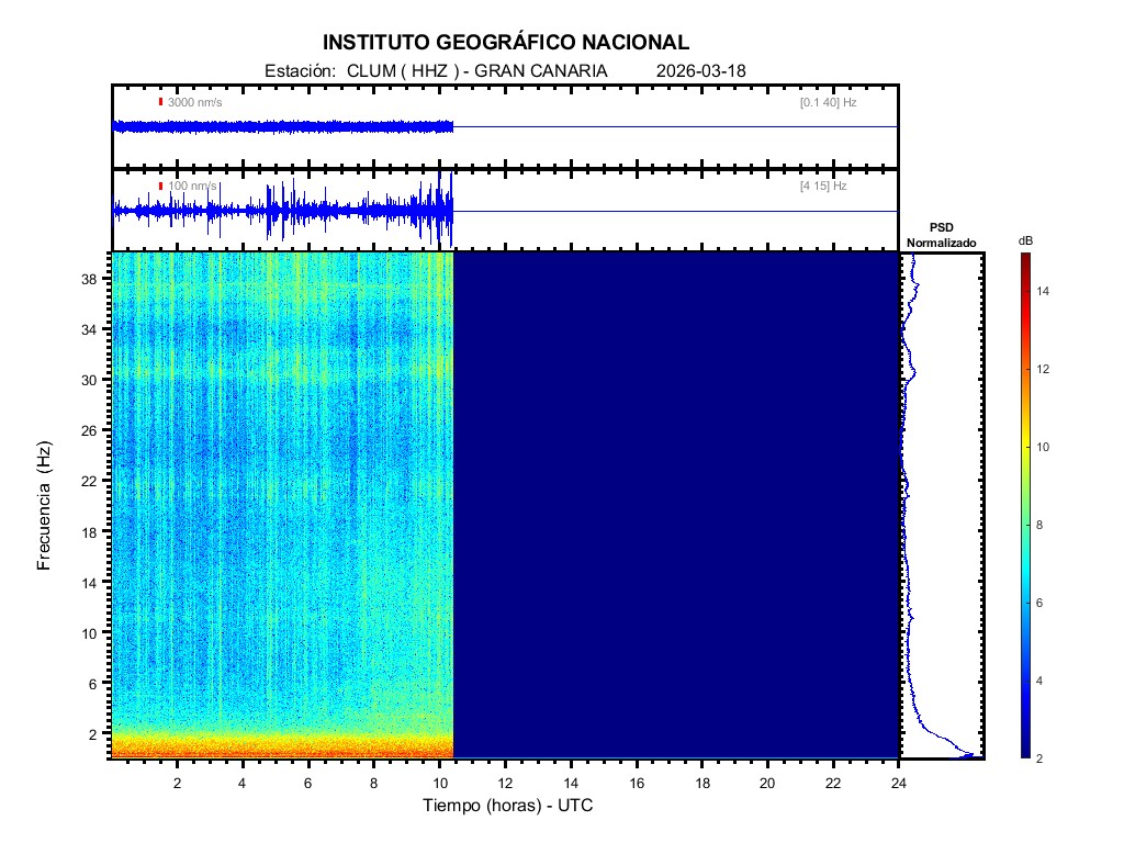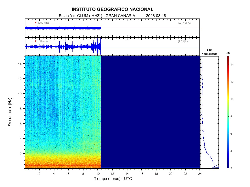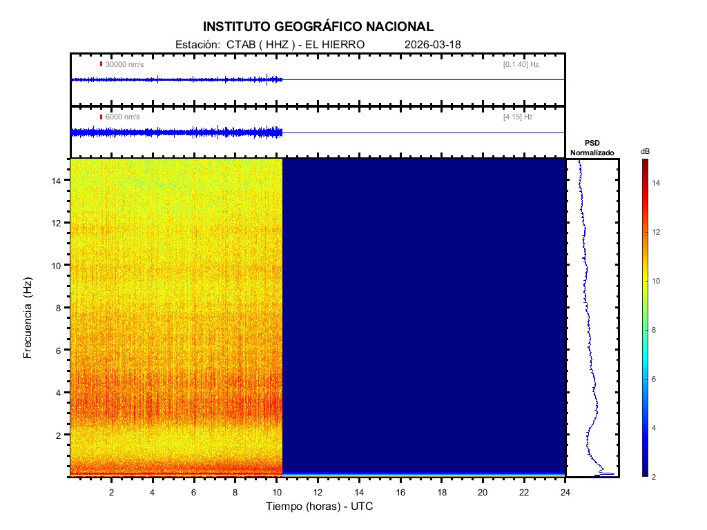 | 2026-03-18 | Forma de Onda (Filtro banda ancha) | Forma de Onda (Filtro corto periodo) | Espectrograma ([0 40] Hz) | Espectrograma ([0 15] Hz) | ||