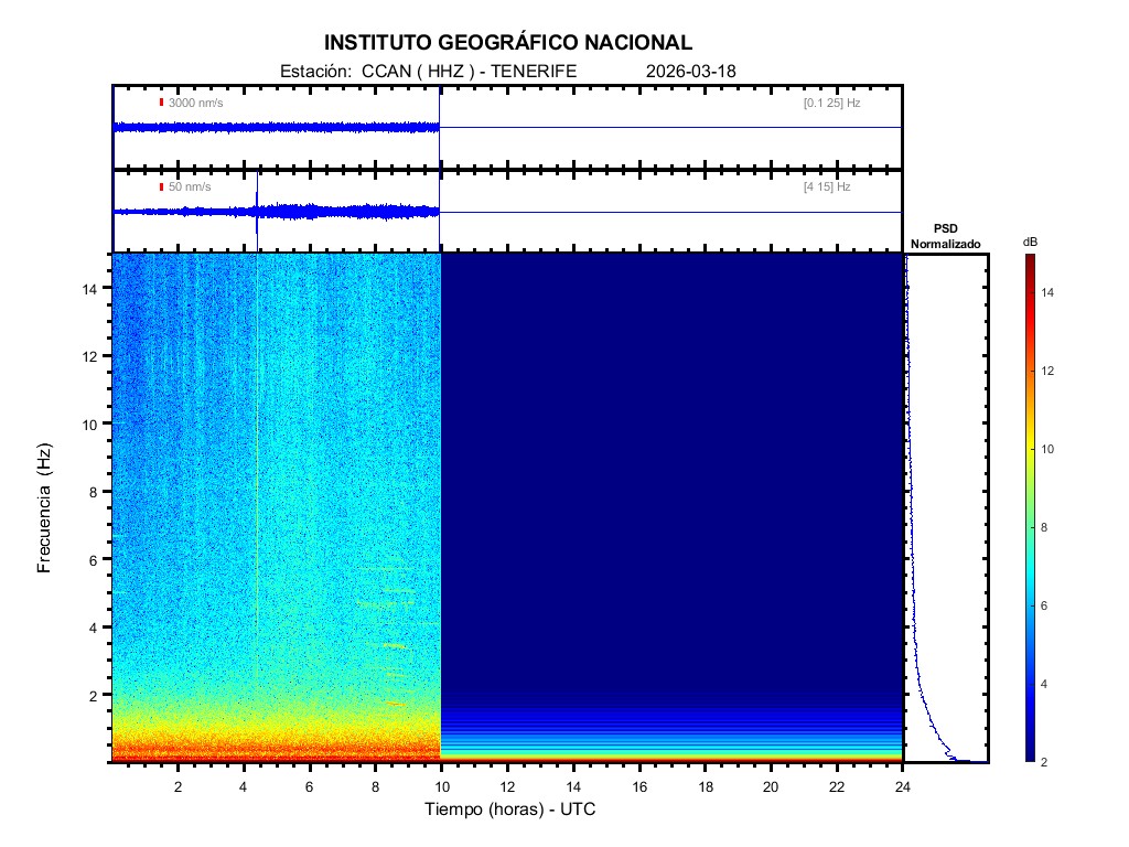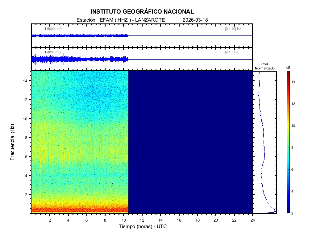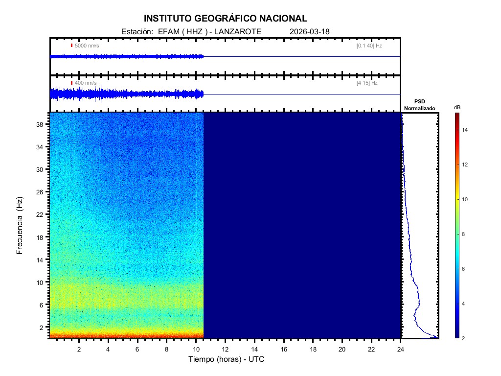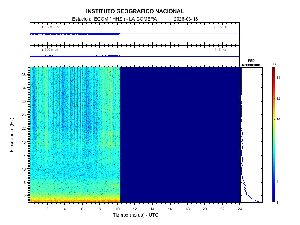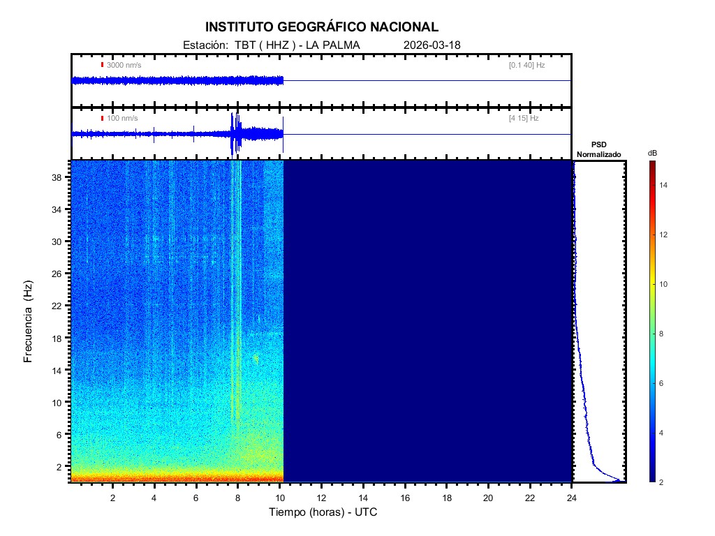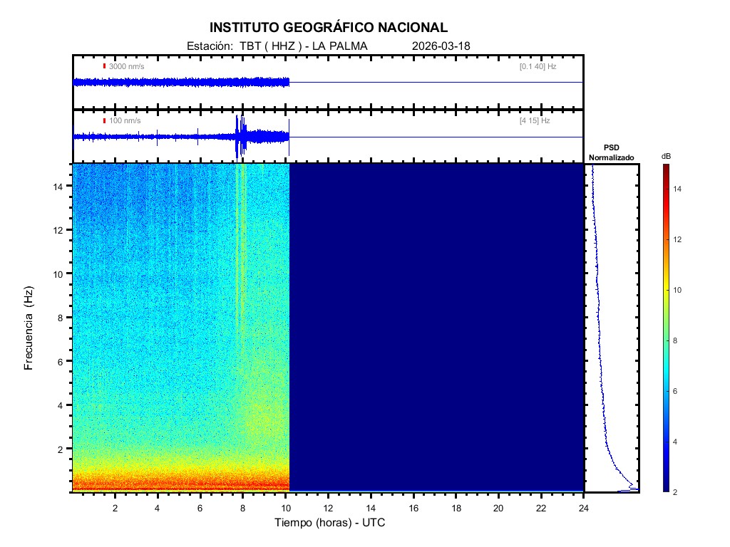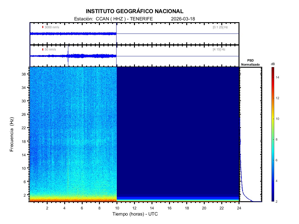 | 2026-03-18 | Forma de Onda (Filtro banda ancha) | Forma de Onda (Filtro corto periodo) | Espectrograma ([0 40] Hz) | Espectrograma ([0 15] Hz) | ||