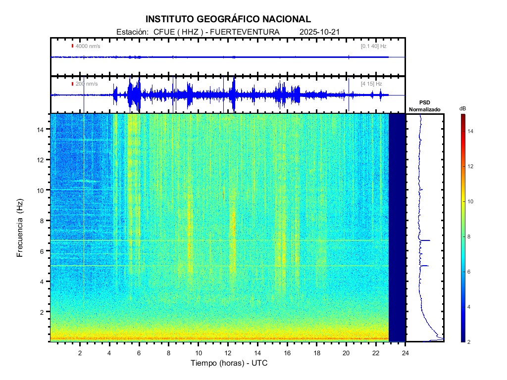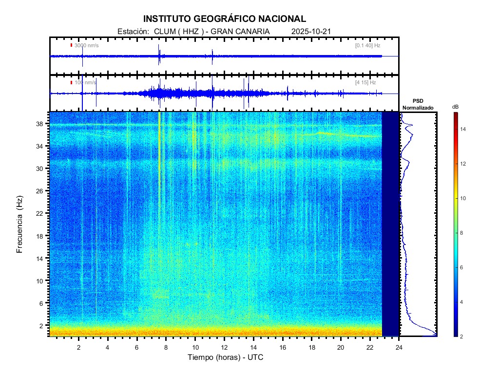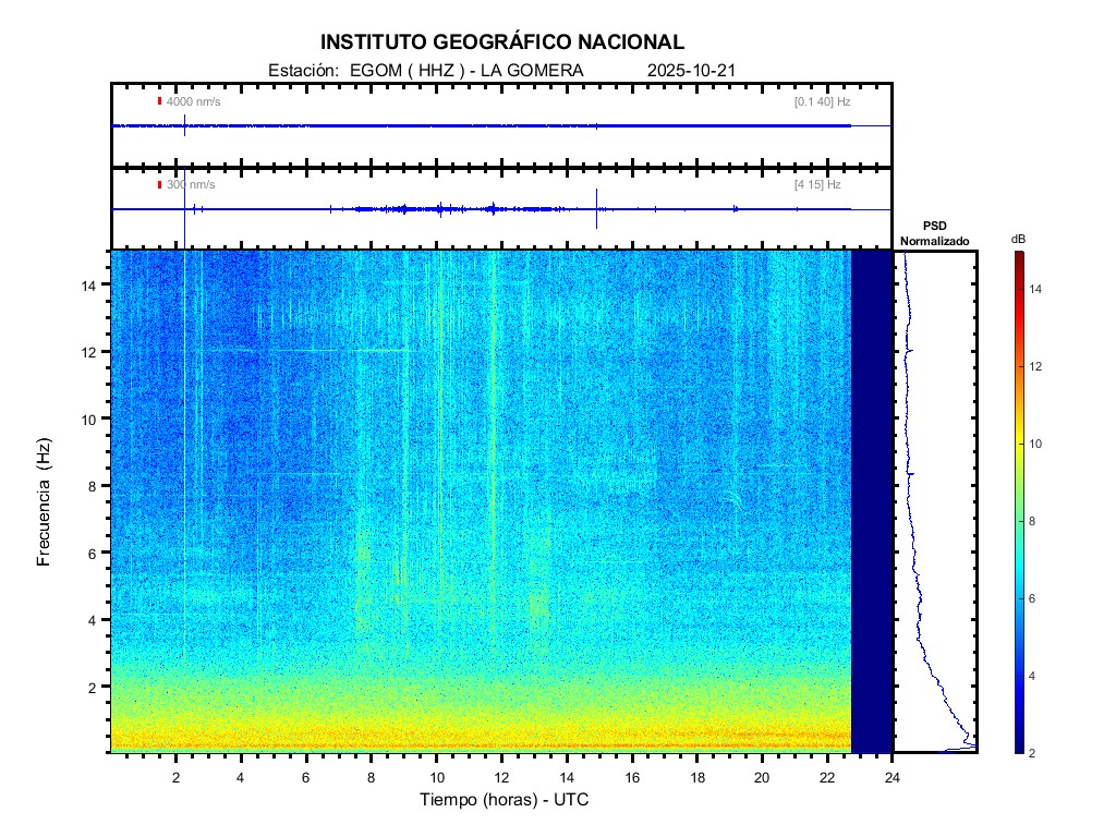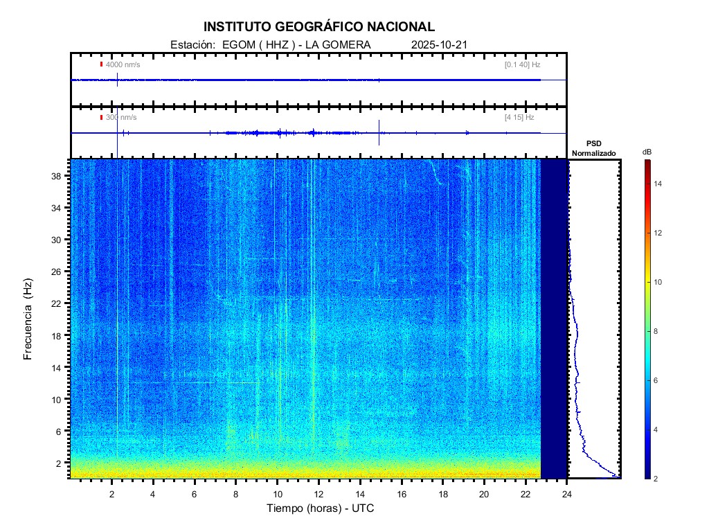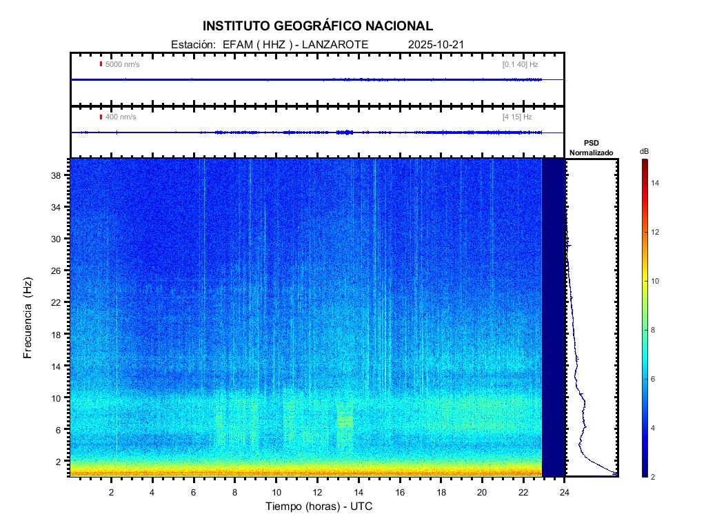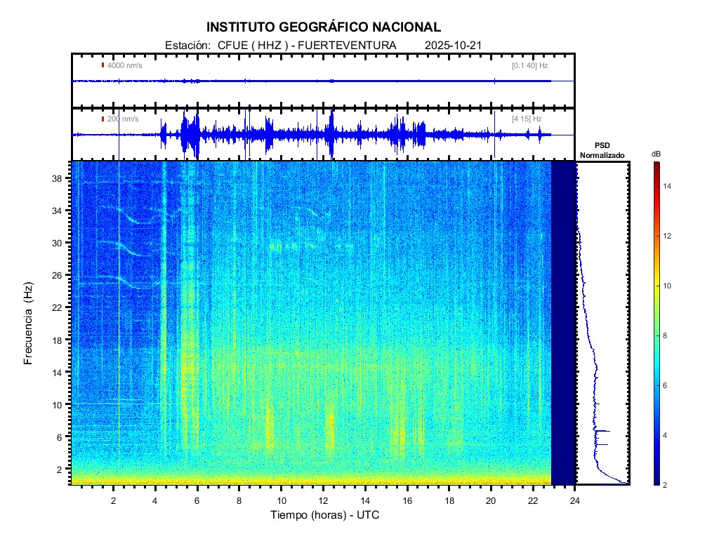 2025-10-21 | Forma de Onda (Filtro banda ancha) | Forma de Onda (Filtro corto periodo) | Espectrograma ([0 40] Hz) | Espectrograma ([0 15] Hz) | ||