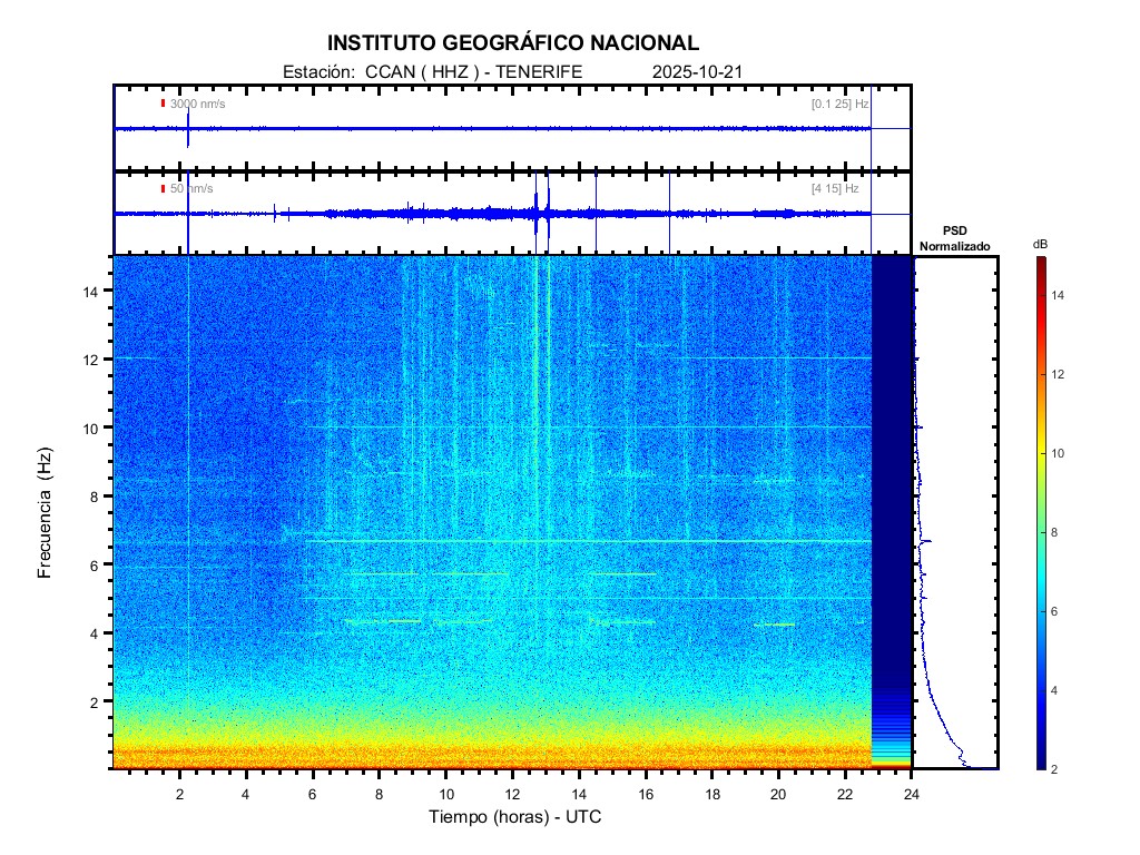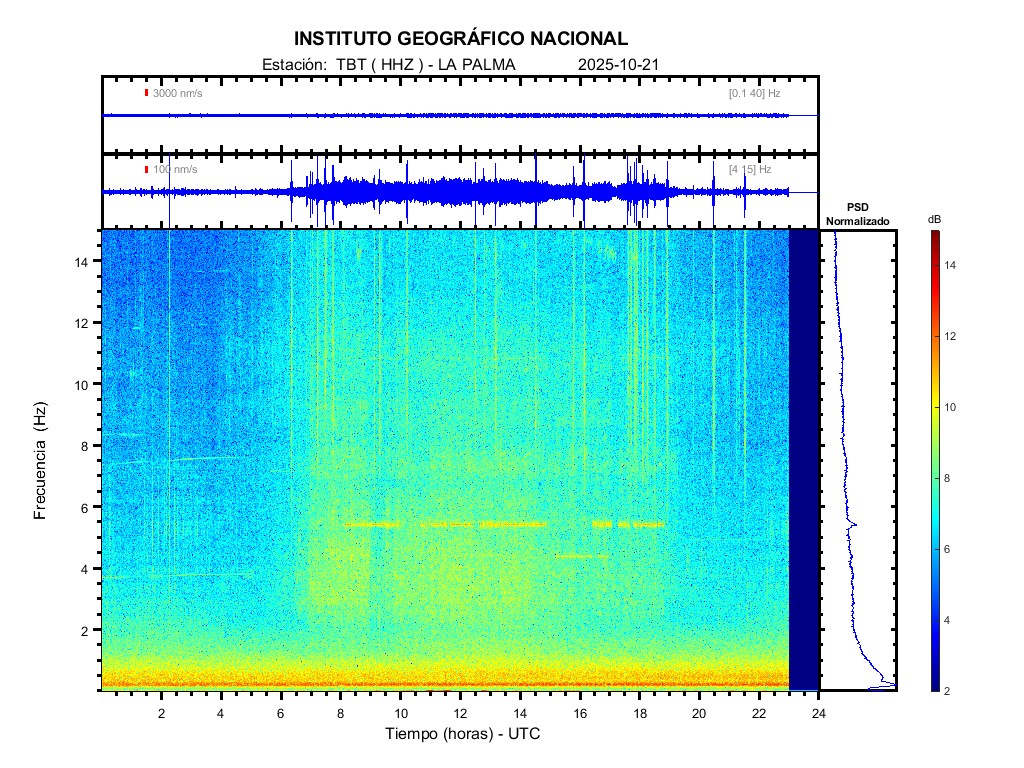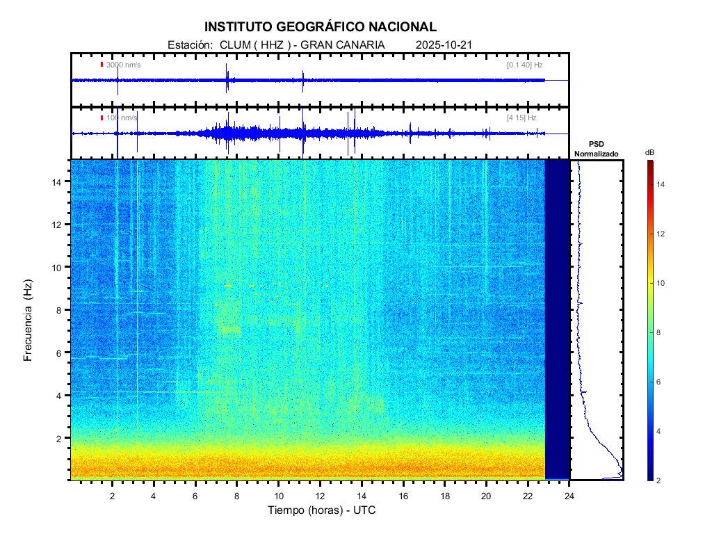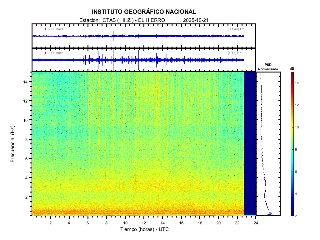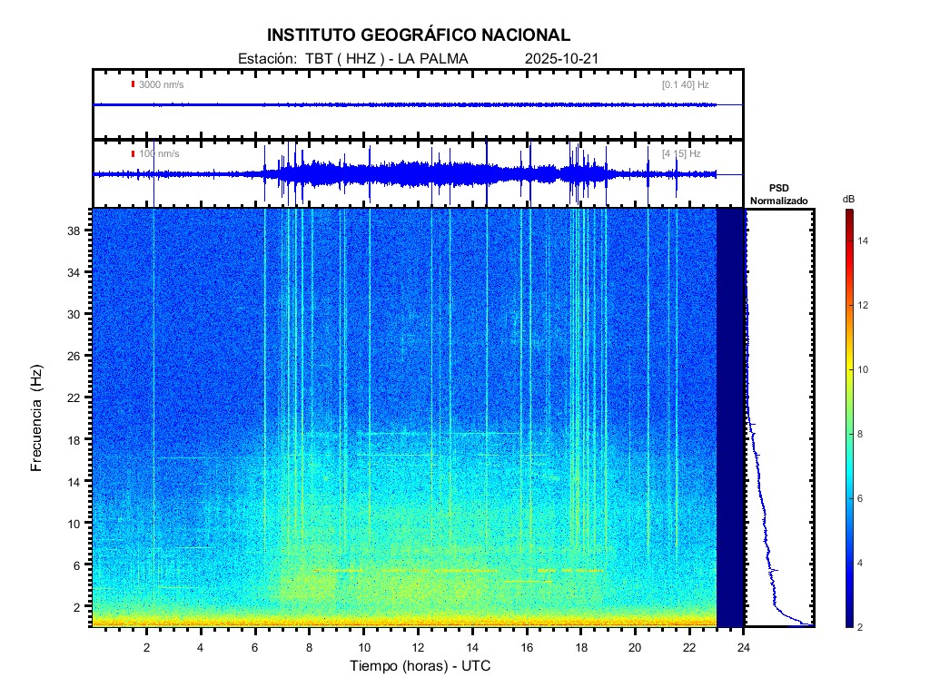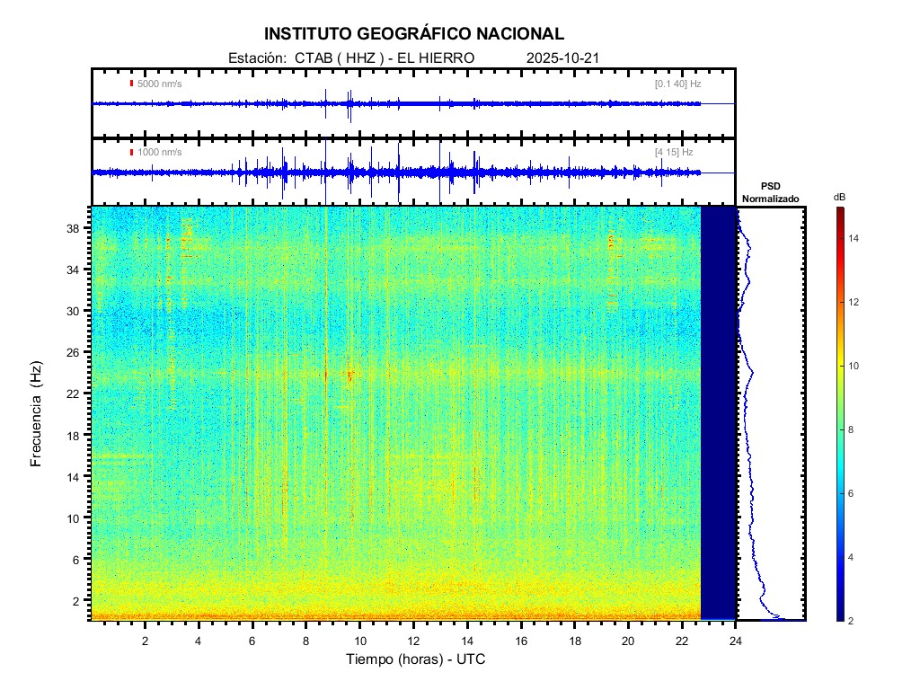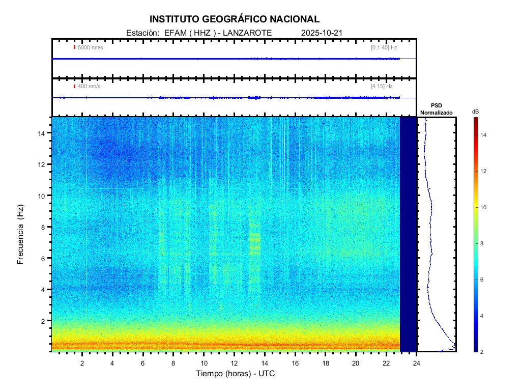 2025-10-21 | Forma de Onda (Filtro banda ancha) | Forma de Onda (Filtro corto periodo) | Espectrograma ([0 40] Hz) | Espectrograma ([0 15] Hz) | ||
