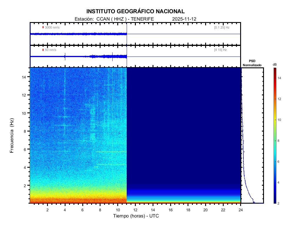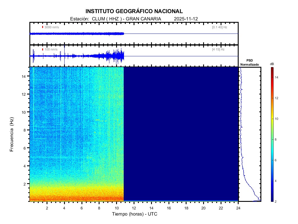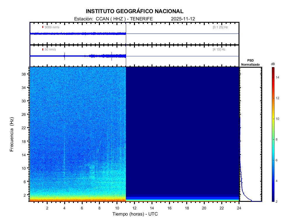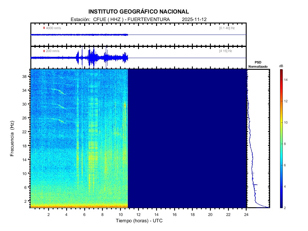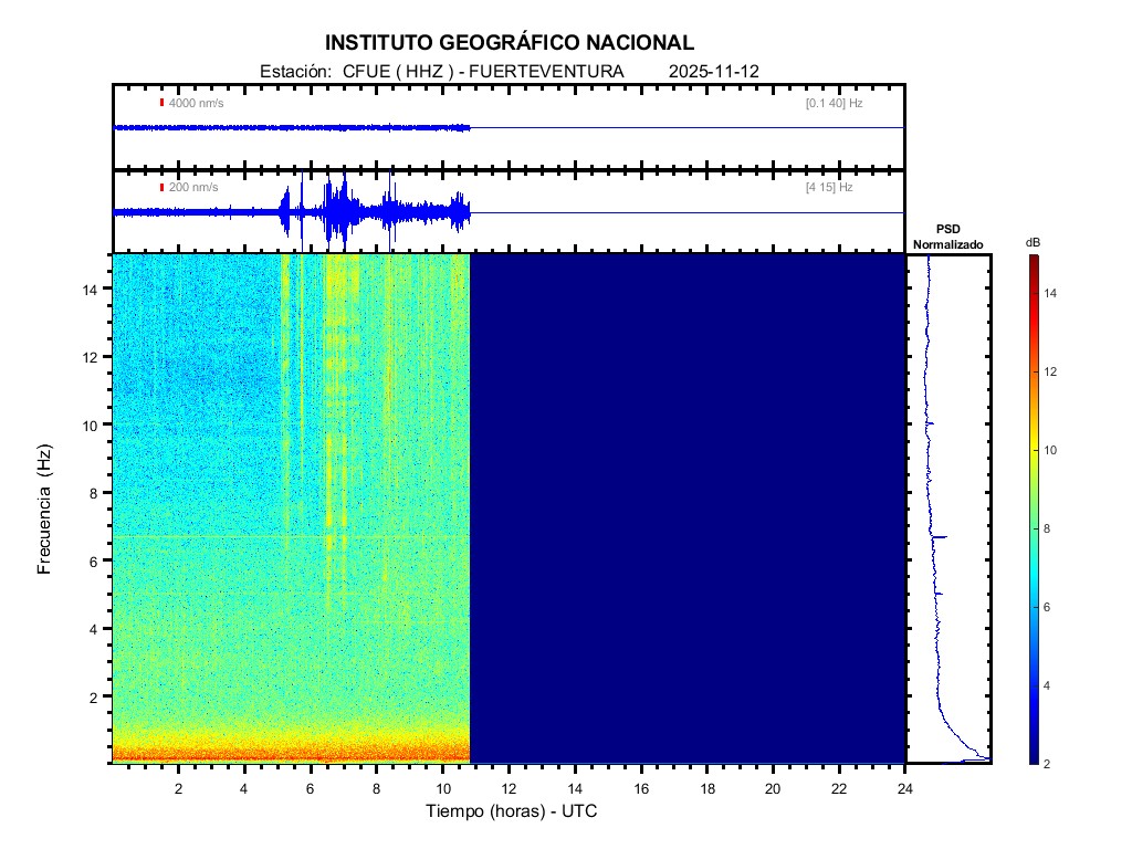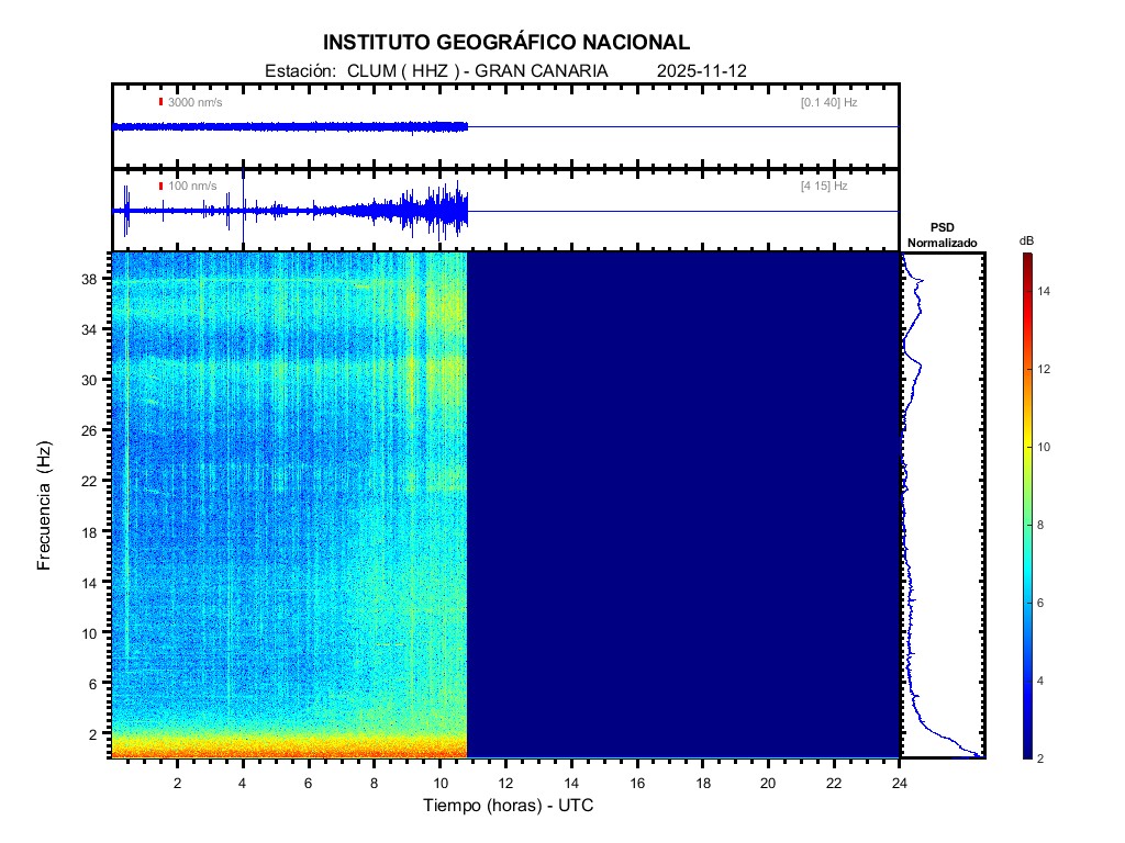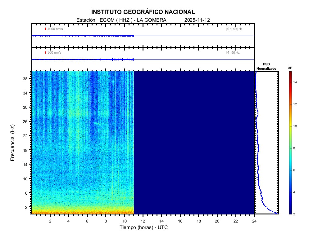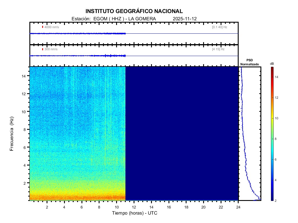| 2025-11-12 | Forma de Onda (Filtro banda ancha) | Forma de Onda (Filtro corto periodo) | Espectrograma ([0 40] Hz) | Espectrograma ([0 15] Hz) | ||