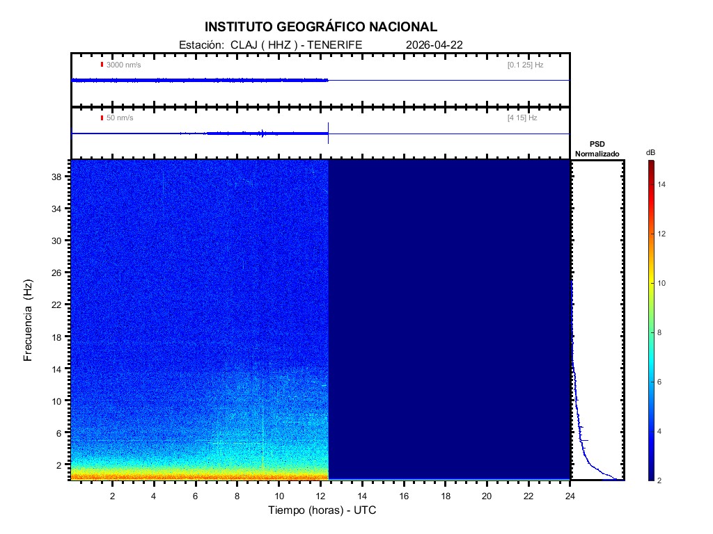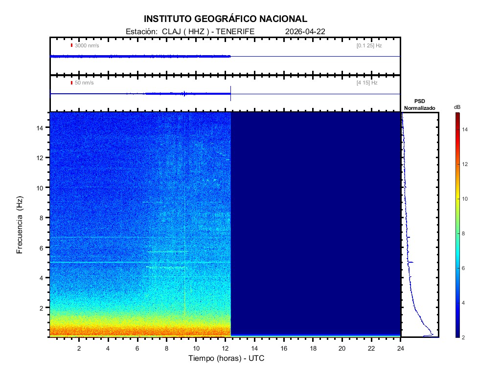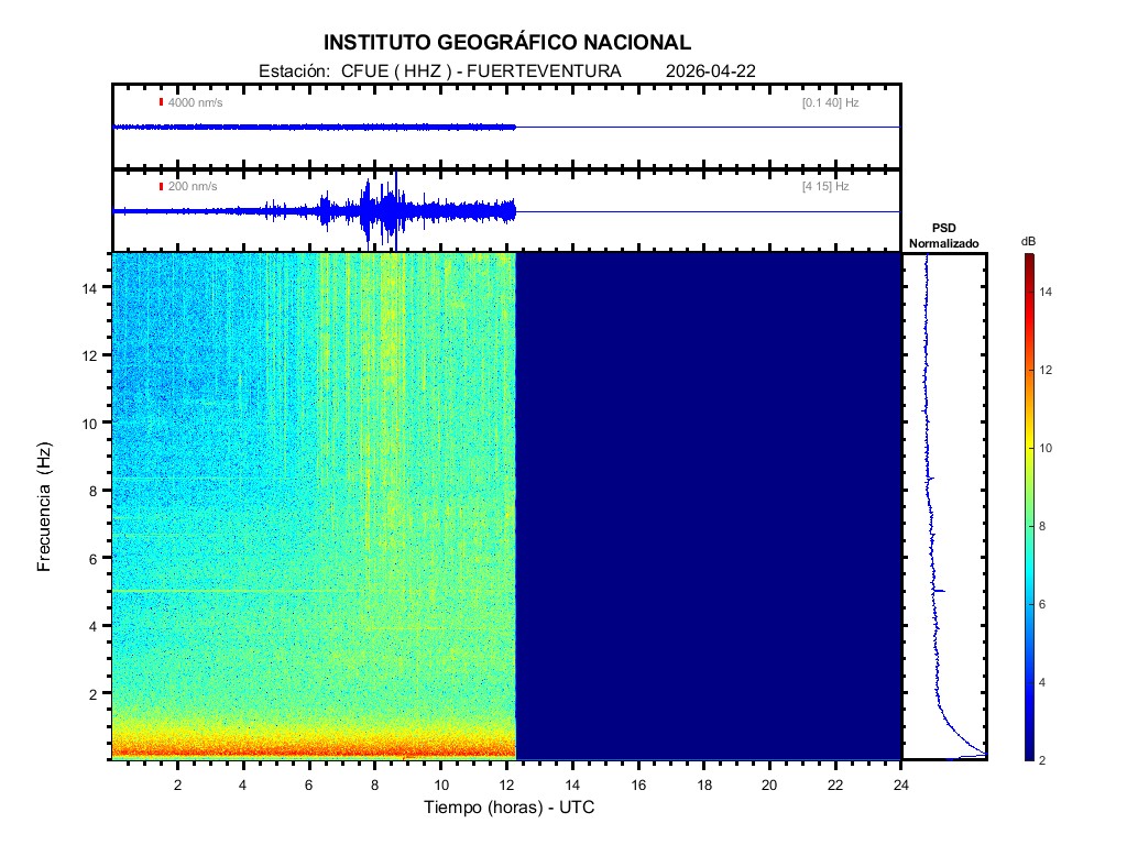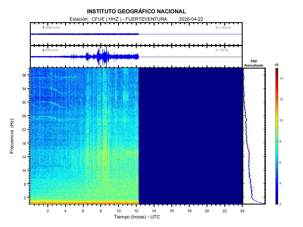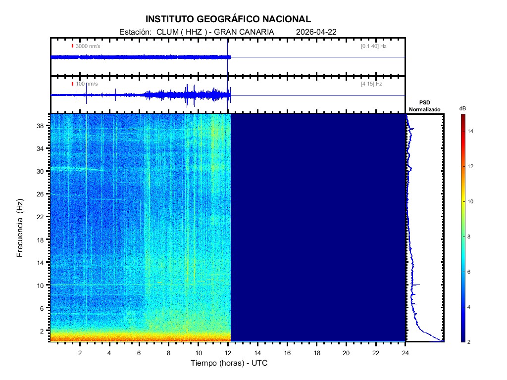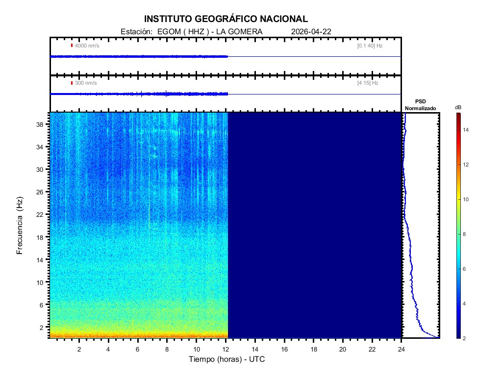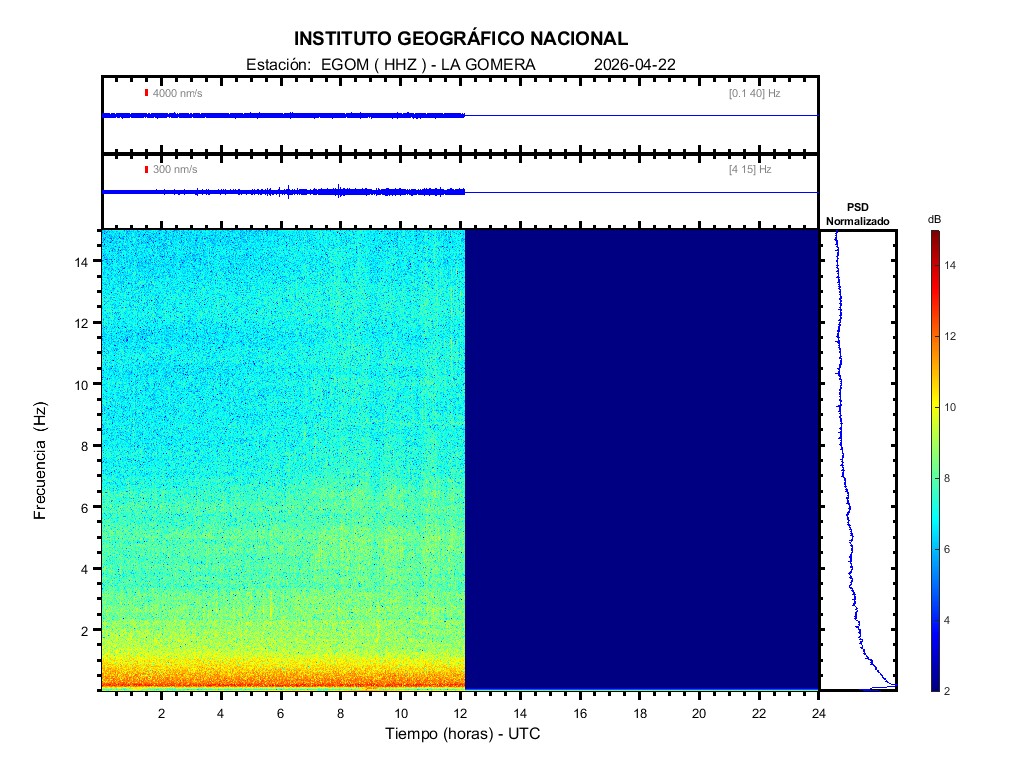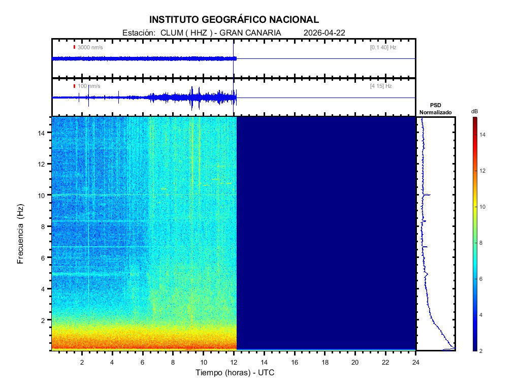 | 2026-04-22 | Forma de Onda (Filtro banda ancha) | Forma de Onda (Filtro corto periodo) | Espectrograma ([0 40] Hz) | Espectrograma ([0 15] Hz) | ||