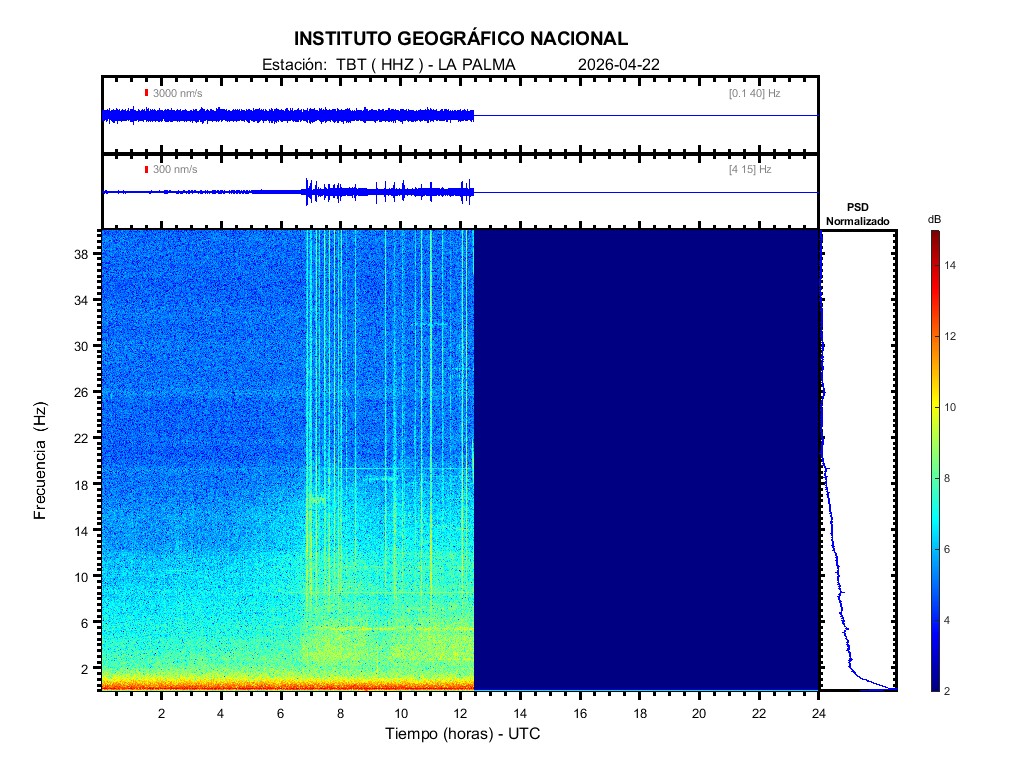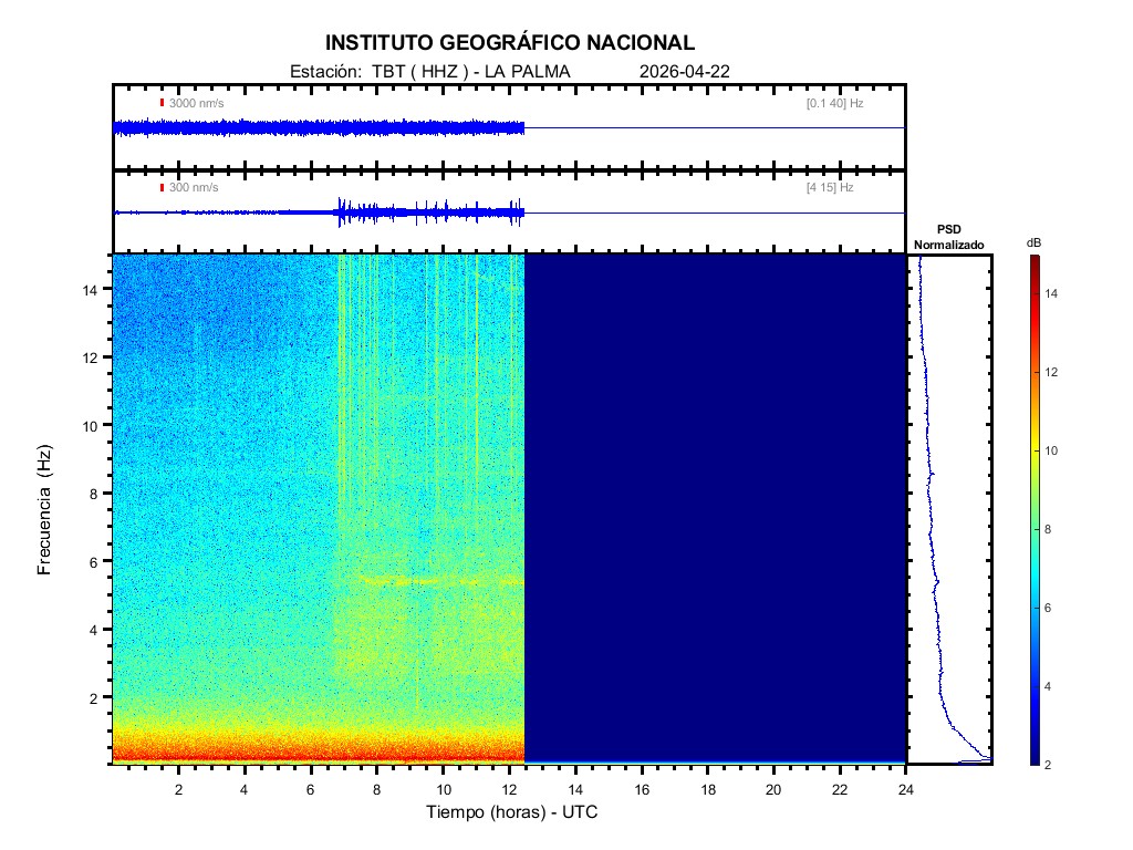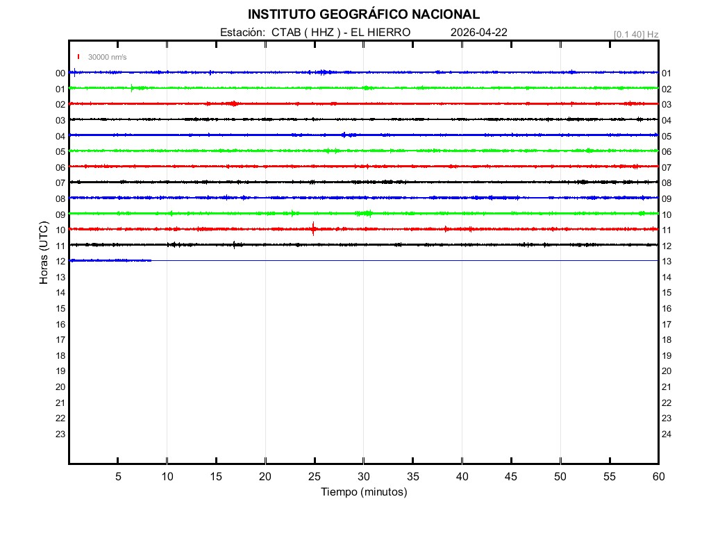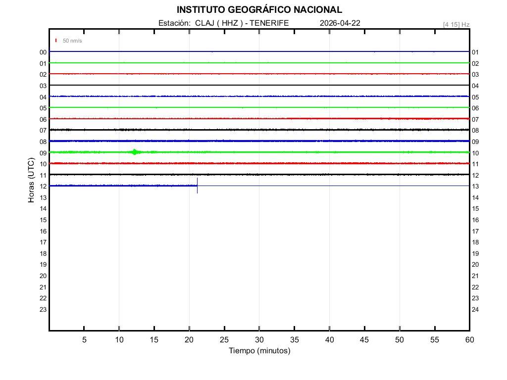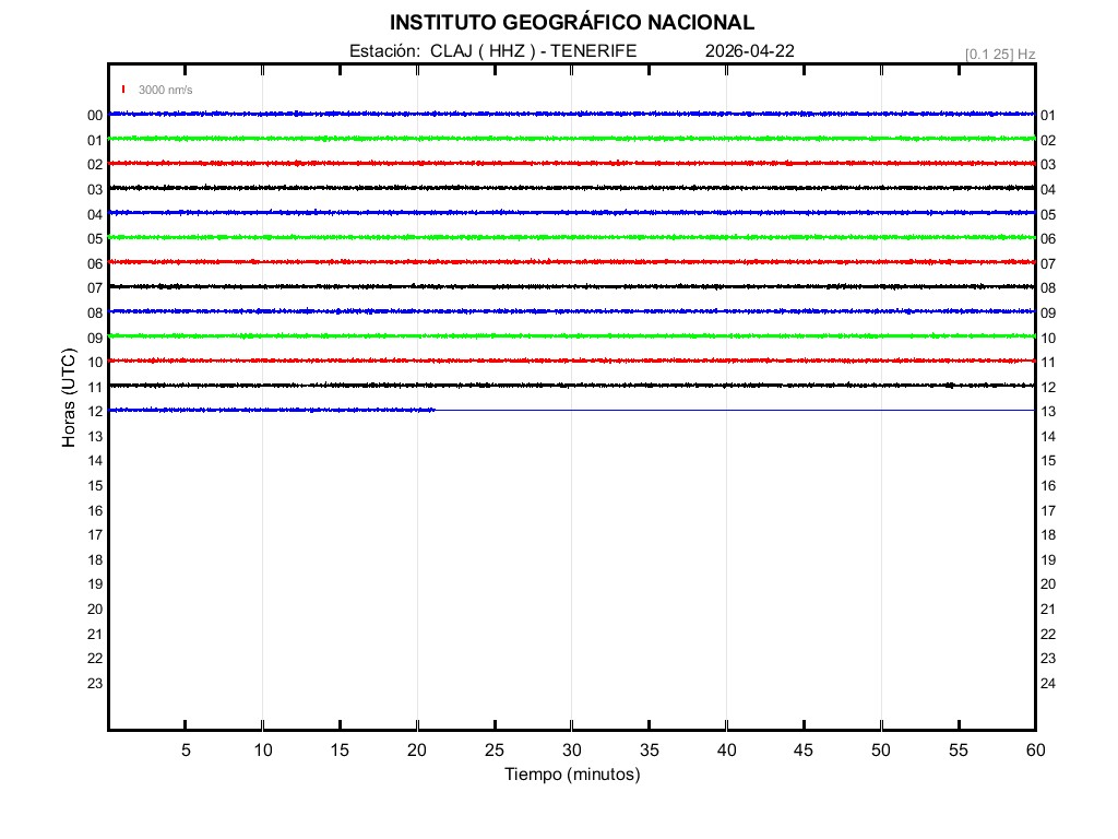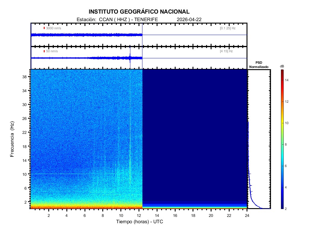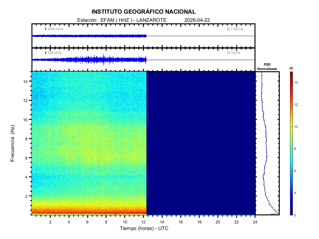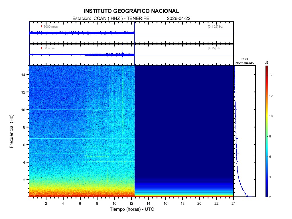 | 2026-04-22 | Forma de Onda (Filtro banda ancha) | Forma de Onda (Filtro corto periodo) | Espectrograma ([0 40] Hz) | Espectrograma ([0 15] Hz) | ||